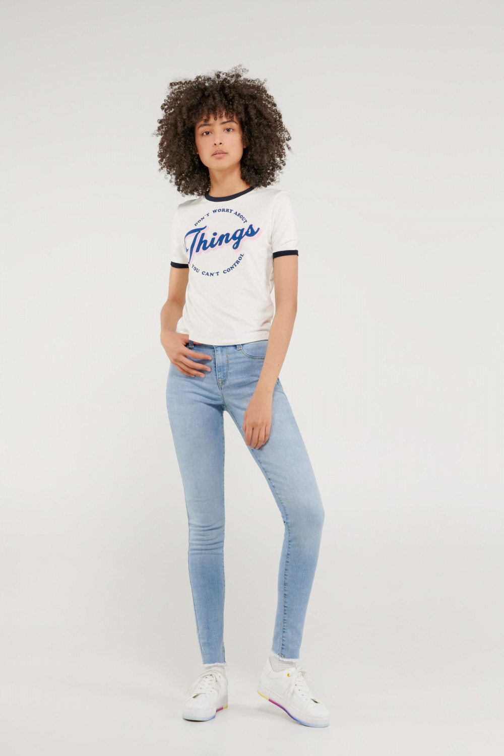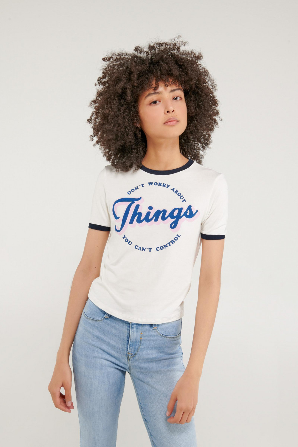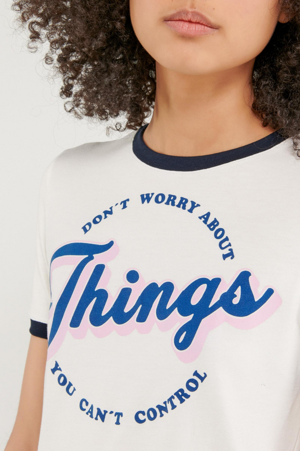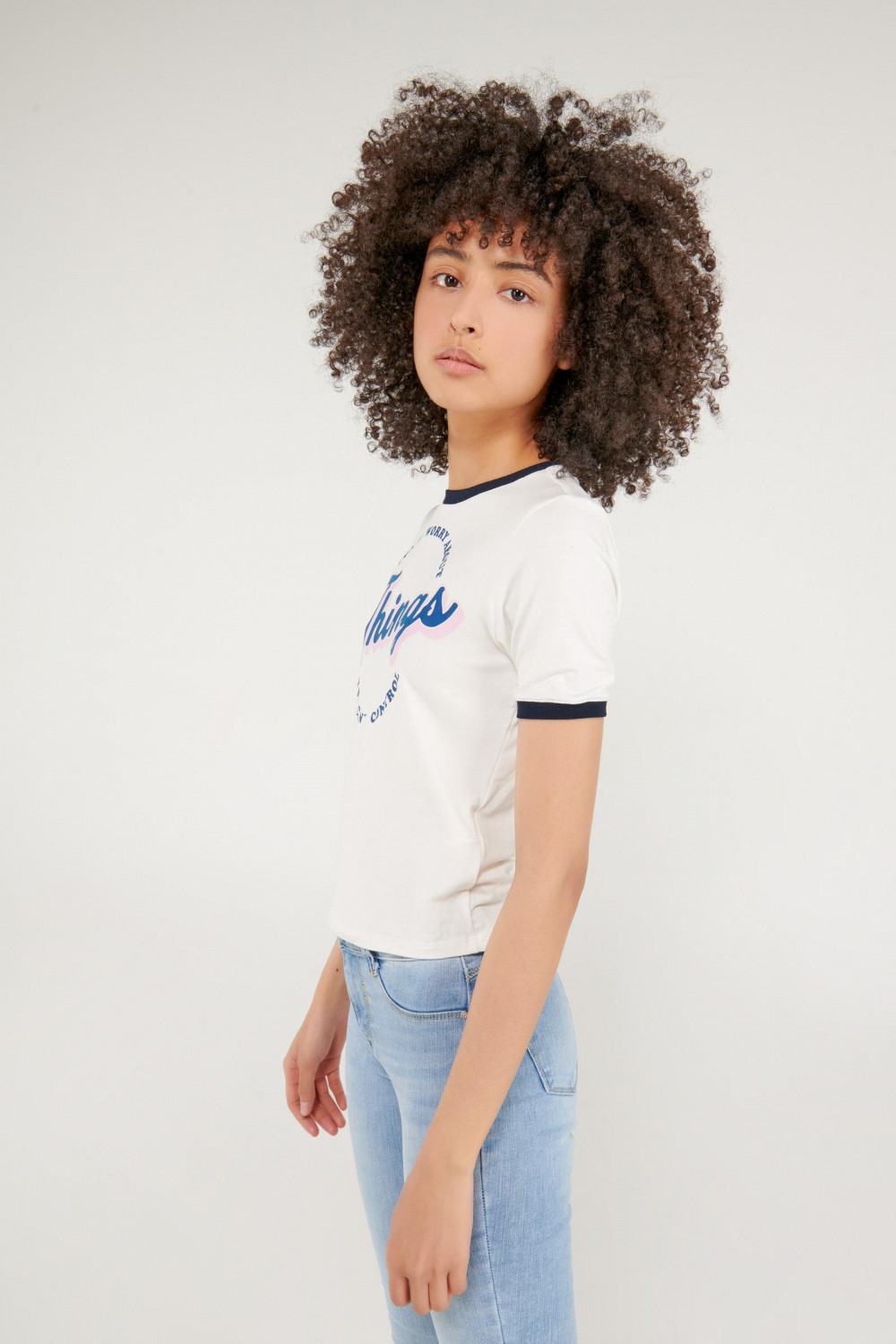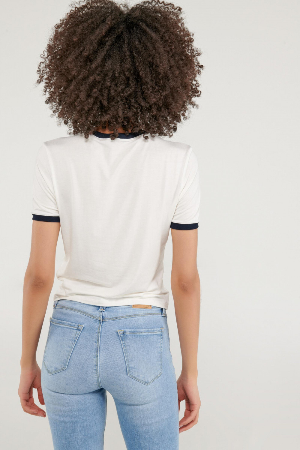 Camiseta cuello redondo para mujer, manga corta con puño en contraste, con estampado