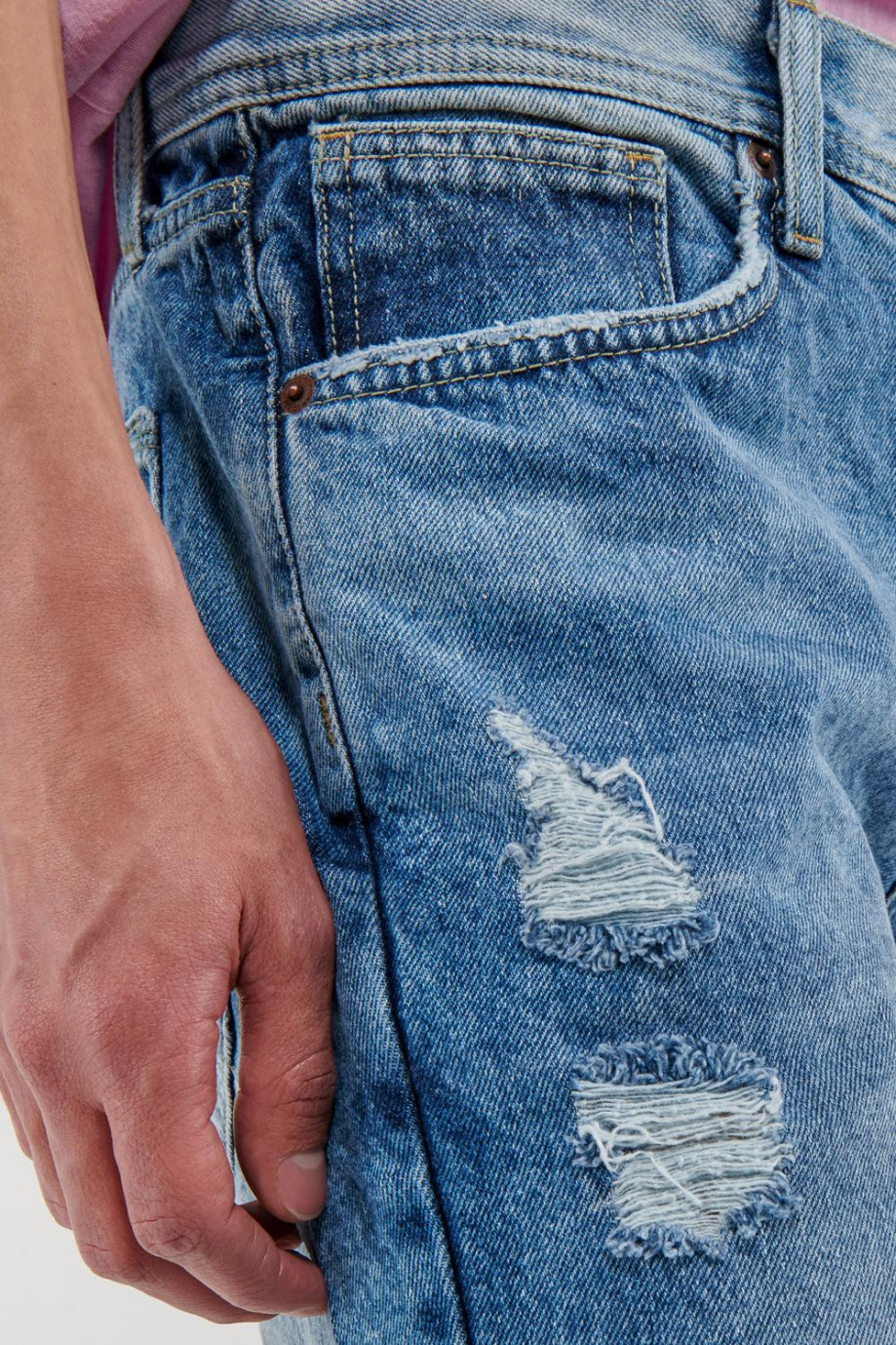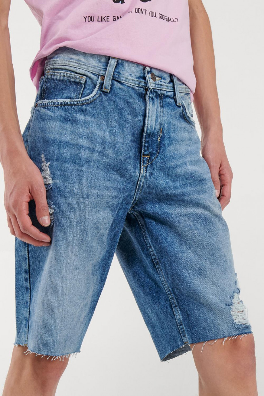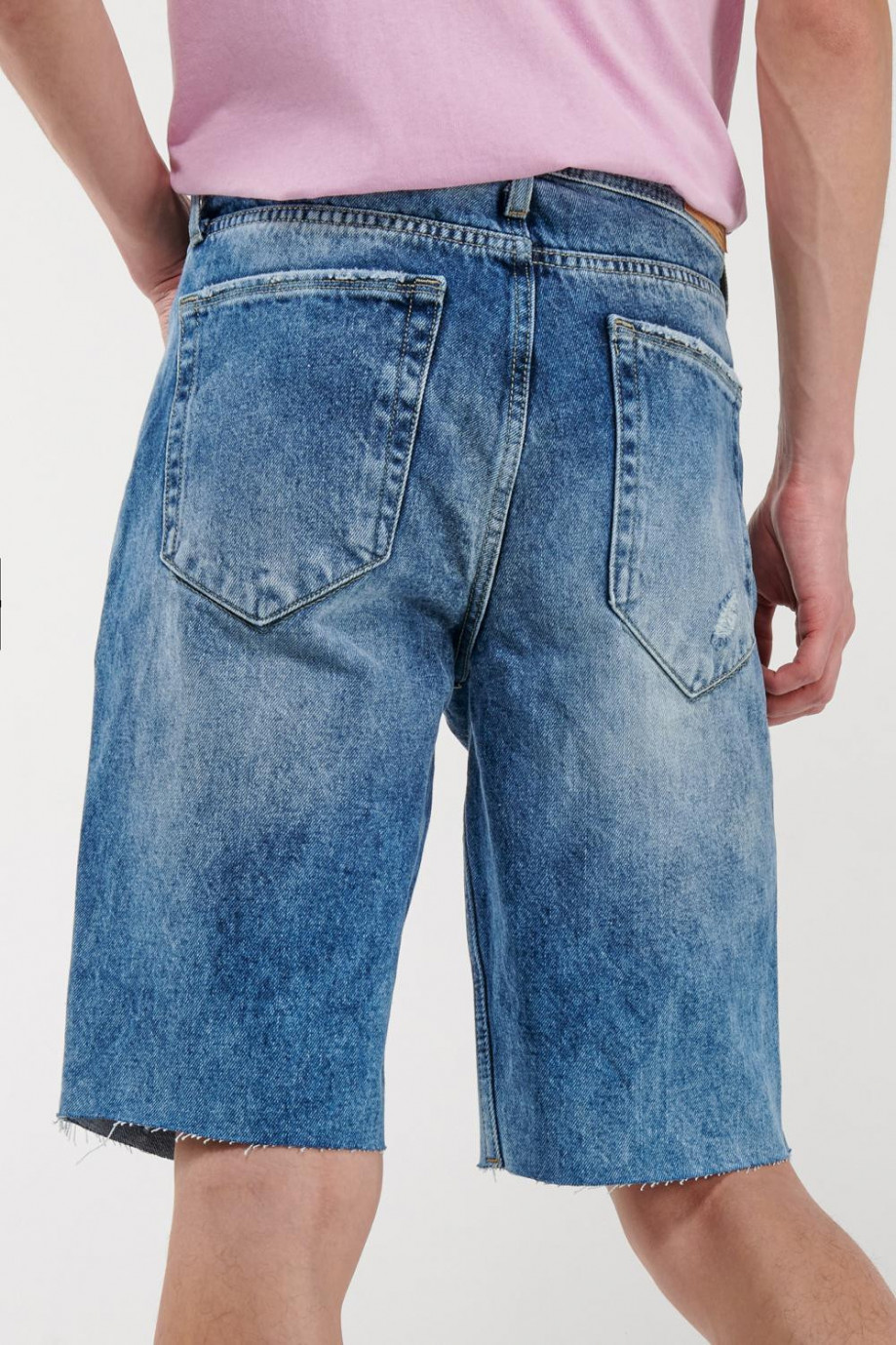 Bermuda para hombre, 5 bolsillos, tiro bajo, con lavado medio y rotos.