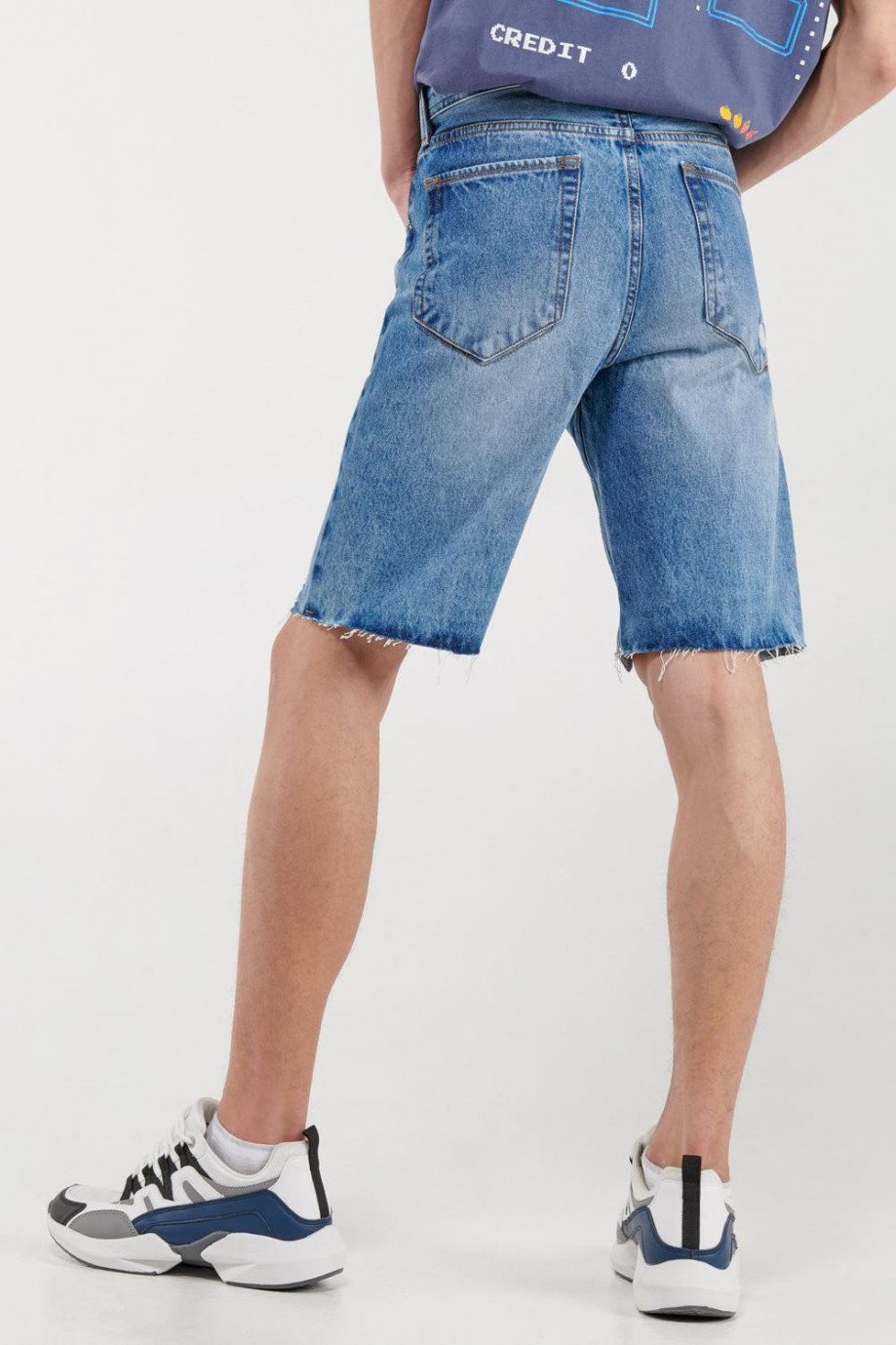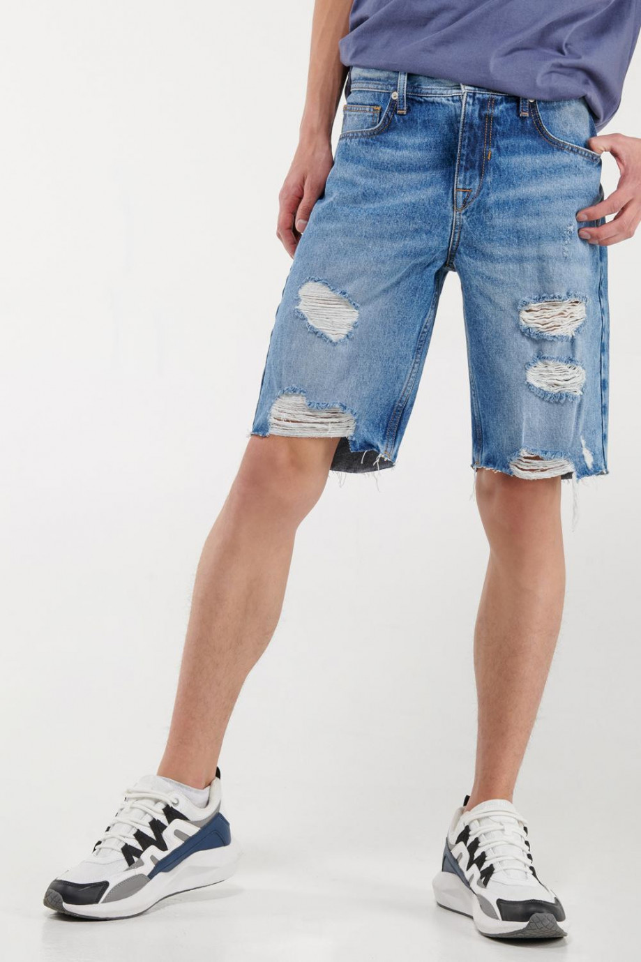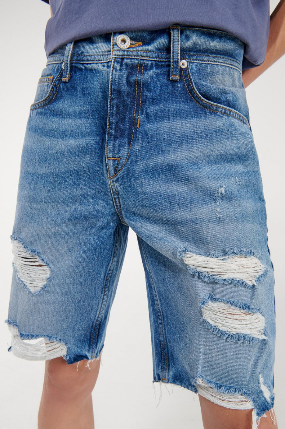 Bermuda para hombre, 5 bolsillos, tiro bajo, con lavado claro y rotos.