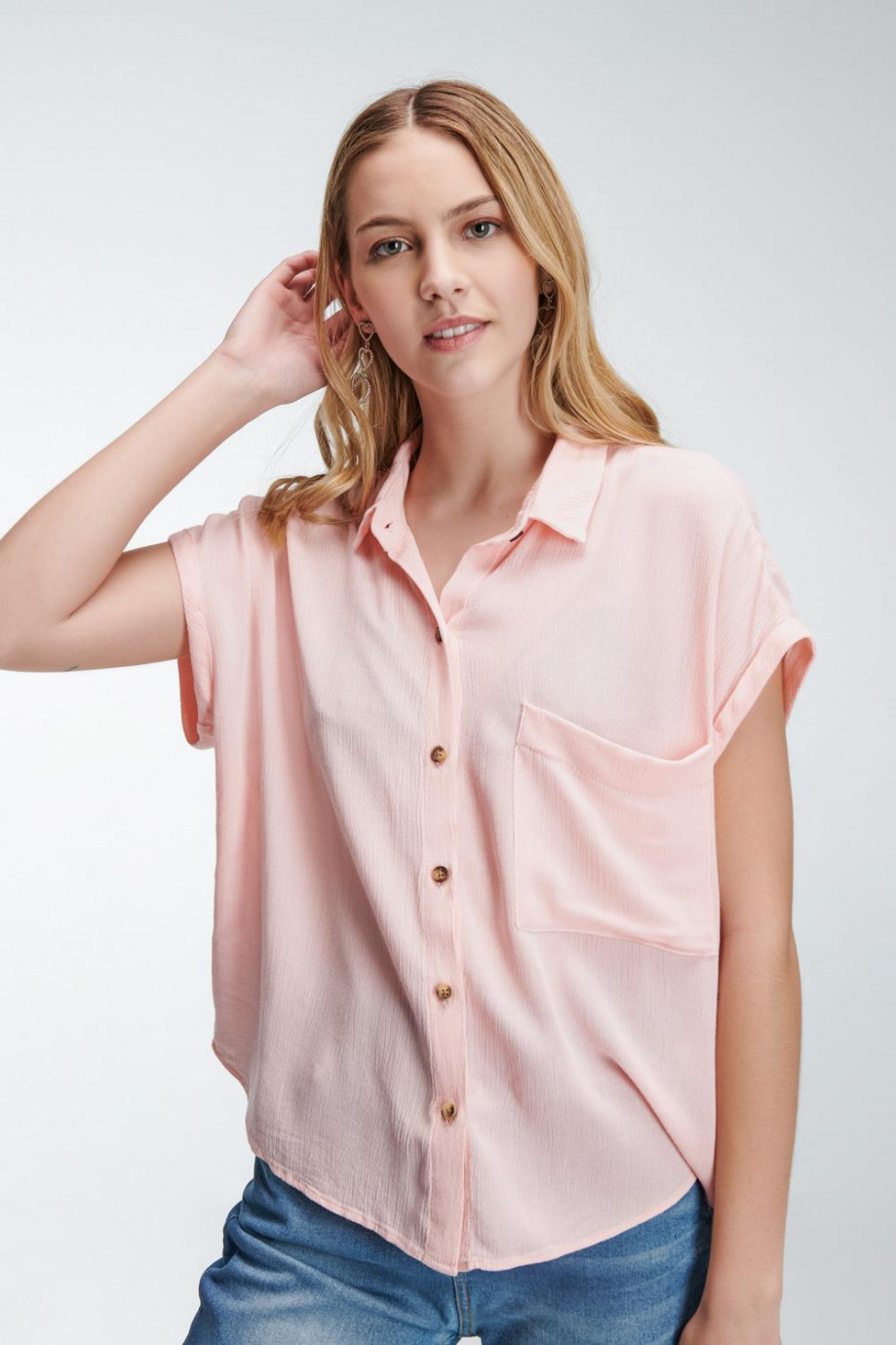 Blusa en tela fluida unicolor, manga corta cuello camisero silueta oversize.