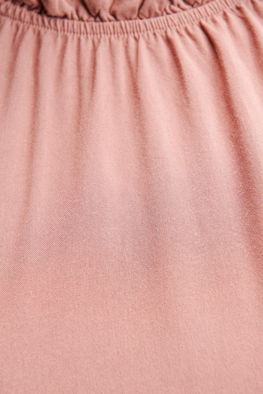 Blusa con pieza recogida en cuello, manga corta con recogido y cordón para anudar.