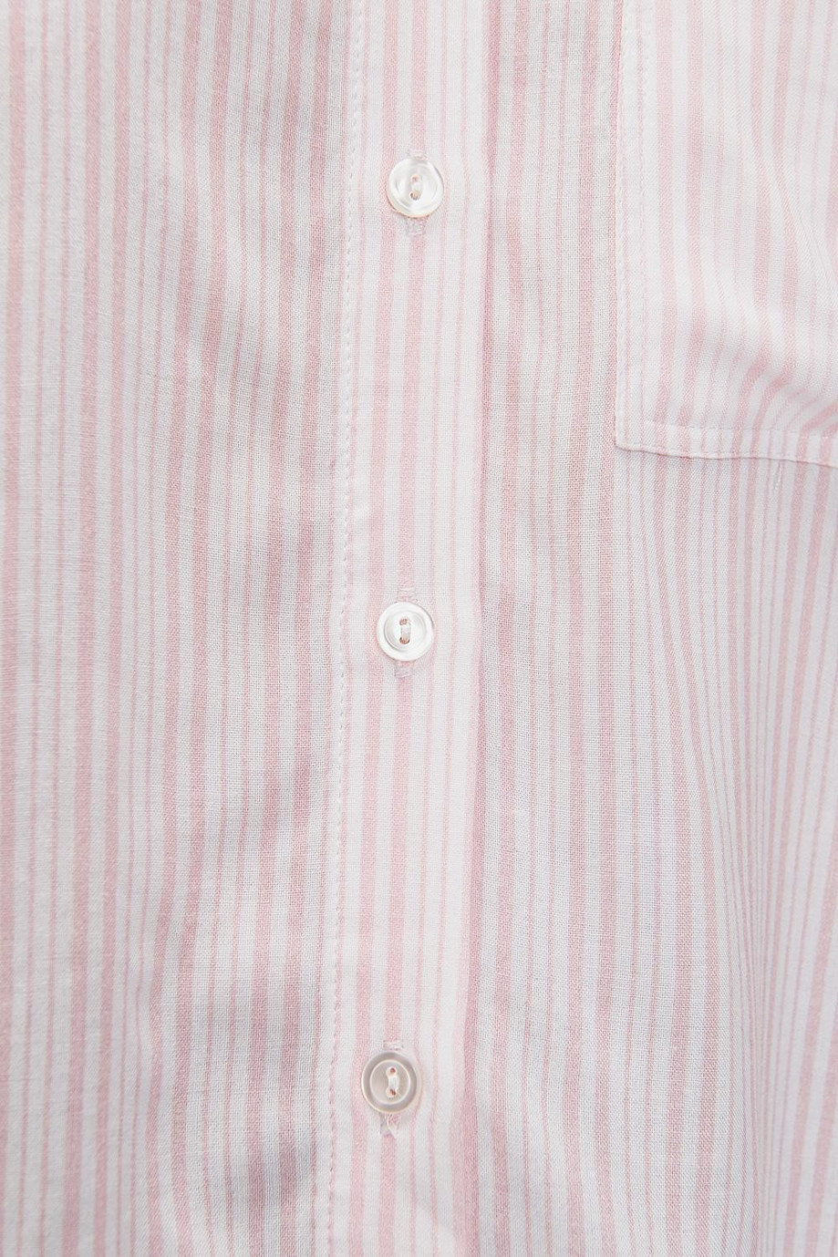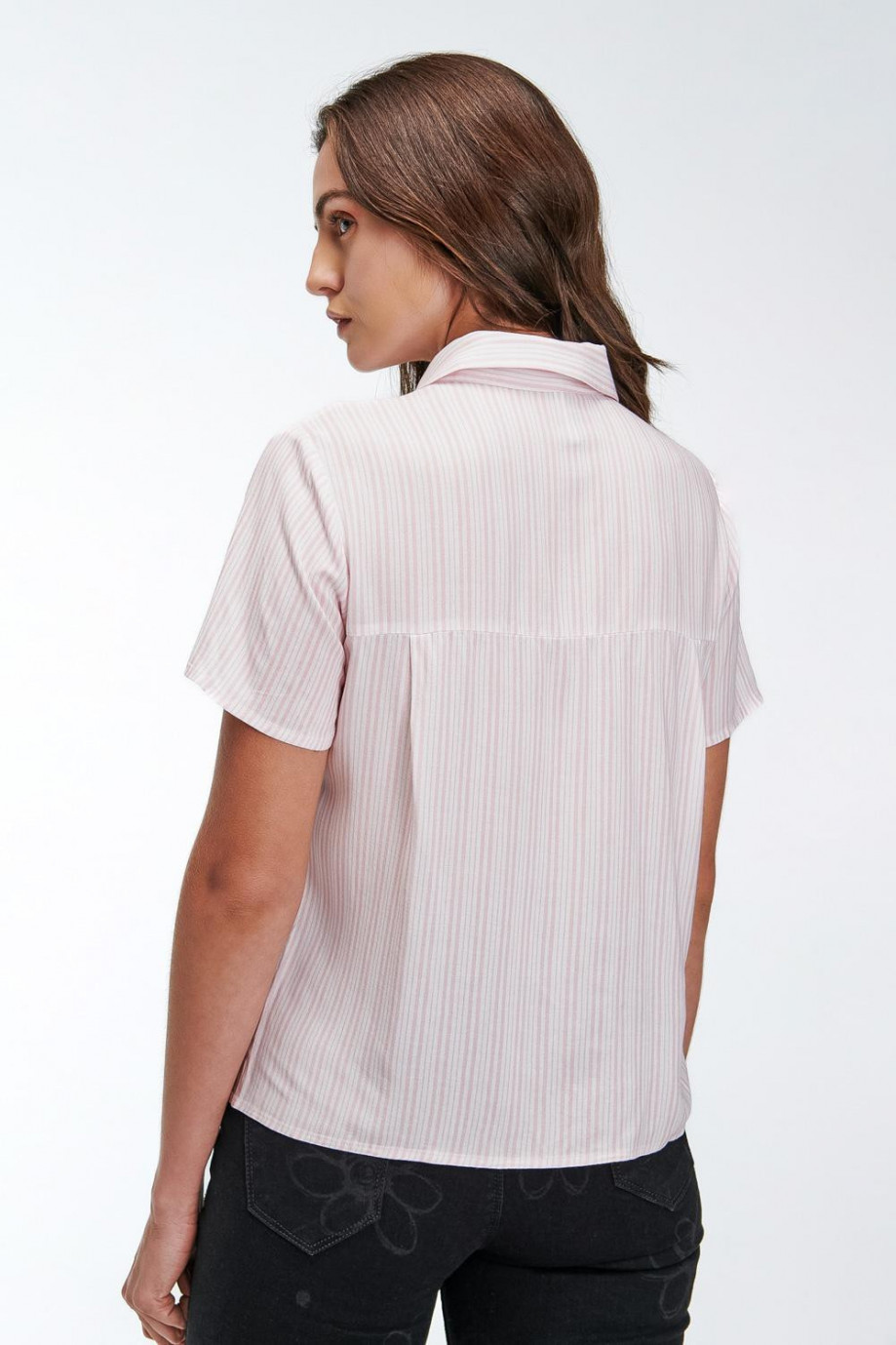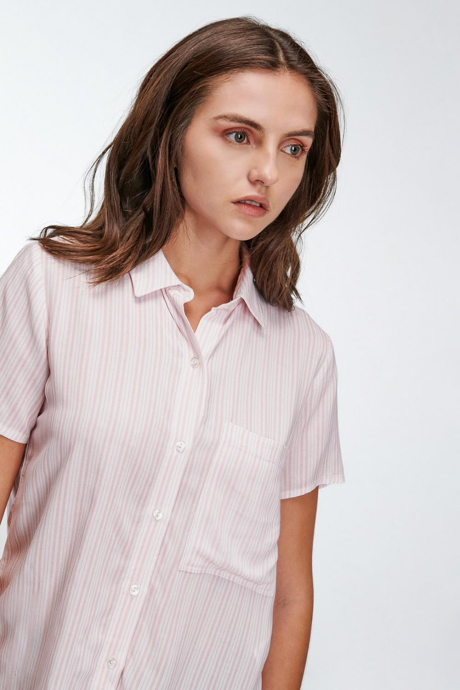 Blusa camisera a rayas, en tela fluida con doble bolsillo abertura en costados, abotonadura en frente.