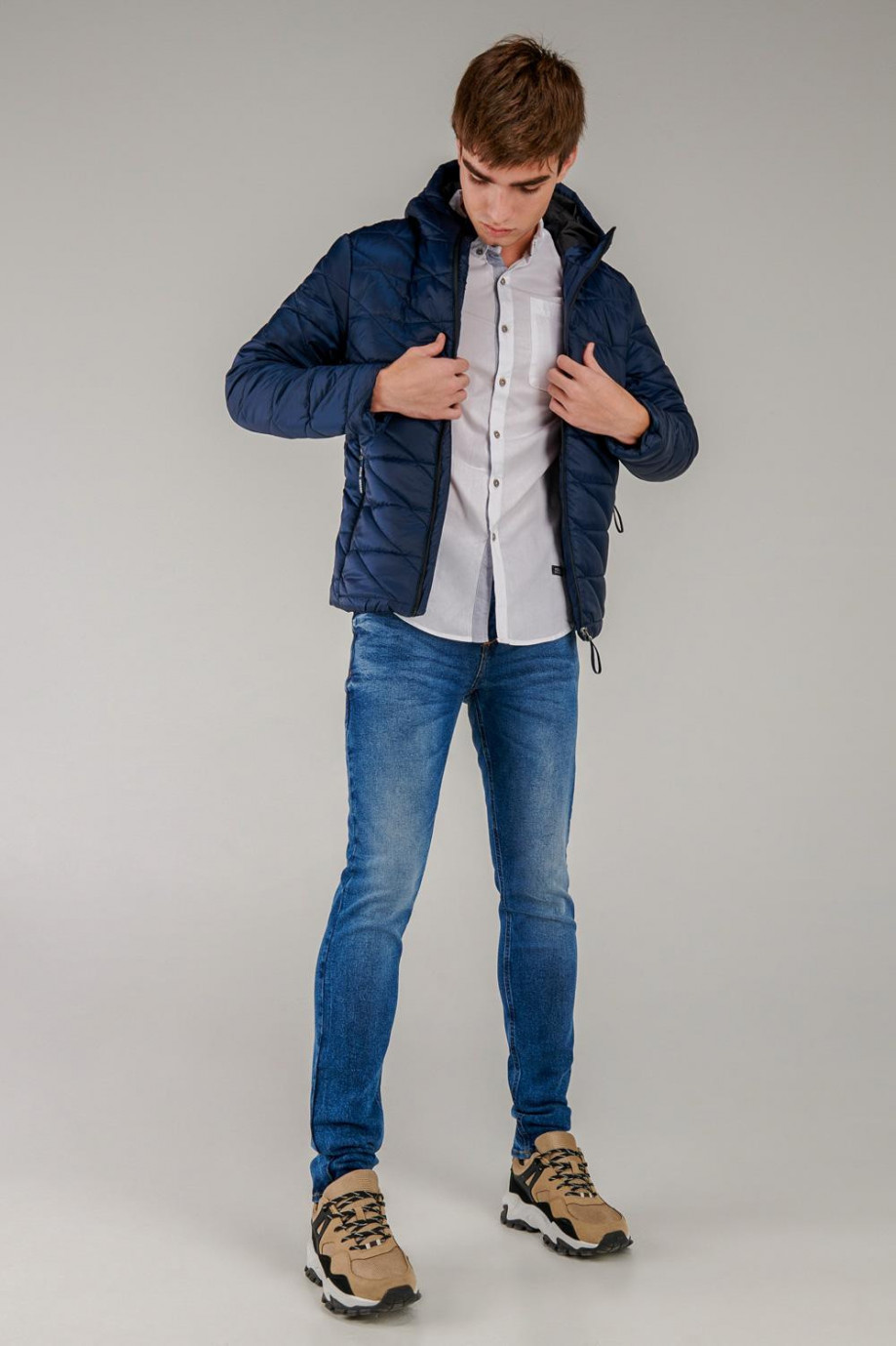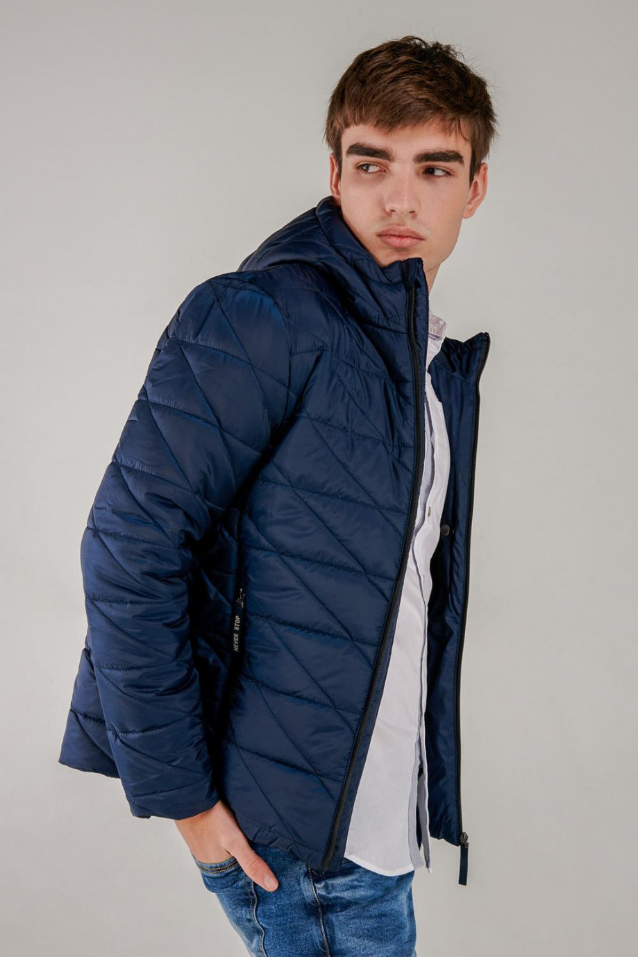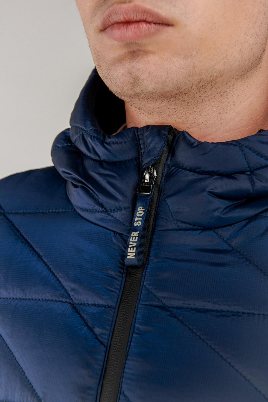 Chaqueta para hombre acolchada, con capota, cuerpo unicolor, con cremalleras en contraste, bolsillos laterales, y cierre frontal en cremallera.