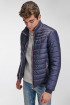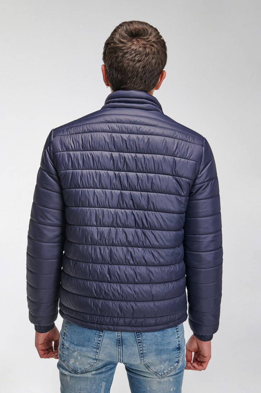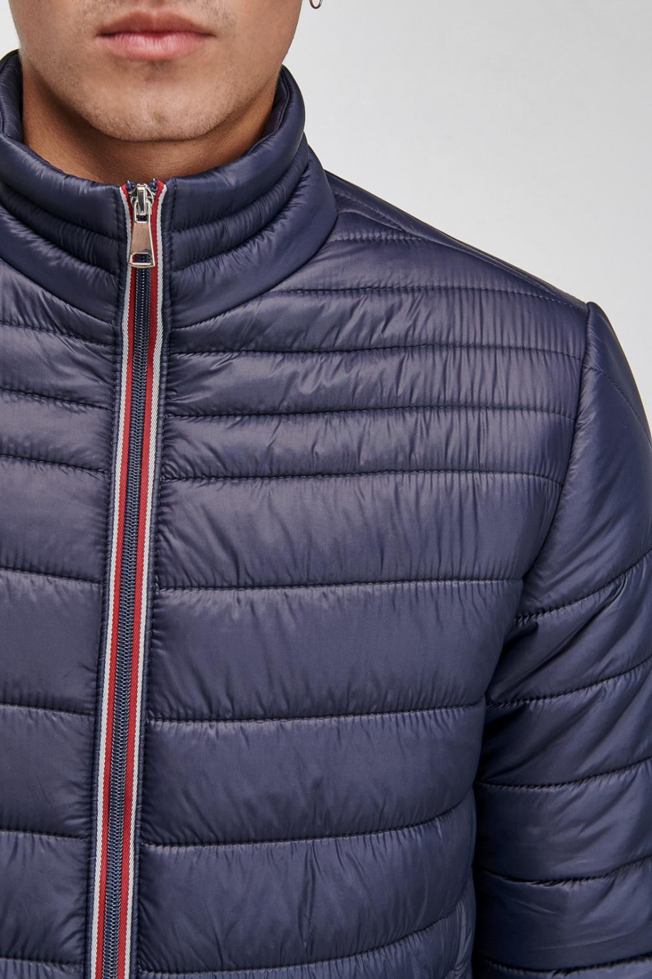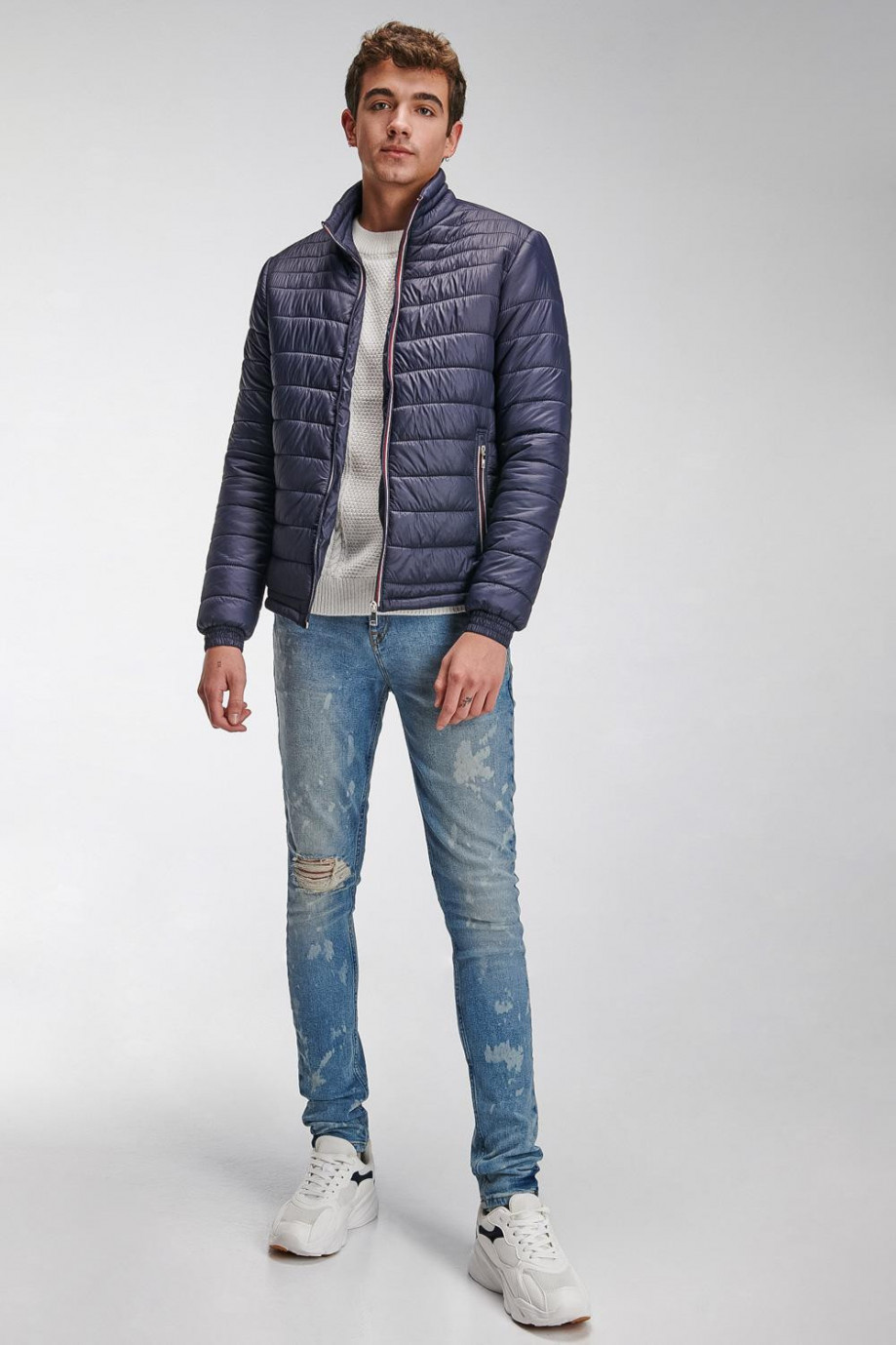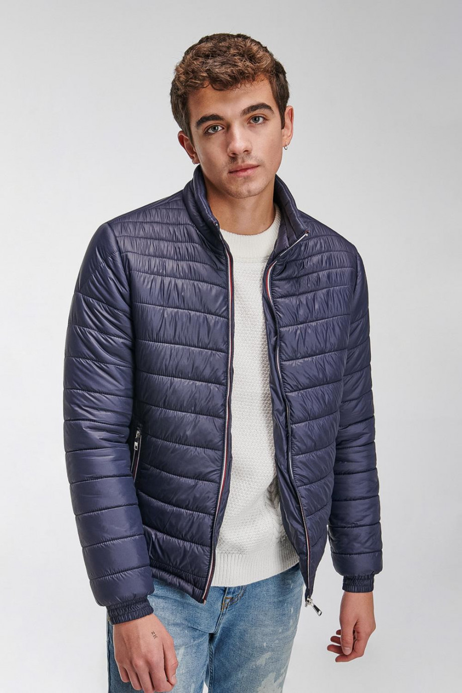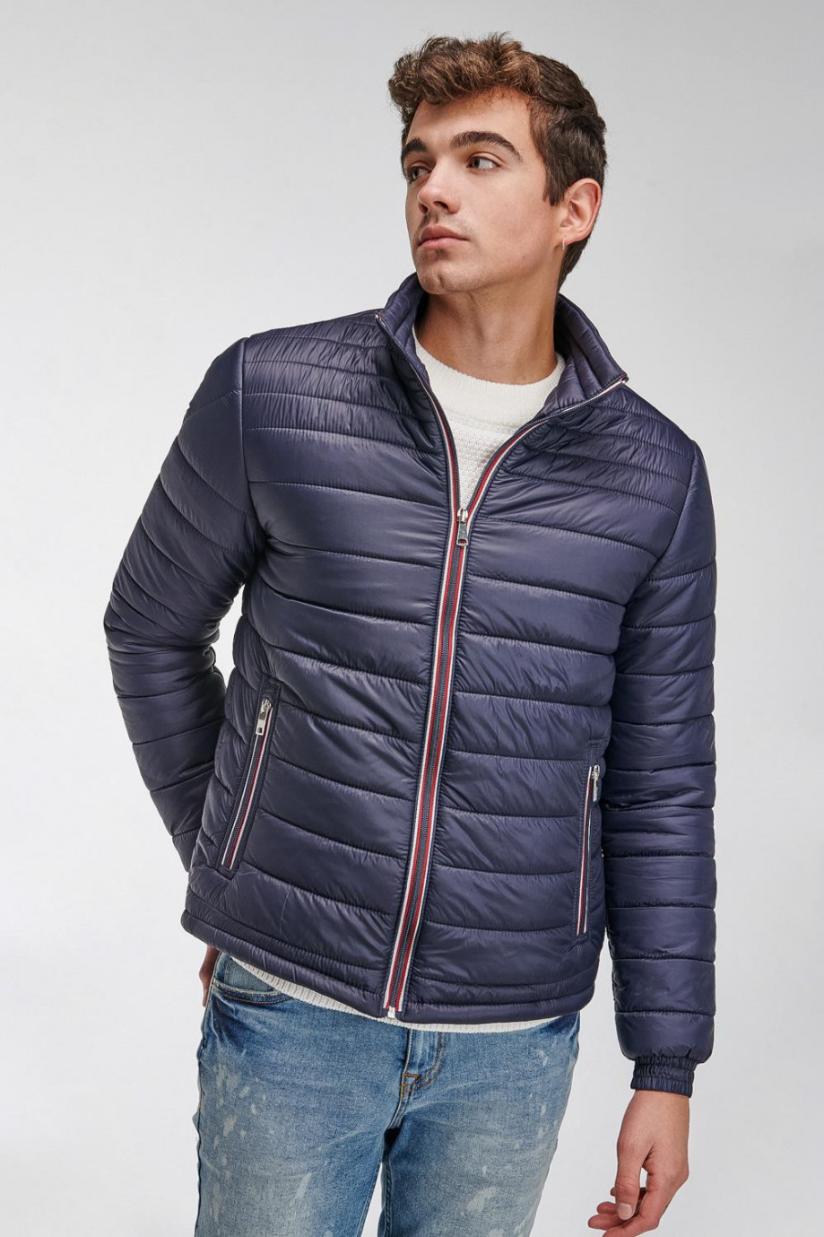 Chaqueta para hombre, acolchada sin capota, en tela de cuerpo unicolor, con bolsillos laterales y cierre frontal con cremallera.