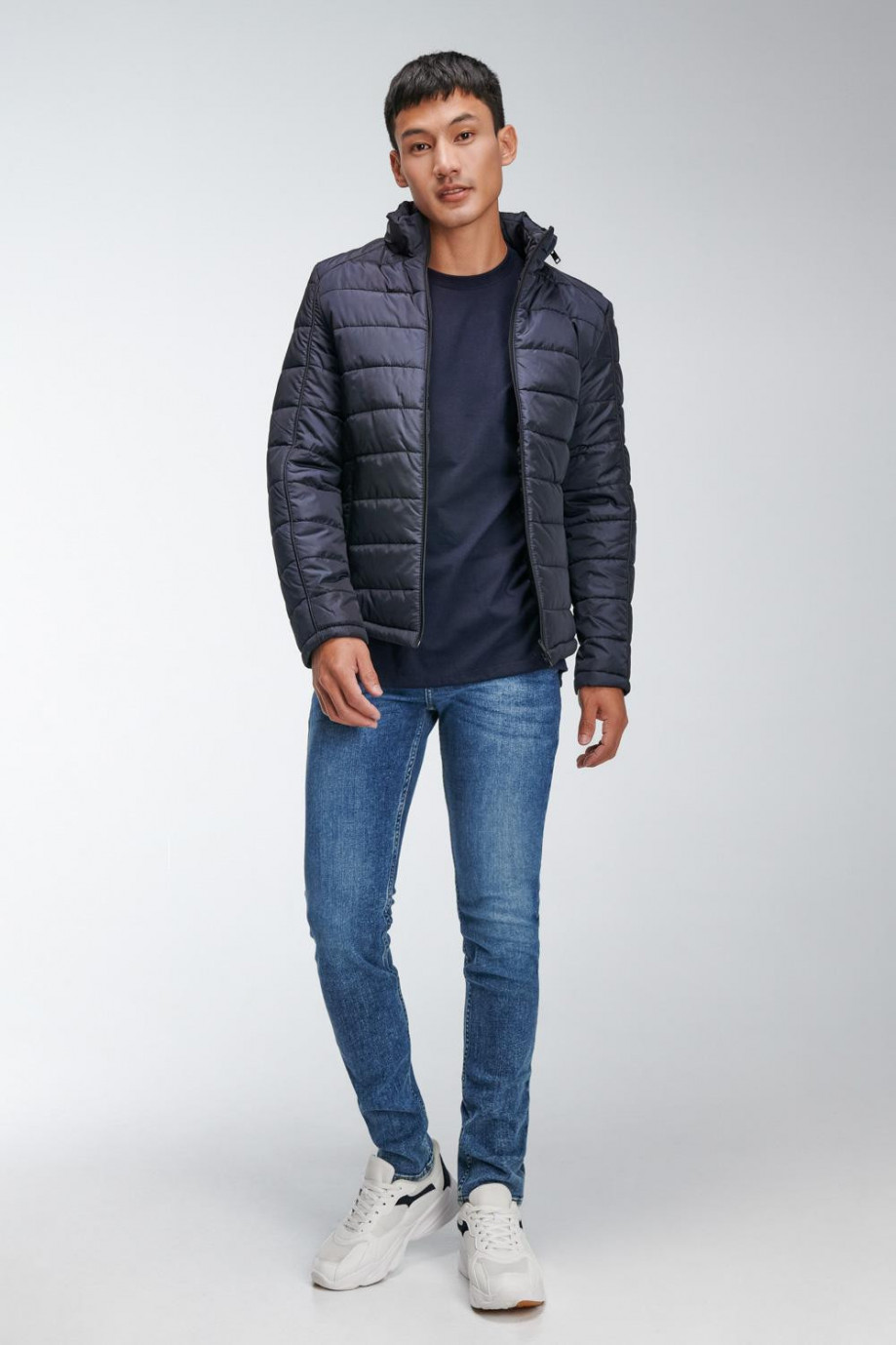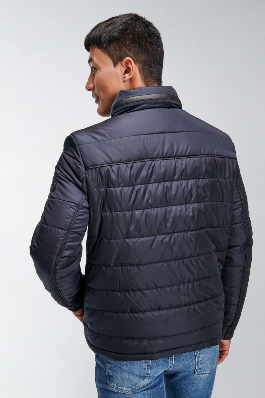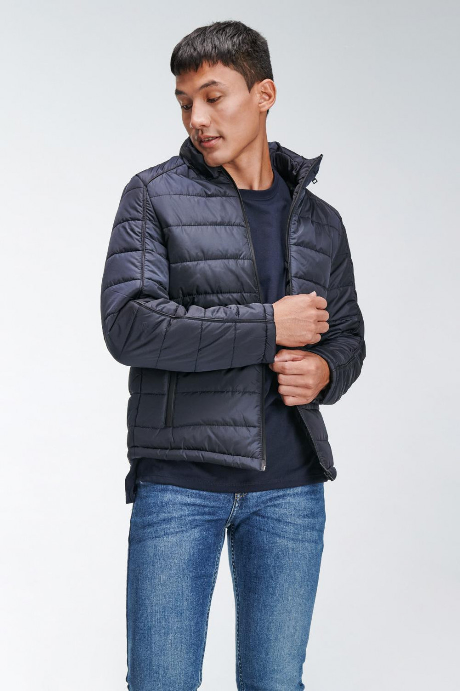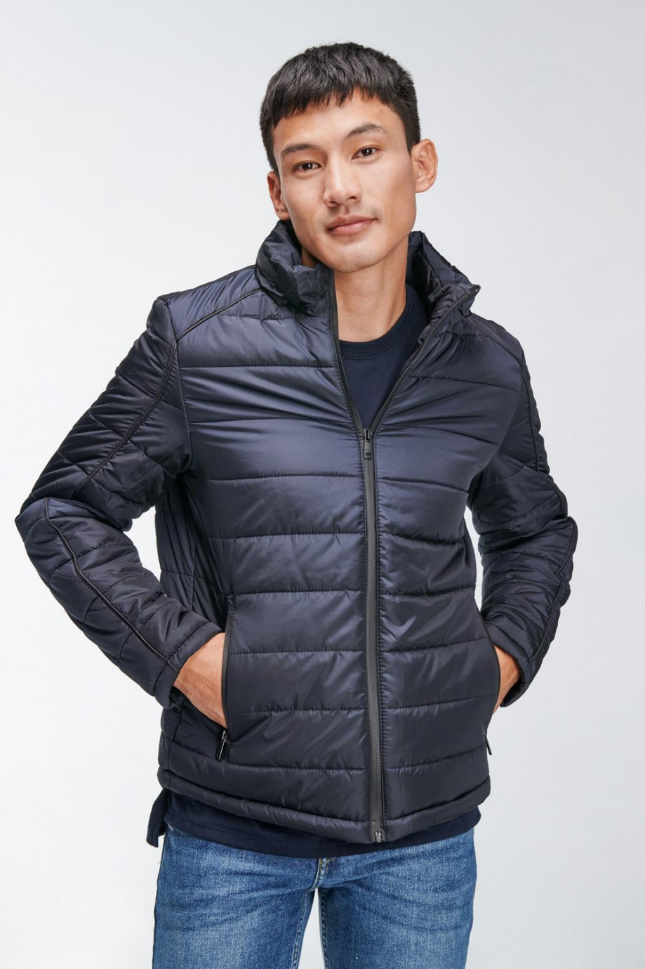 Chaqueta para hombre acolchada, con capota escondida en cuello, cuerpo unicolor, con bolsillos y cierre en cremallera en color contraste.