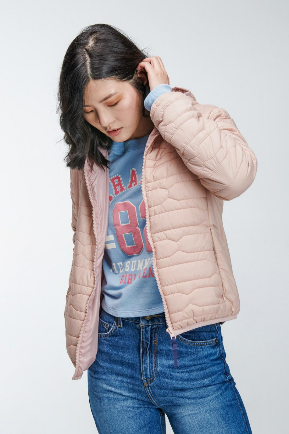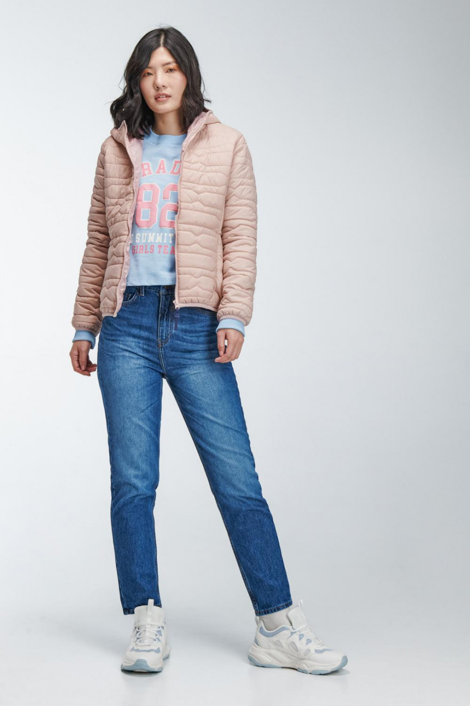 Chaqueta para mujer acolchada con capota, tela unicolor, con sesgos en contraste y cierre frontal con cremallera y jalador decorativo.