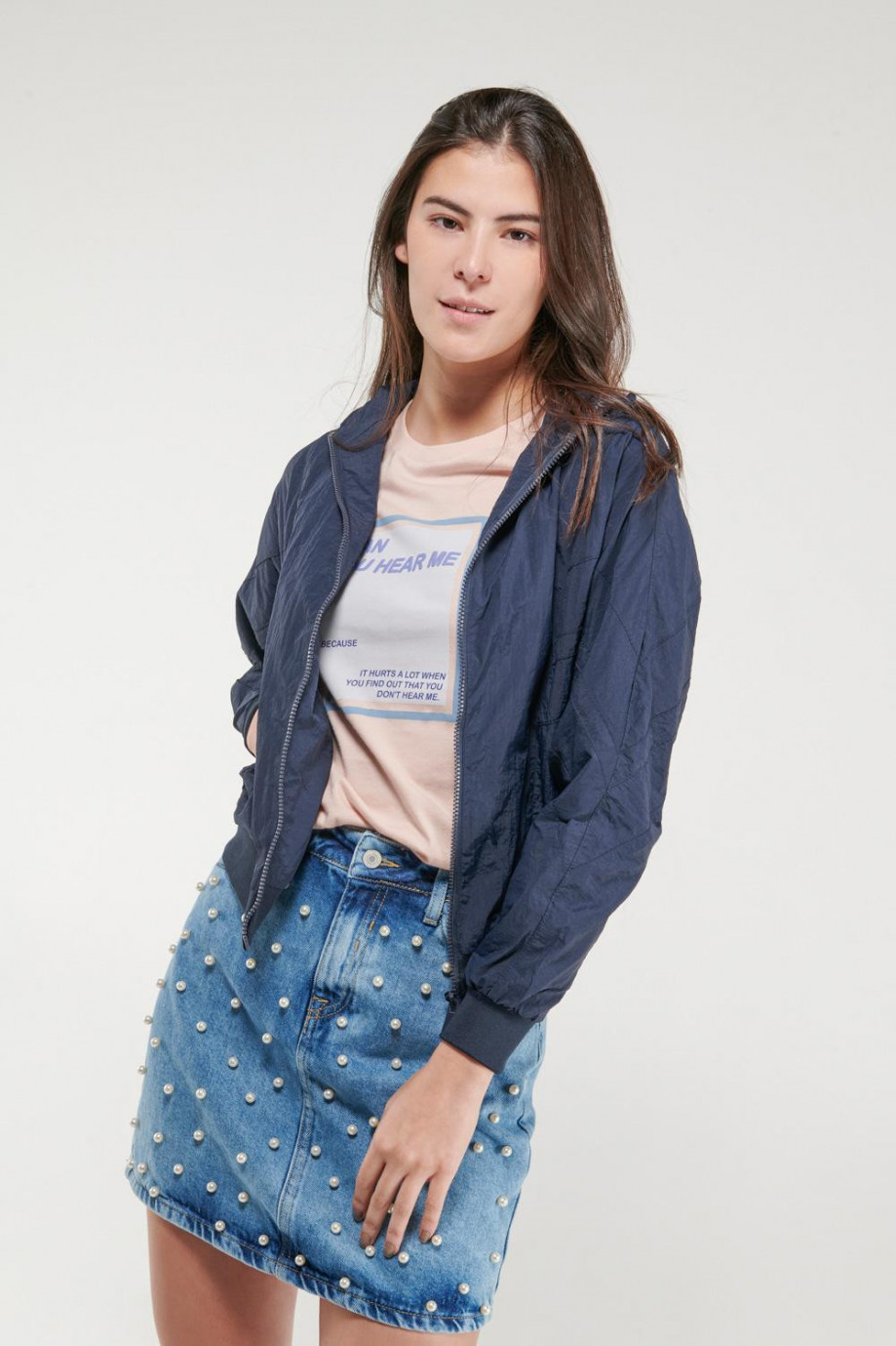 Chaqueta para mujer liviana, con capota, cortes sobre manga, bolsillos laterales y cierre en cremallera.