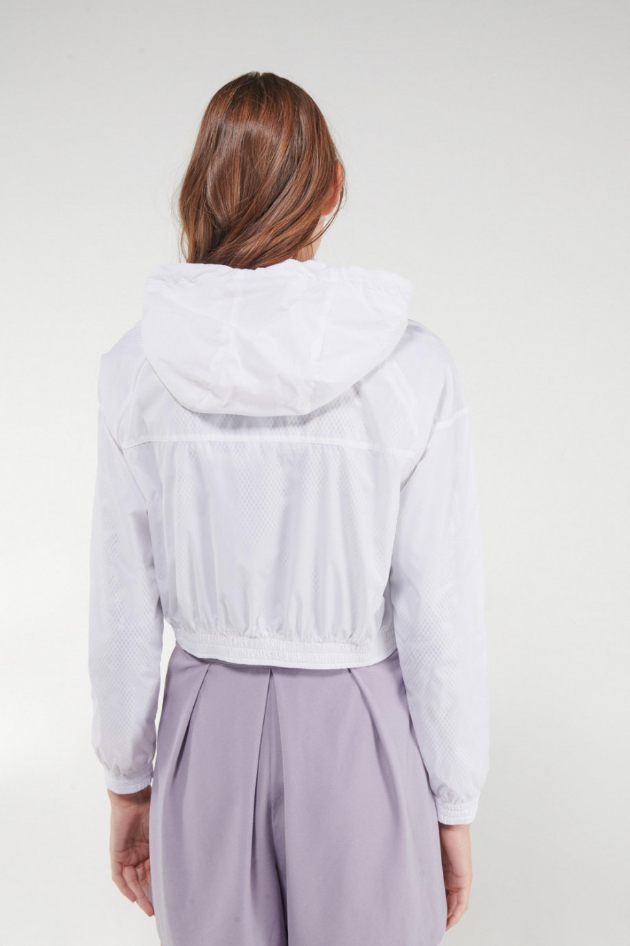 Chaqueta para mujer, tela liviana, manga ranglan, pretina y puños con elástico y cierre frontal con cremallera.