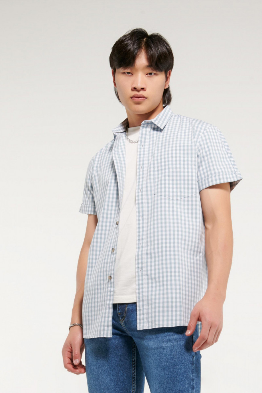 Camsia para hombre, en tela a cuadros con bolsillo delantero