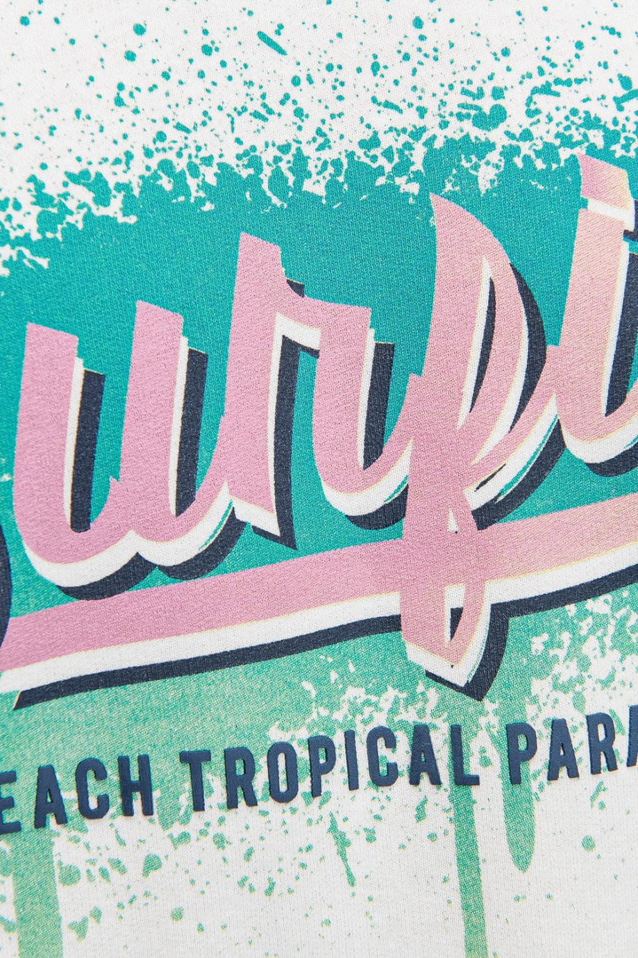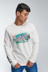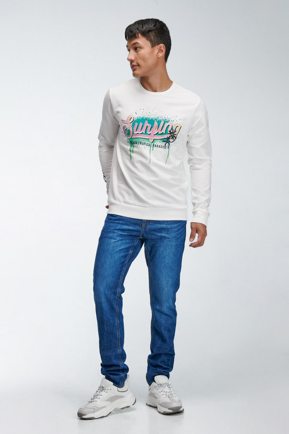 Buzo cuello redondo para hombre estampado en frente y manga derecha, Surf, palmeras y grafiti.
