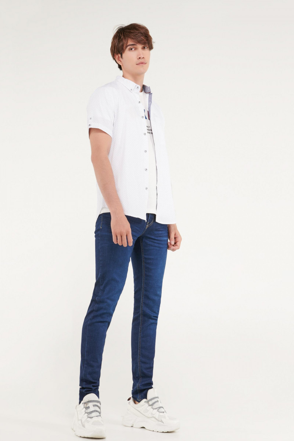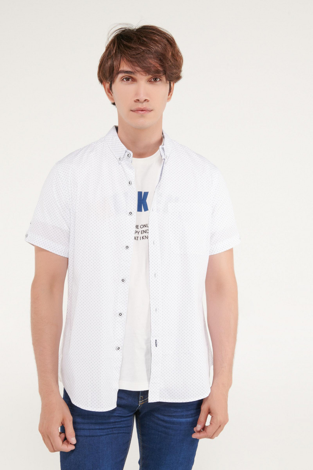 Camisa para hombre, en tela estampada con mini print, bolsillo en frente, cuello button down