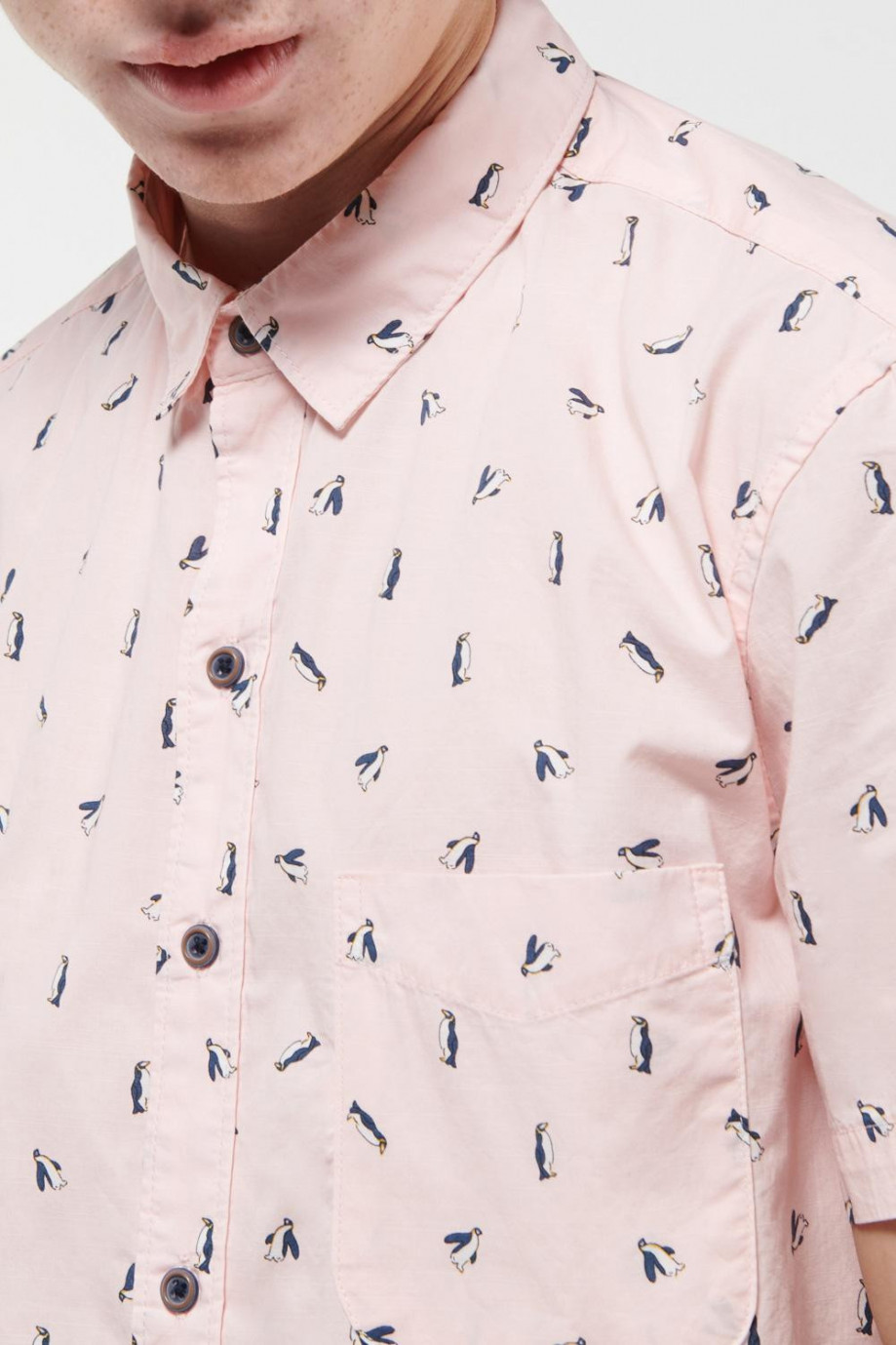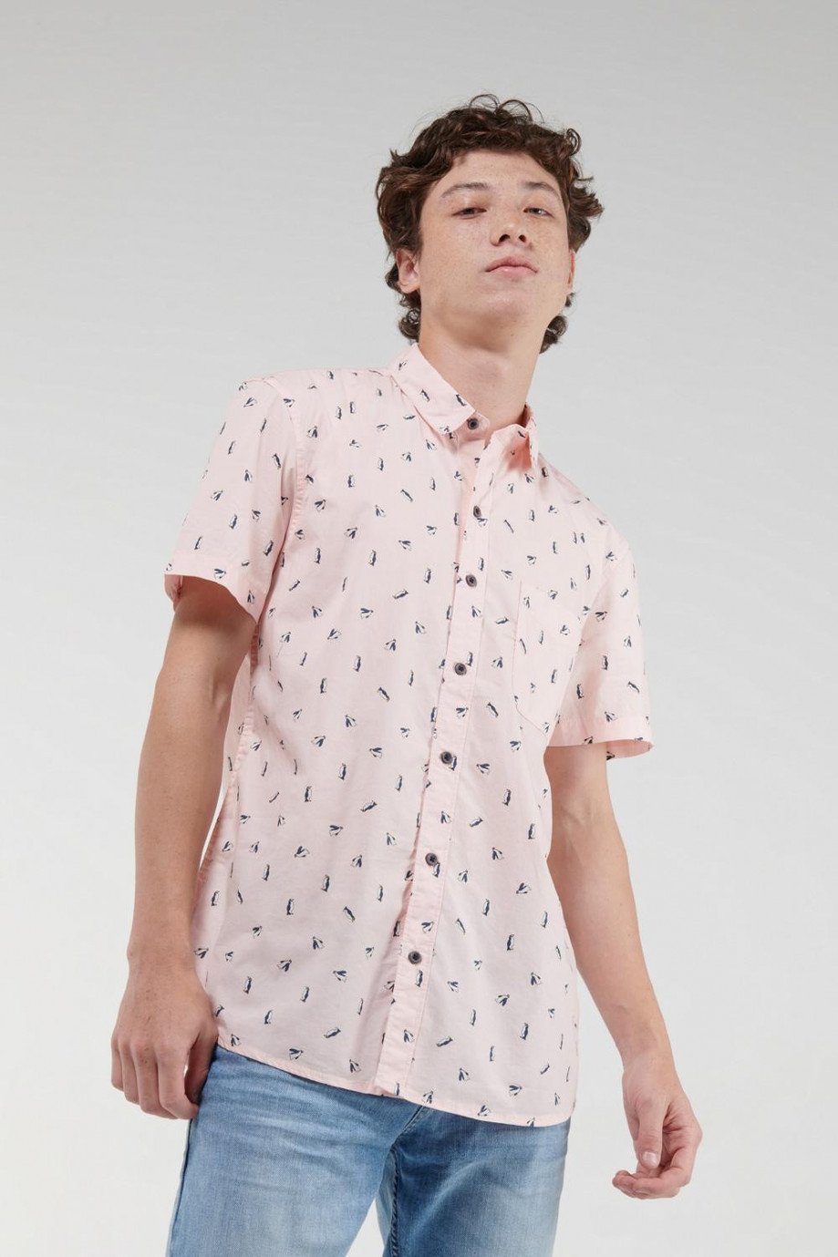 Camisa cuello sport collar con tela estampada, manga corta con un bolsillo y botonadura en el frente.