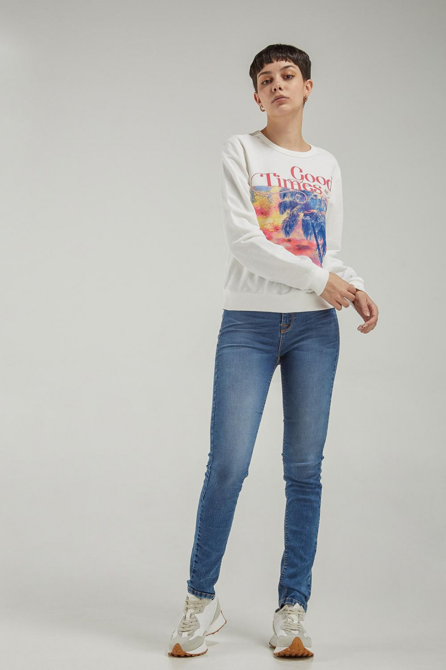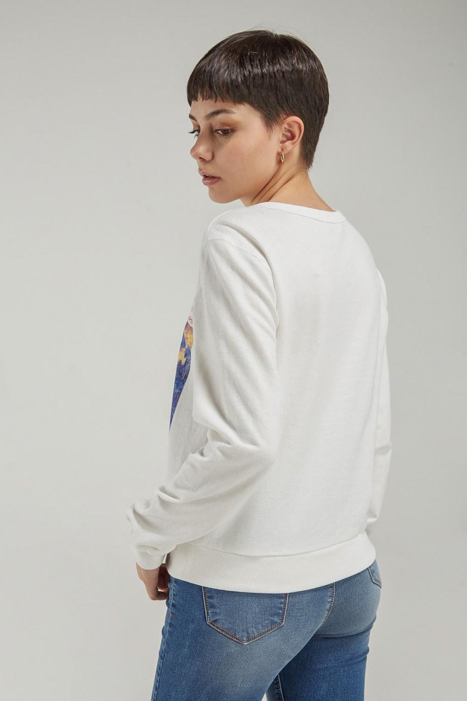 Buzo para mujer cuello redondo, con estampado jeanswear.