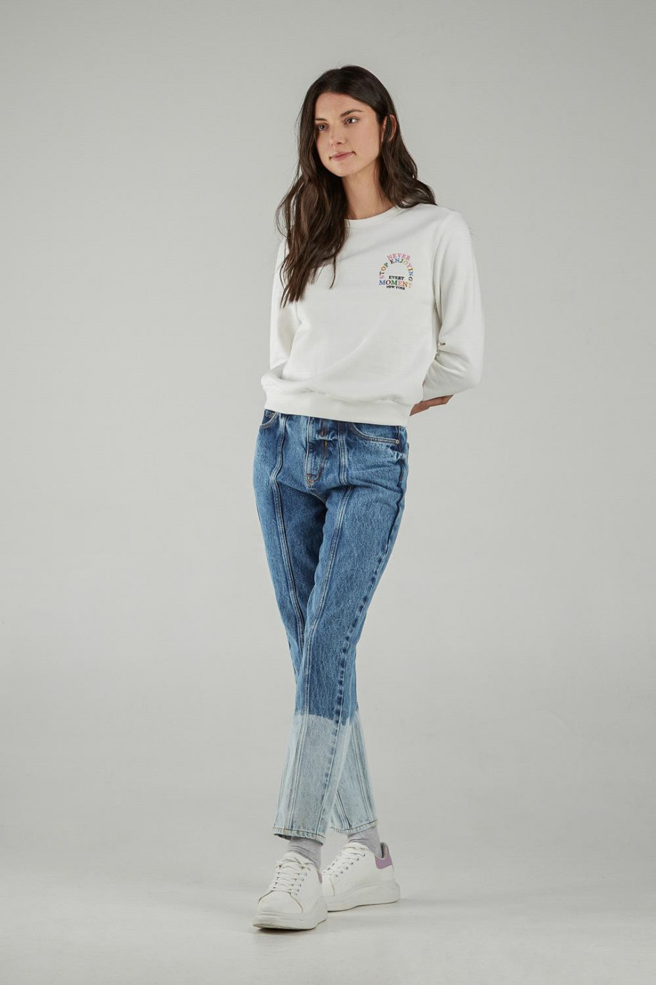 Buzo para mujer cuello redondo, con estampado college.