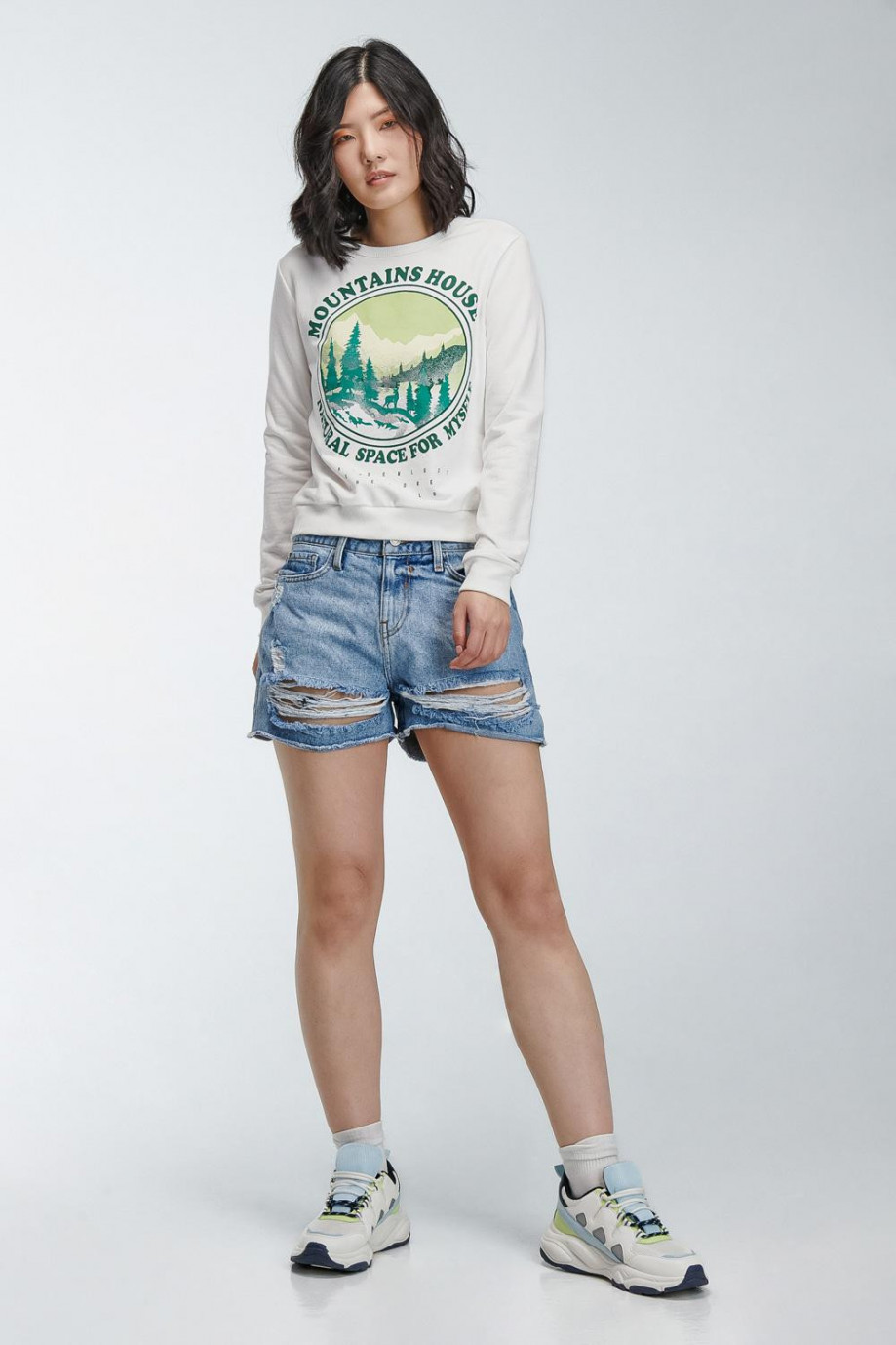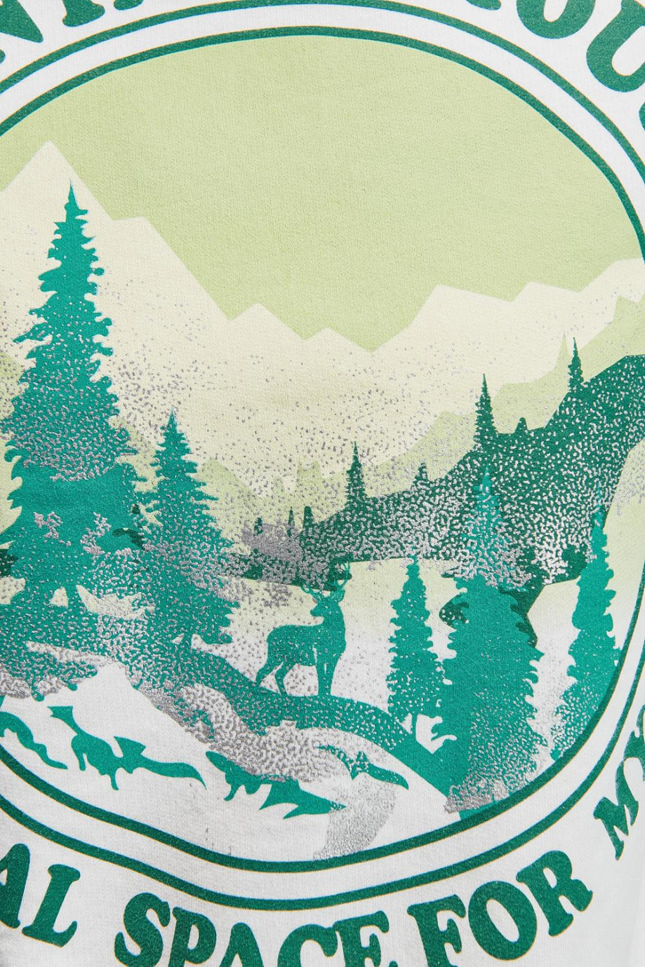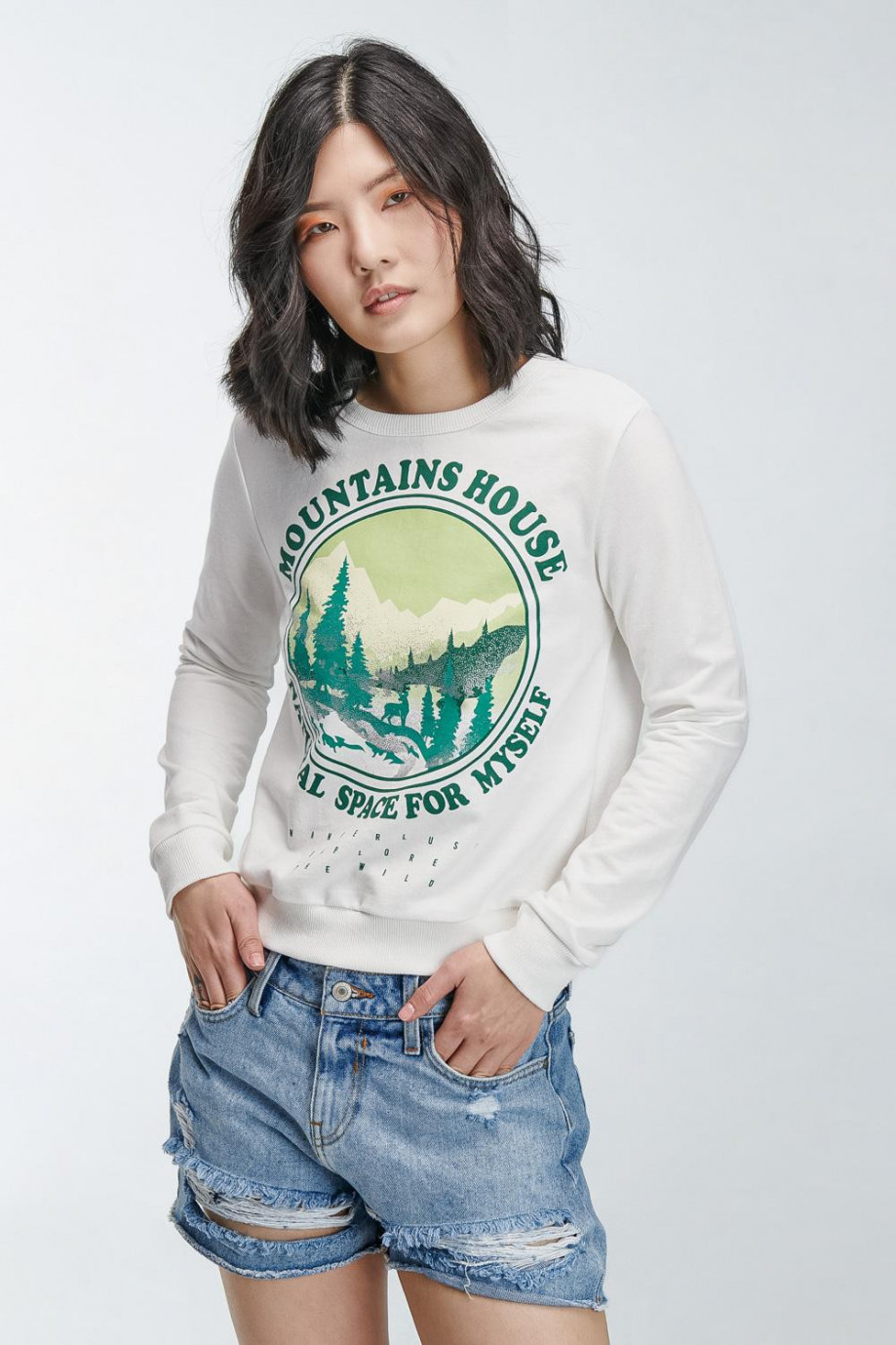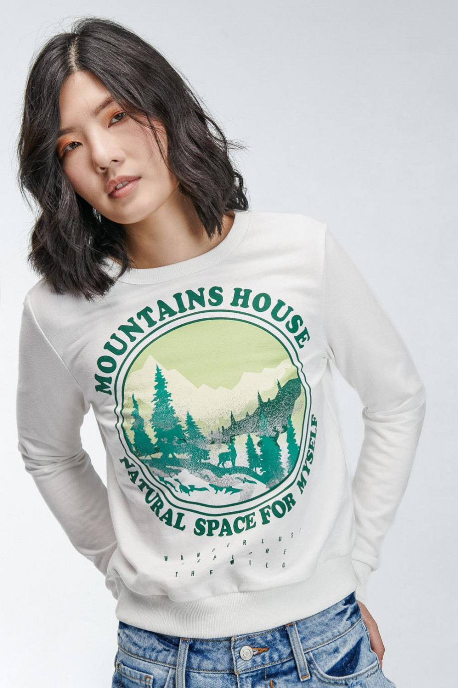 Buzo cuello redondo para mujer con estampado en frente, paisaje montañas con detalles de brillo.
