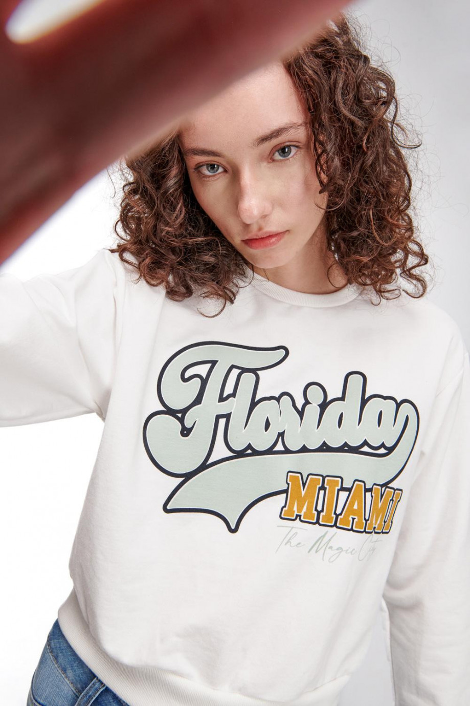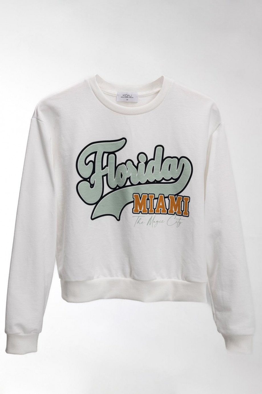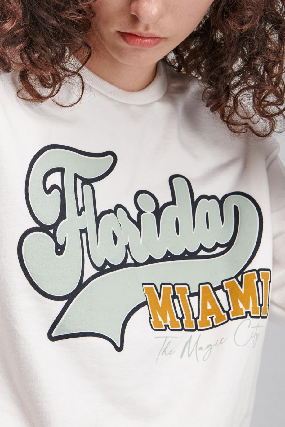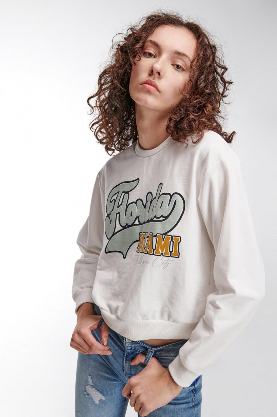 Buzo para mujer cuello redondo, con estampado college.