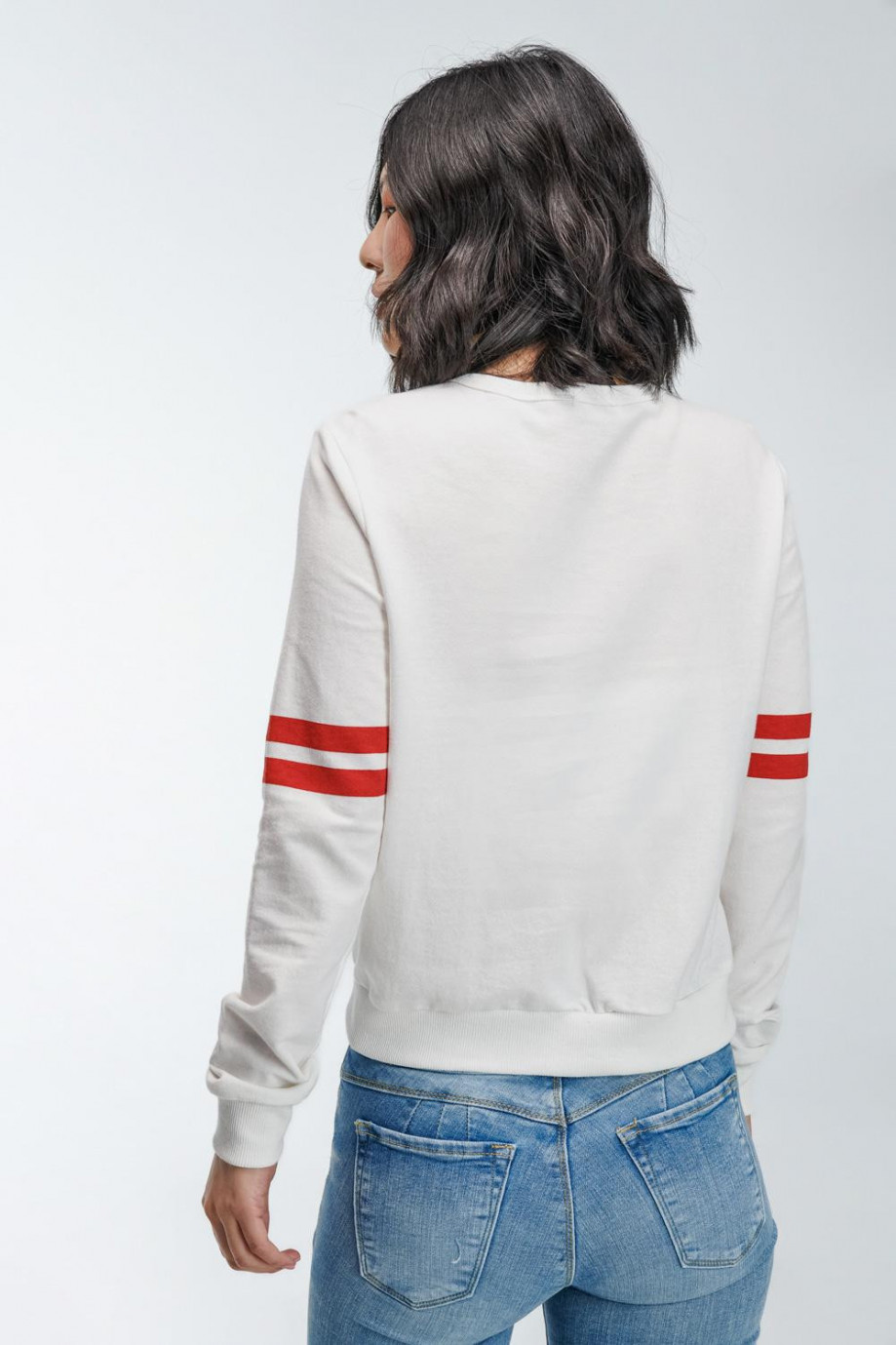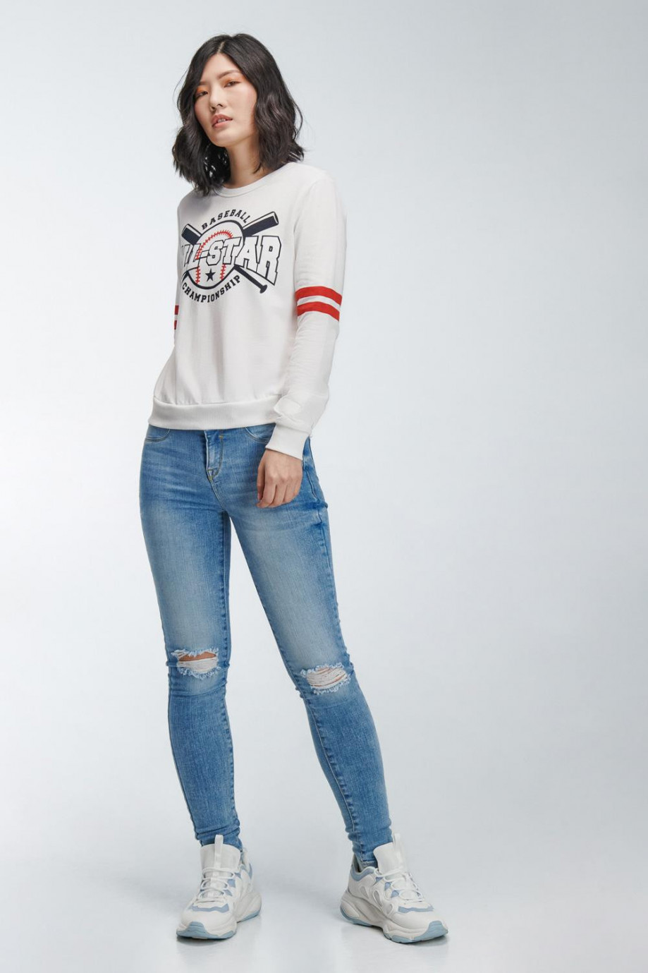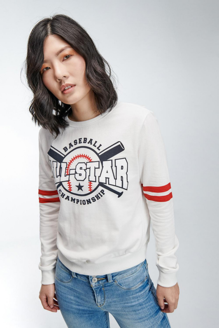 Buzo cuello redondo para mujer con estampado en frente y mangas, béisbol.