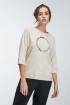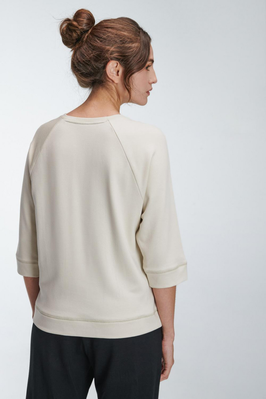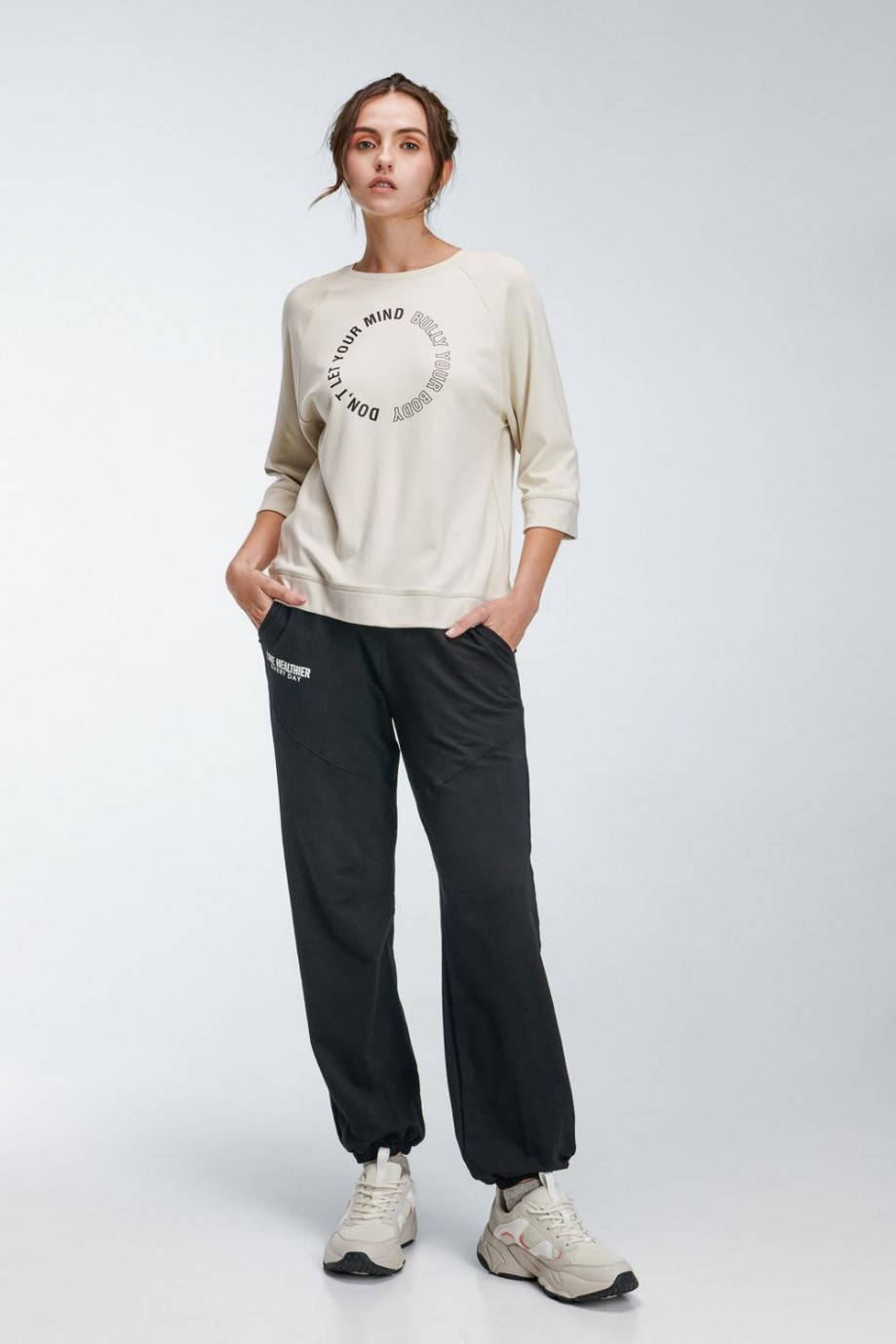 Buzo loungewear femenino, manga ranglan con largo ¾ con puño y detalle en recubridor sobre costura, cuello redondo con estampado sobre el frente.