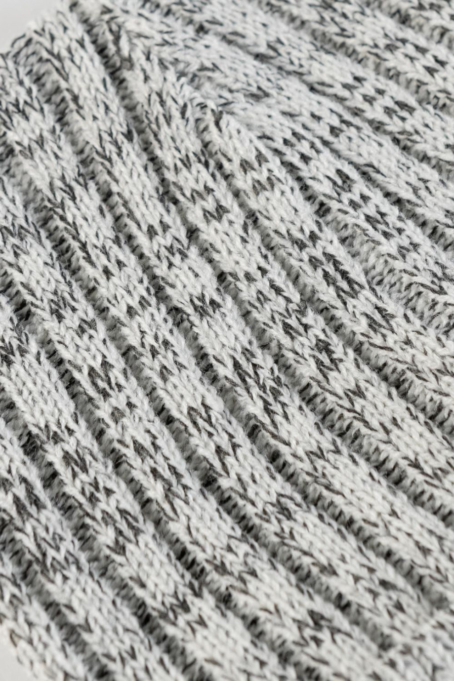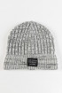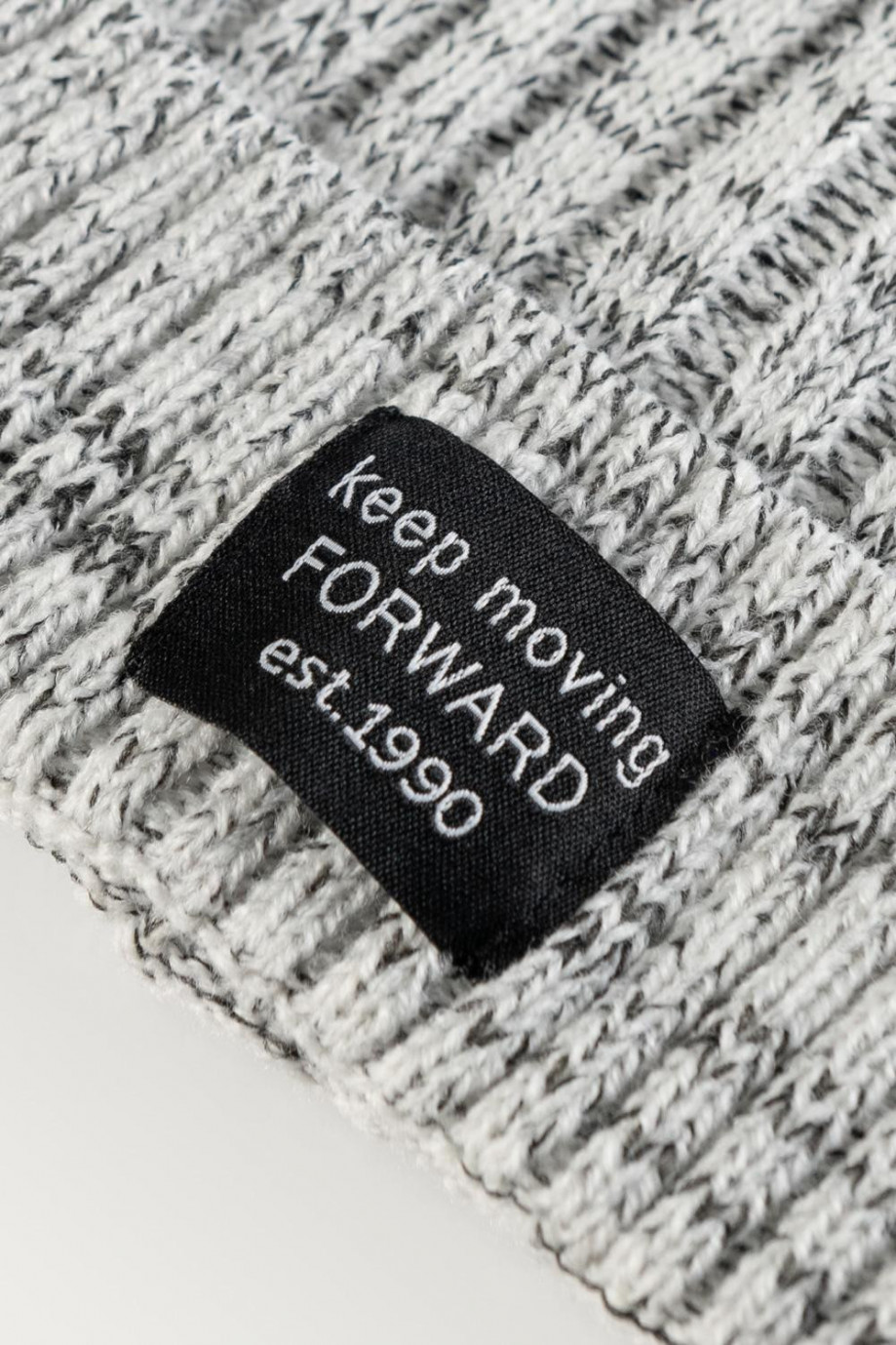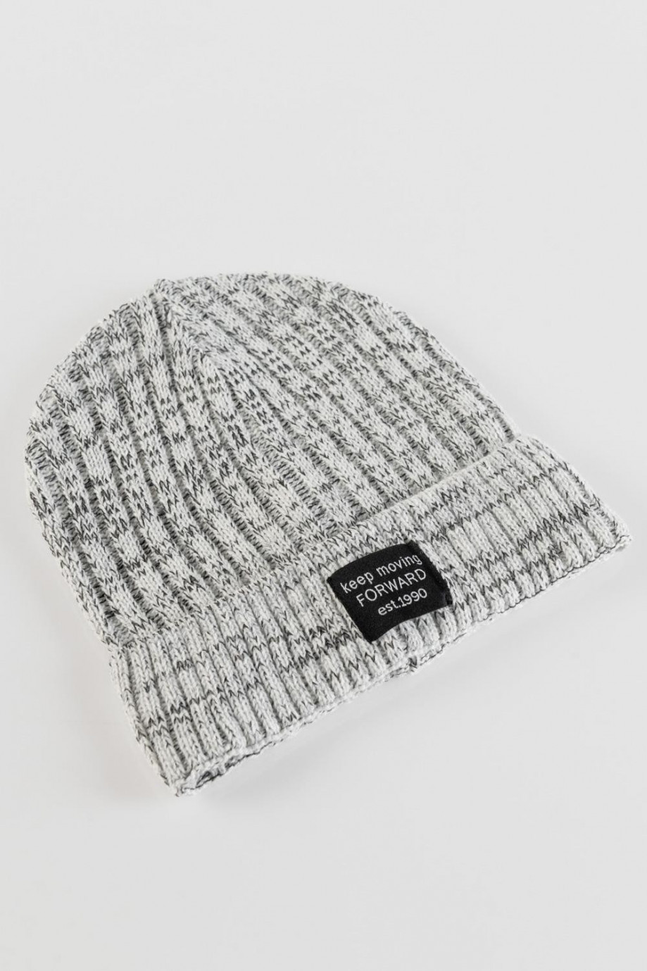 Gorro tejido para mujer jaspeado con canales y marquilla en frente.