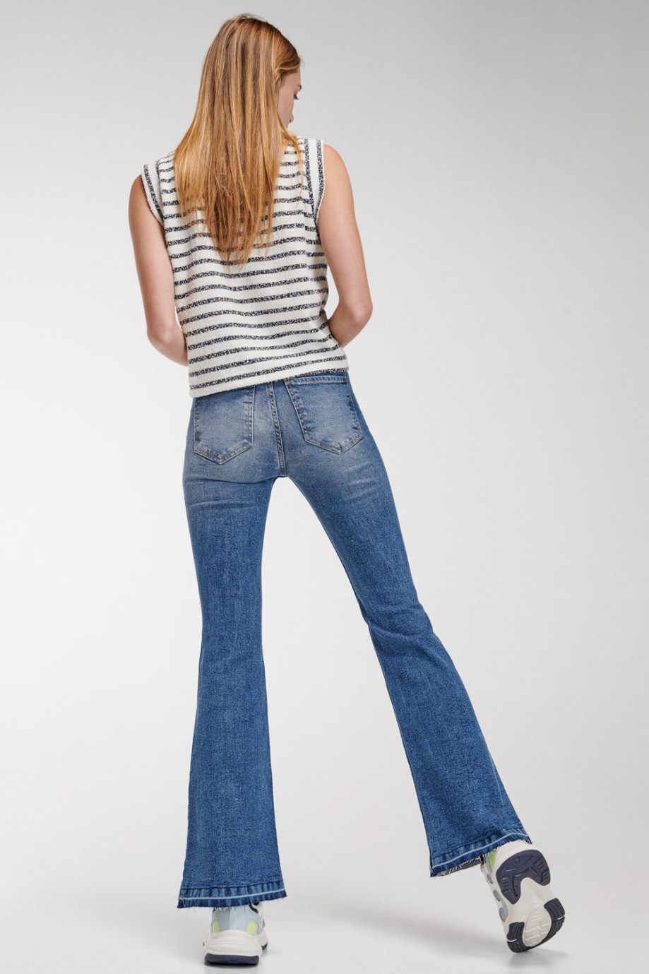 Jean flare para mujer, 5 bolsillos, tiro alto, con rotos, proceso de lavado y laser.