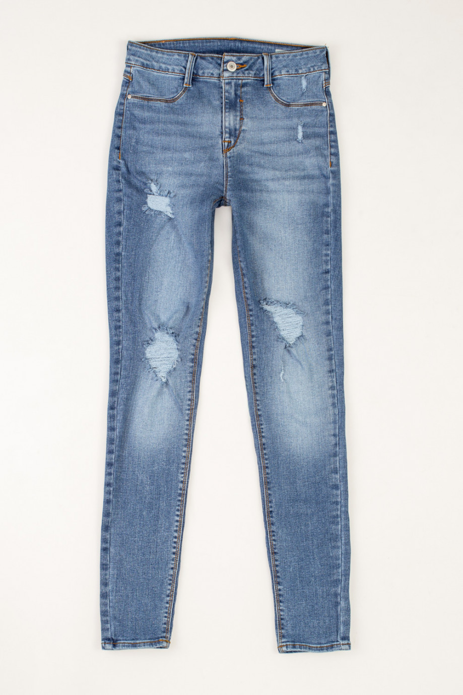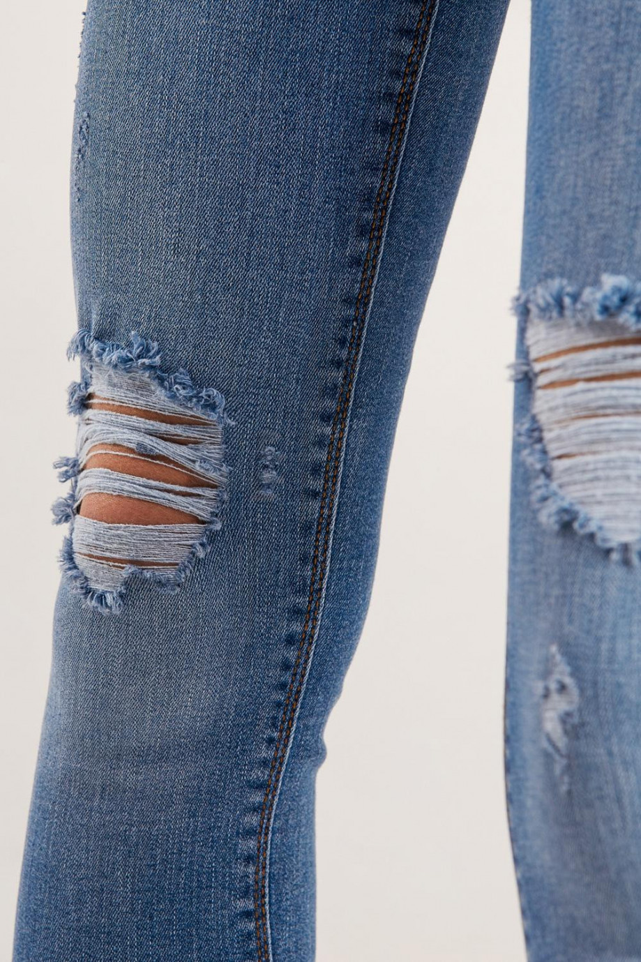 Jean para mujer, 5 bolsillos, tiro alto, ajuste ceñido con lavado azul claro.