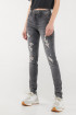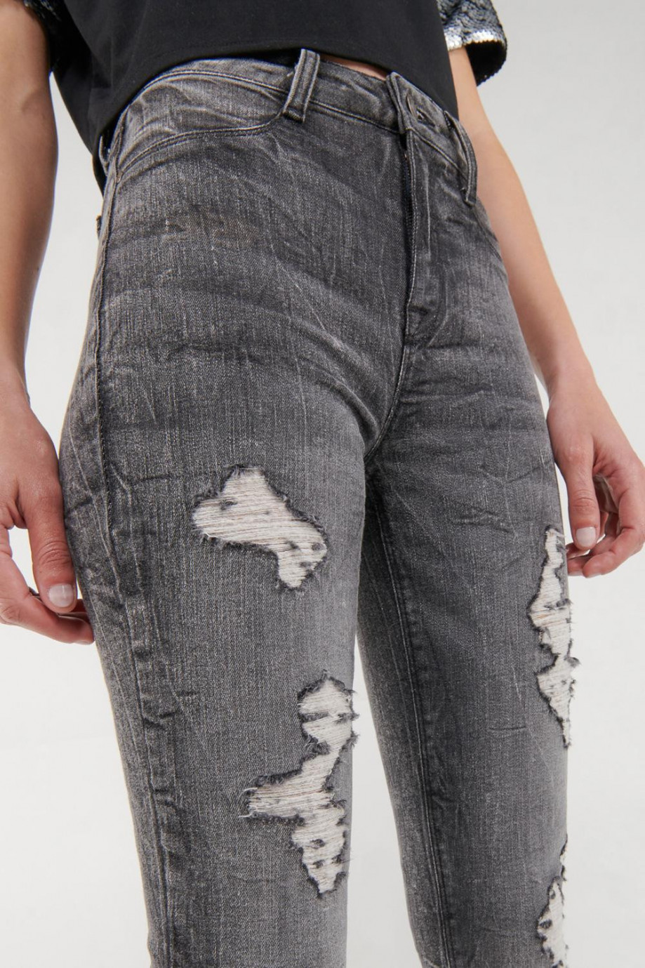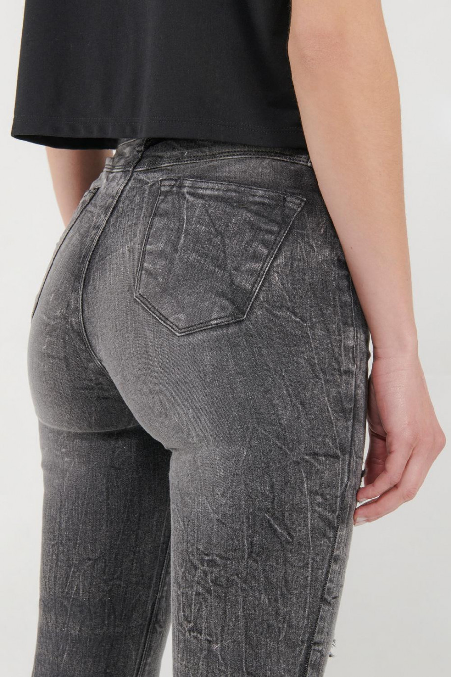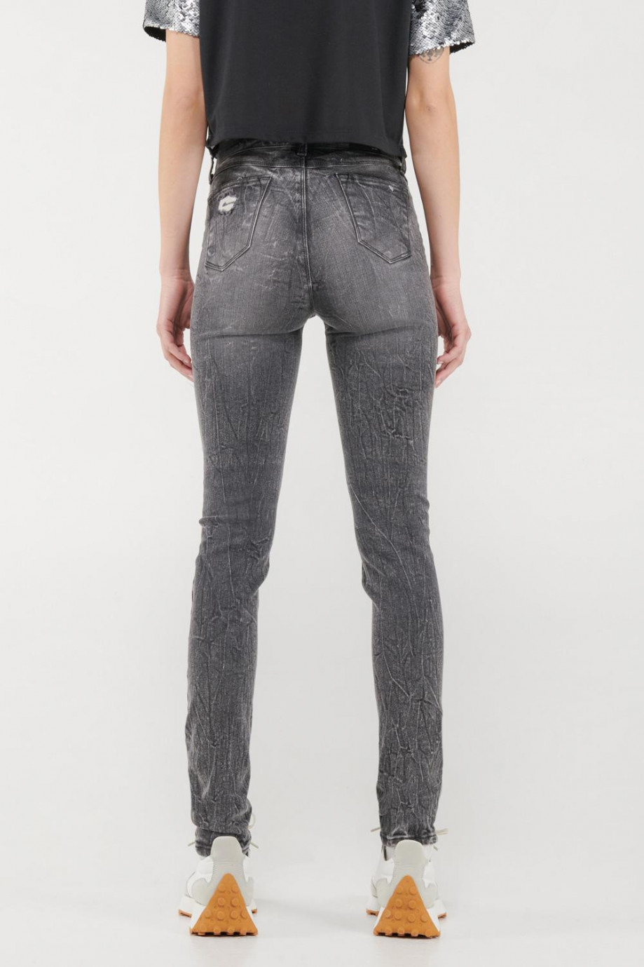 Jean para mujer, 5 bolsillos, tiro alto, ajuste ceñido con lavado gris.