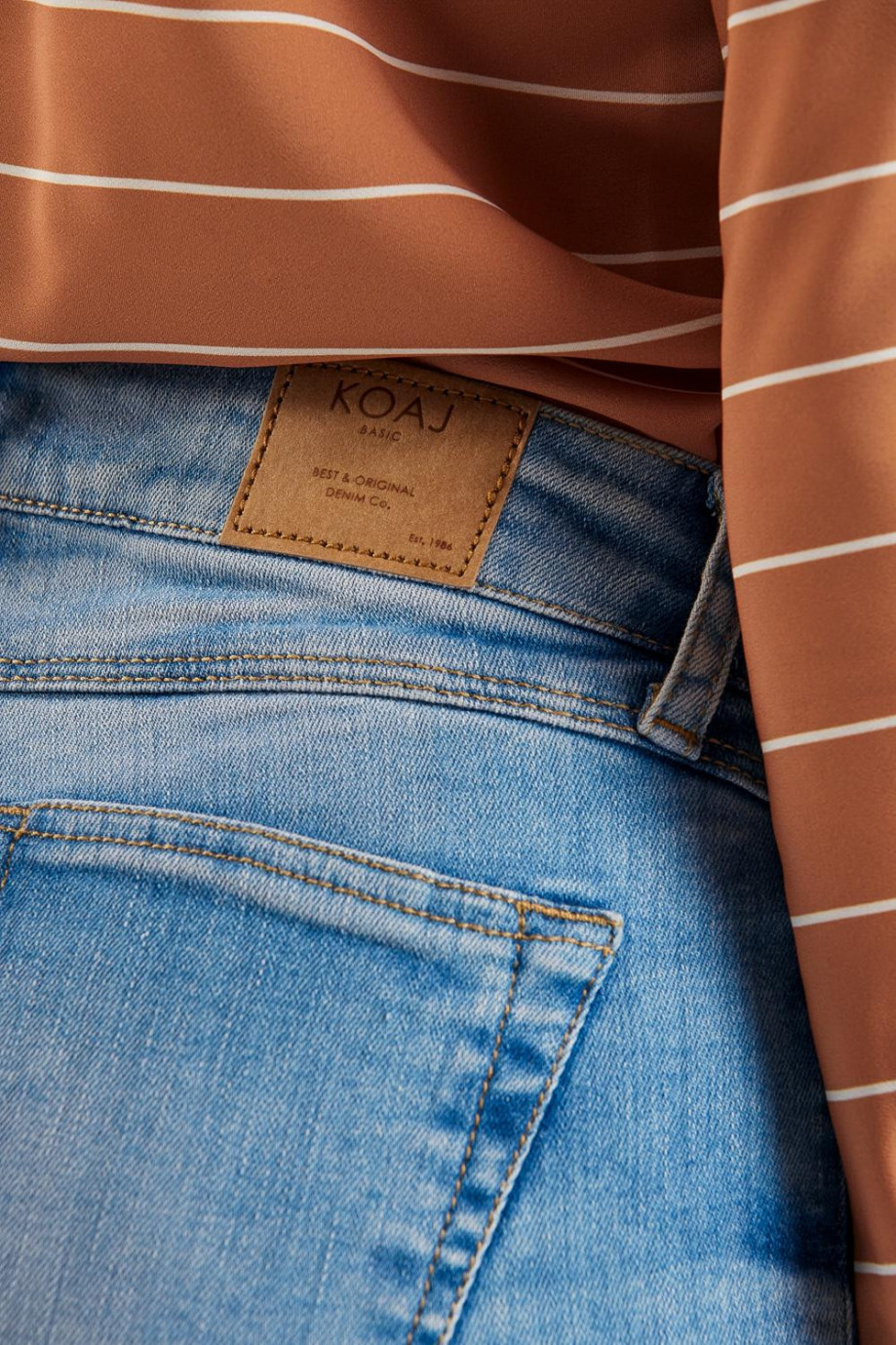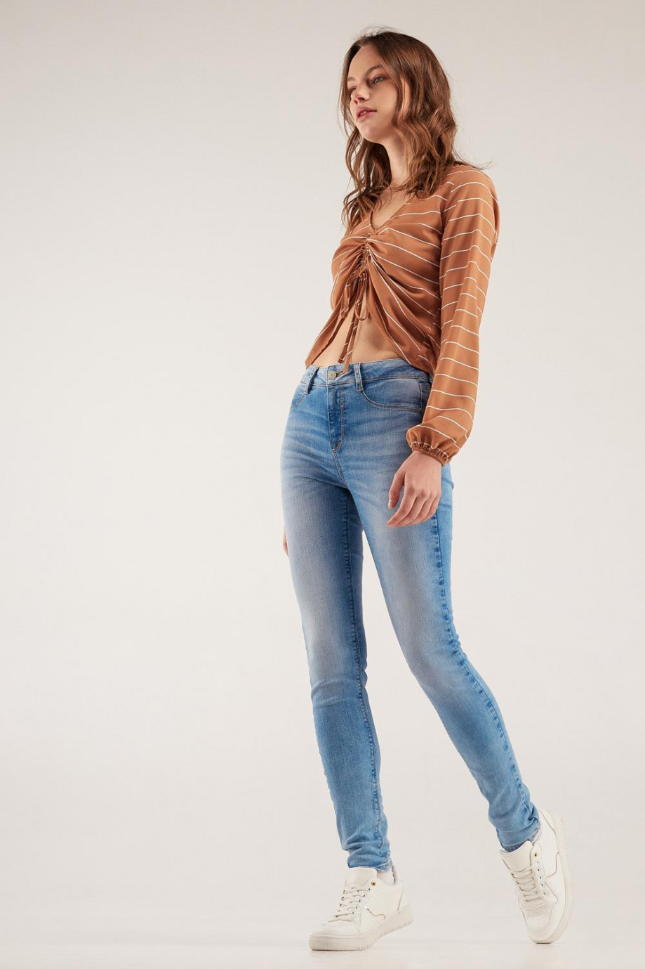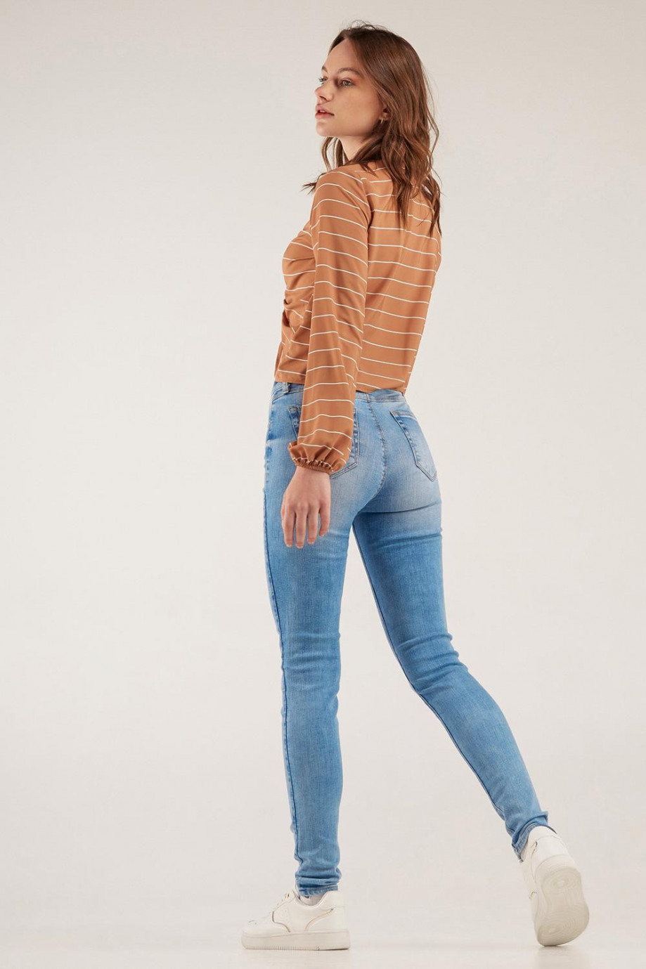 Jean para mujer, 5 bolsillos, tiro alto, ajuste ceñido con lavado muy claro