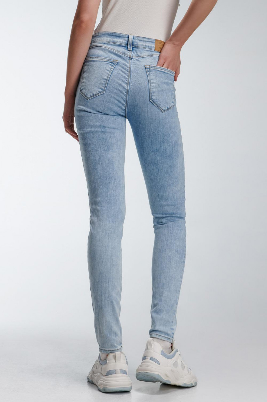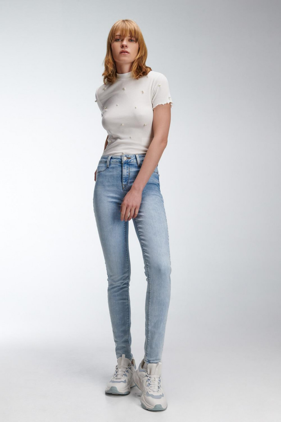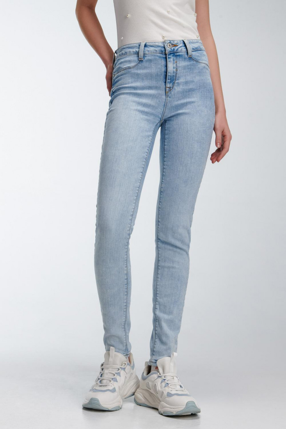 Jean para mujer, 5 bolsillos, tiro alto, ajuste ceñido con lavado azul muy claro.