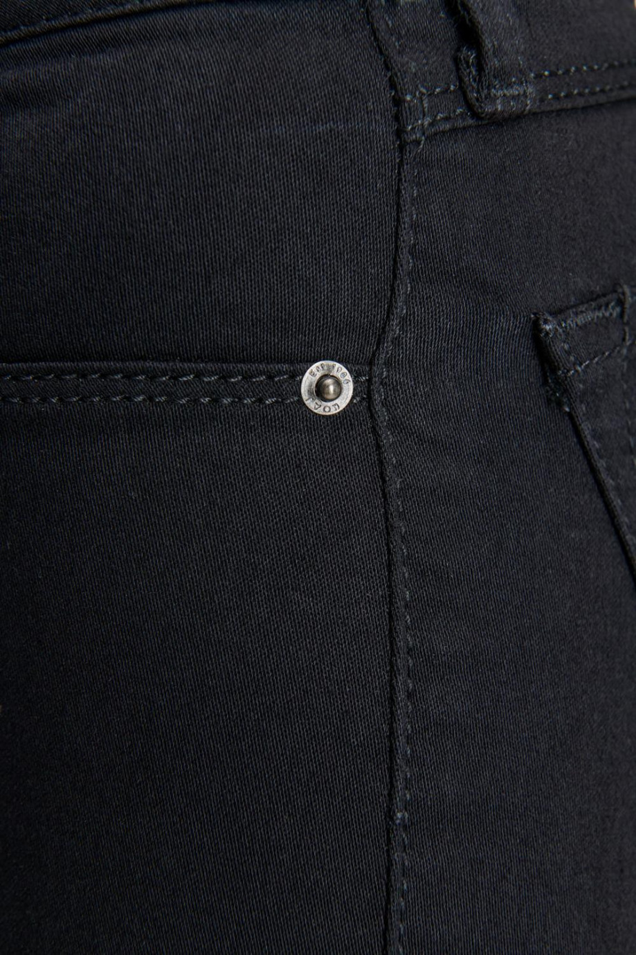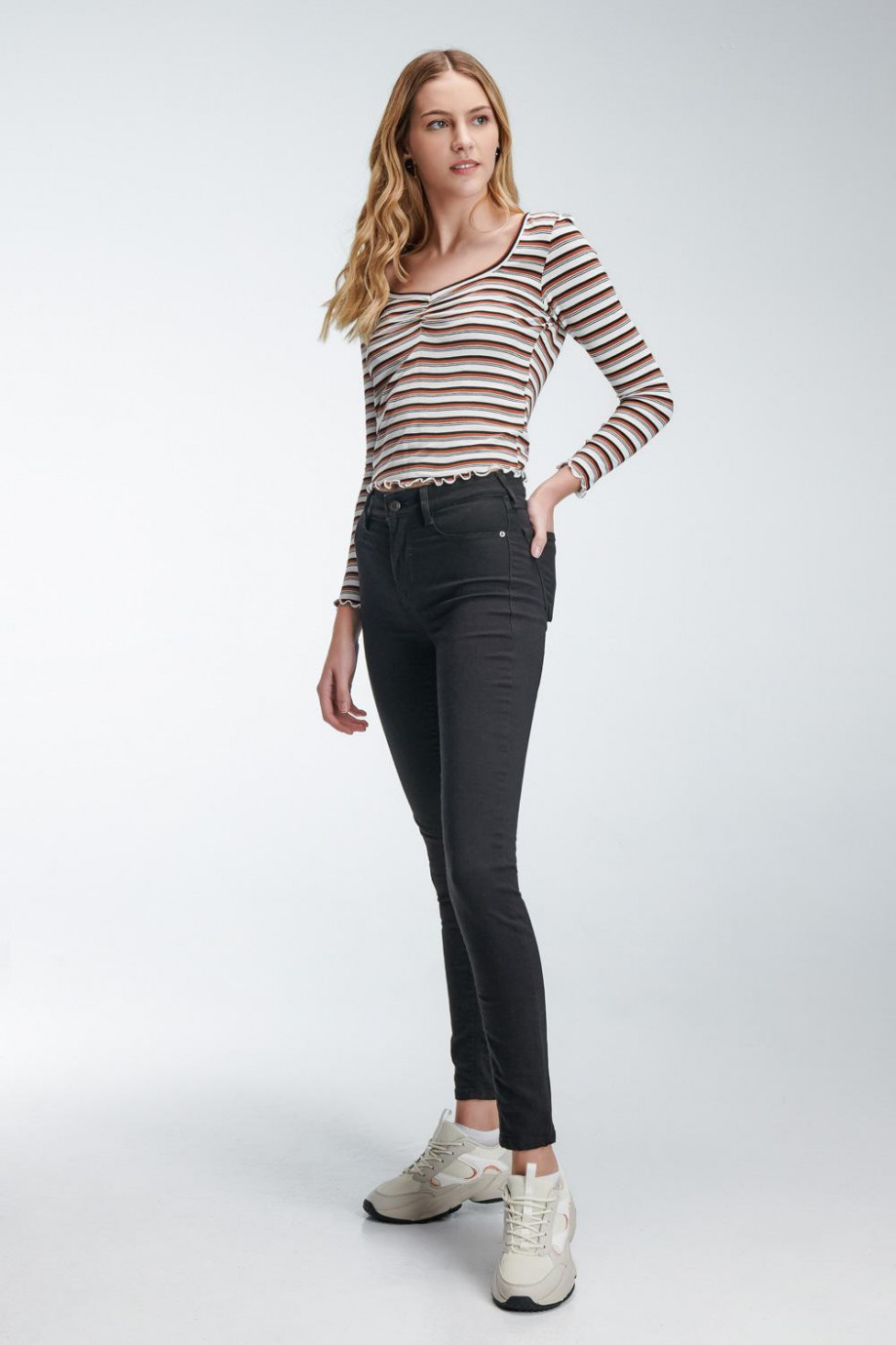 Jean para mujer, 5 bolsillos, tiro alto, ajuste ceñido con lavado negro.