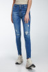 Jean para mujer, 5 bolsillos, tiro alto, ajuste ceñido con lavado azul medio.