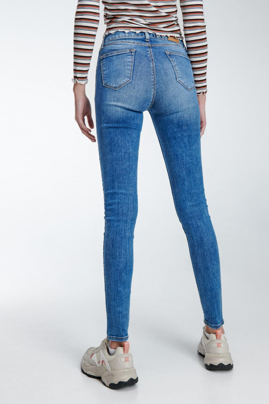 Jean para mujer, 5 bolsillos, tiro alto, ajuste ceñido con lavado azul claro.