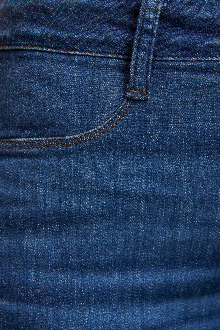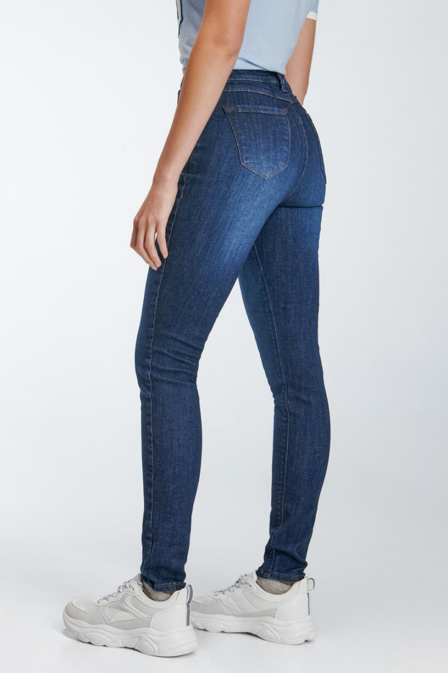 Jean para mujer, 5 bolsillos, tiro alto, ajuste ceñido con lavado azul oscuro.