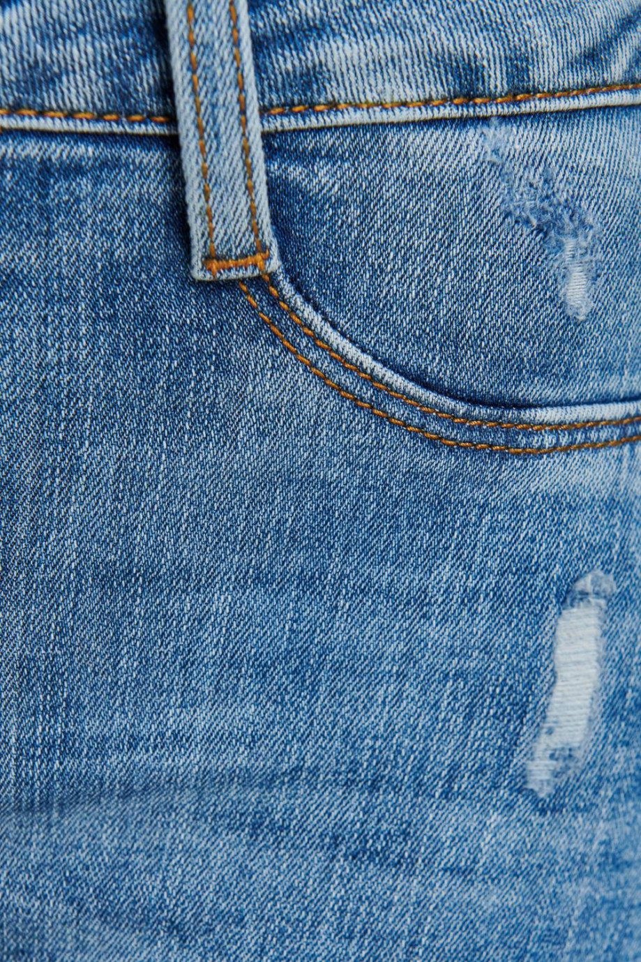 Jean para mujer, 5 bolsillos, tiro alto, ajuste ceñido con lavado azul claro.