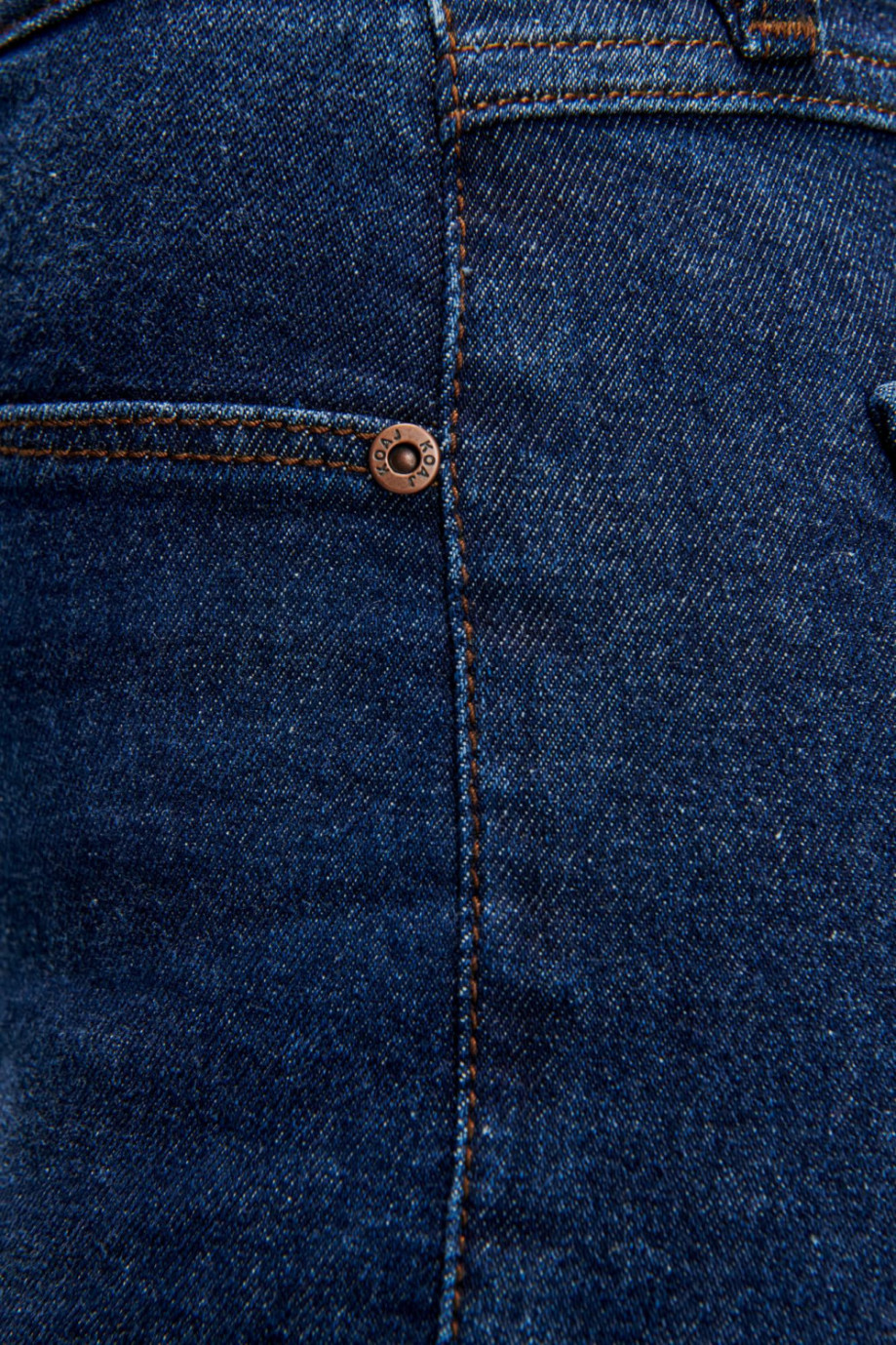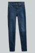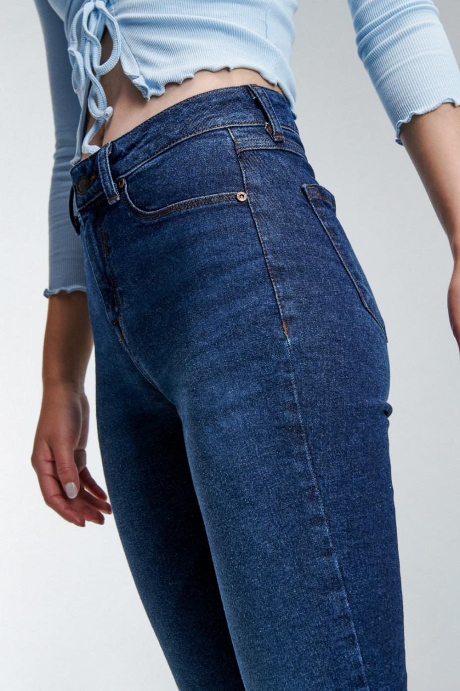 Jean para mujer, 5 bolsillos, tiro alto, ajuste ceñido con lavado azul oscuro.