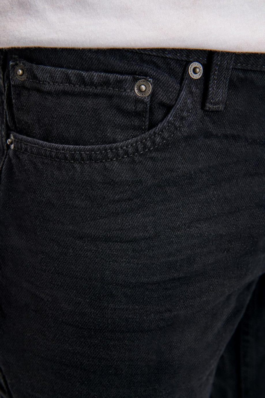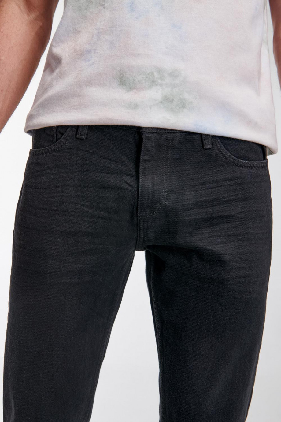 Jean para hombre, 5 bolsillos, tiro bajo ajuste semi recto con lavado negro.