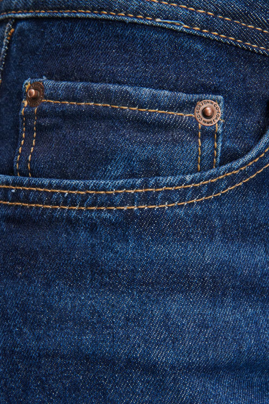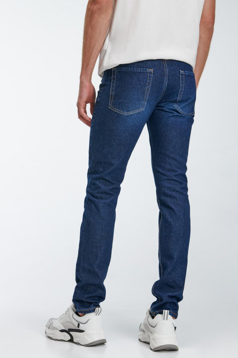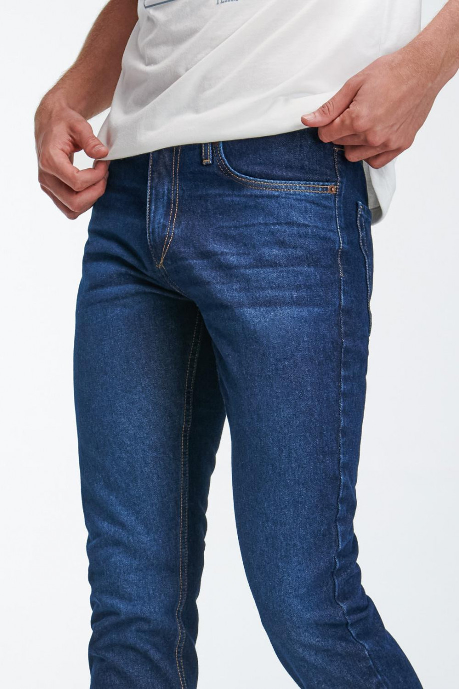 Jean para hombre, 5 bolsillos, tiro bajo ajuste semi recto con lavado azul oscuro.