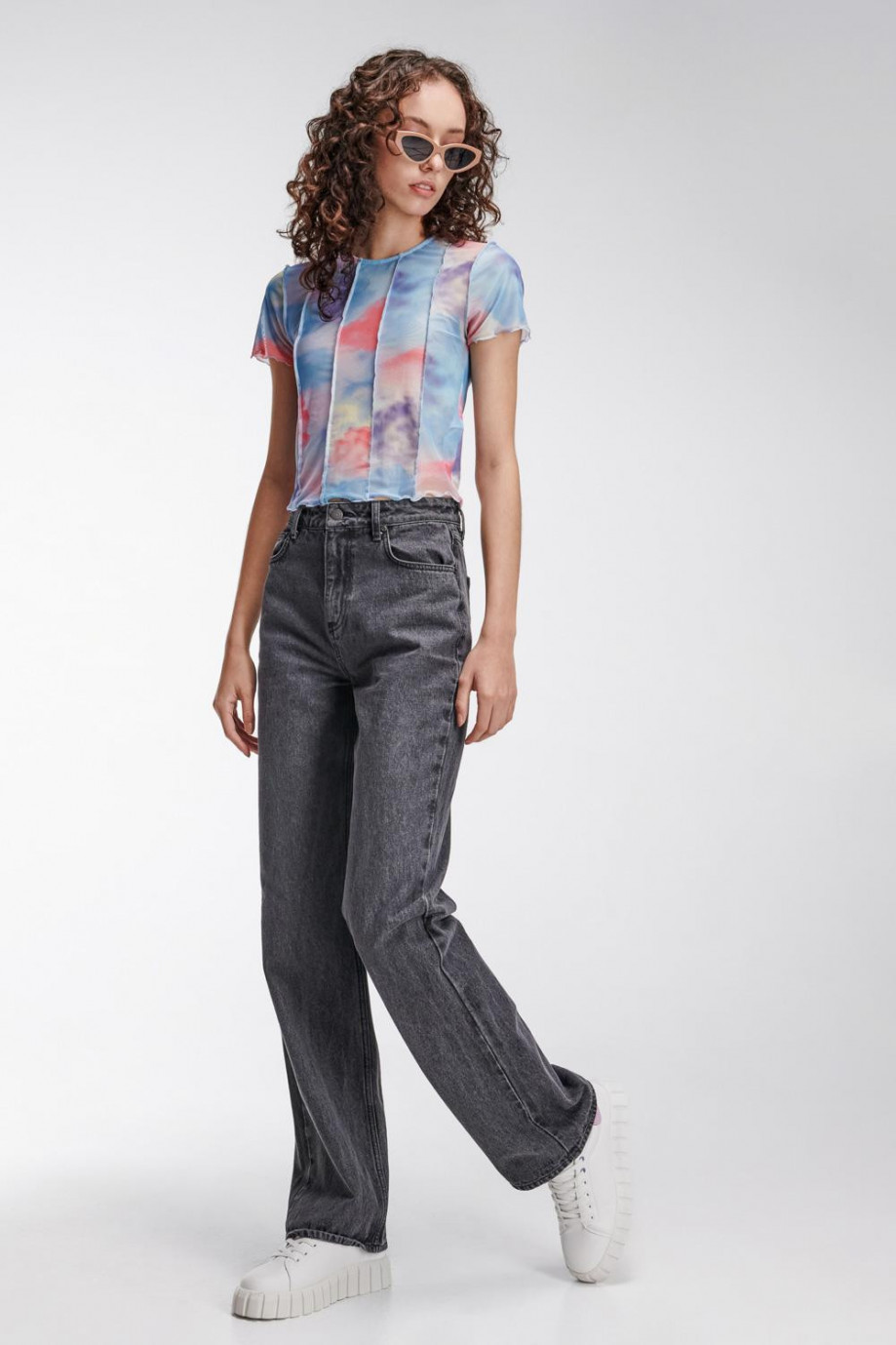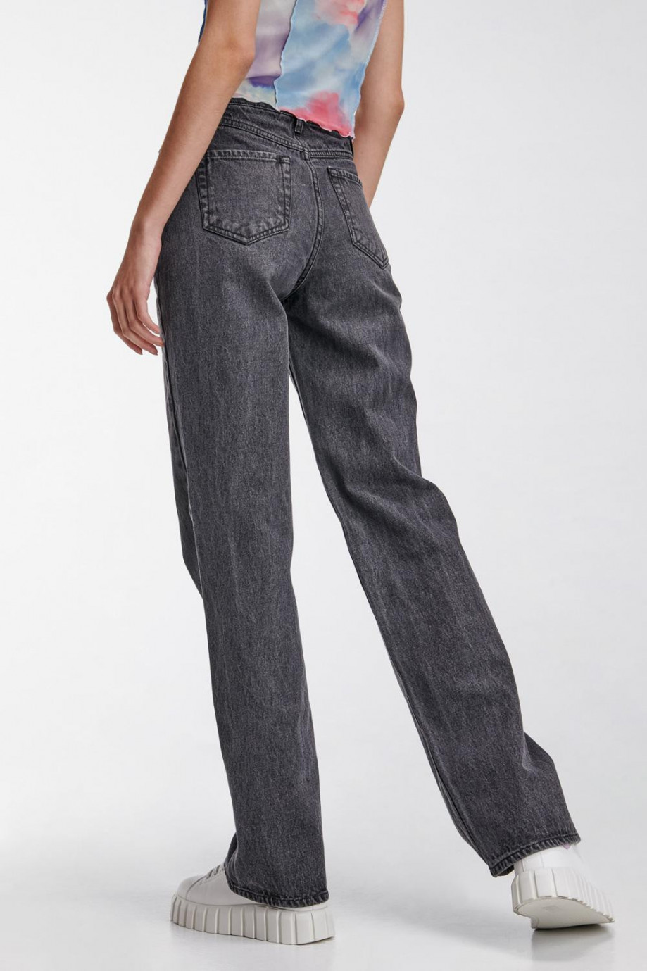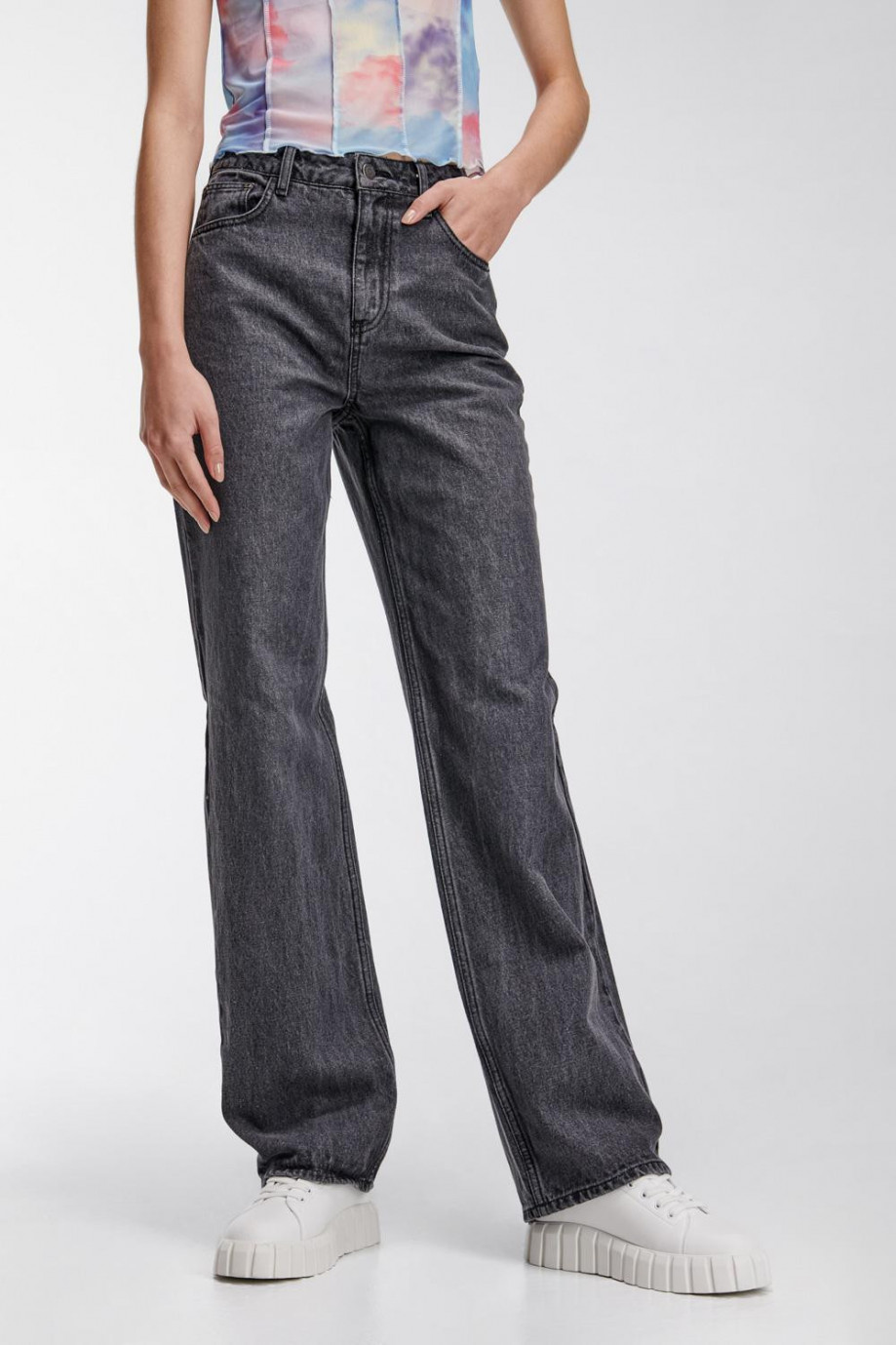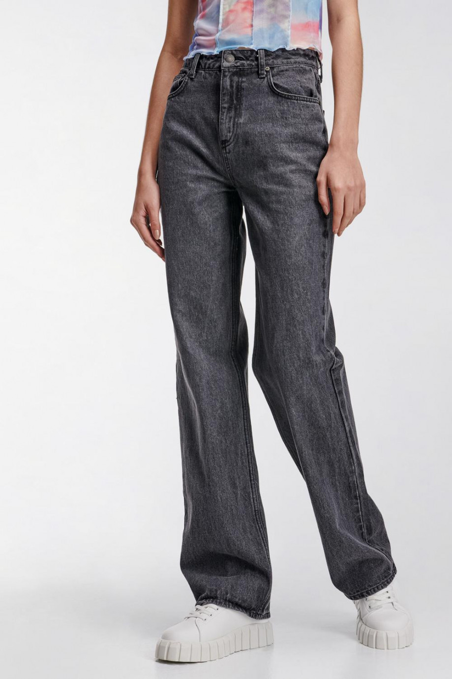Jean para mujer, 5 bolsillos, tiro alto, lavado en negro sólido.