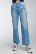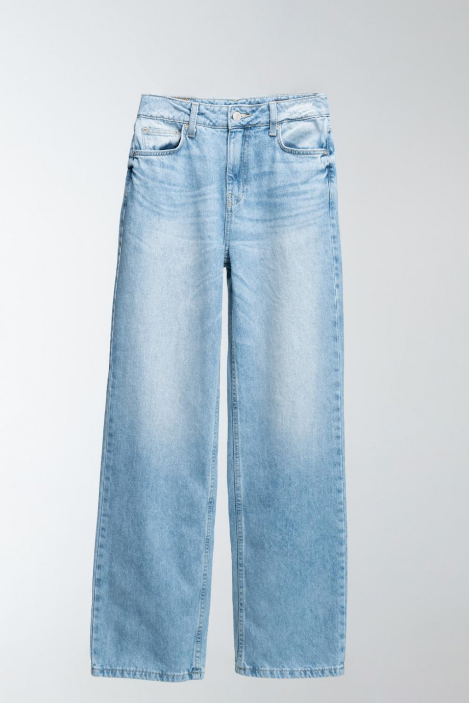 Jean para mujer, 5 bolsillos, tiro alto, lavado con rotos color azul muy claro.