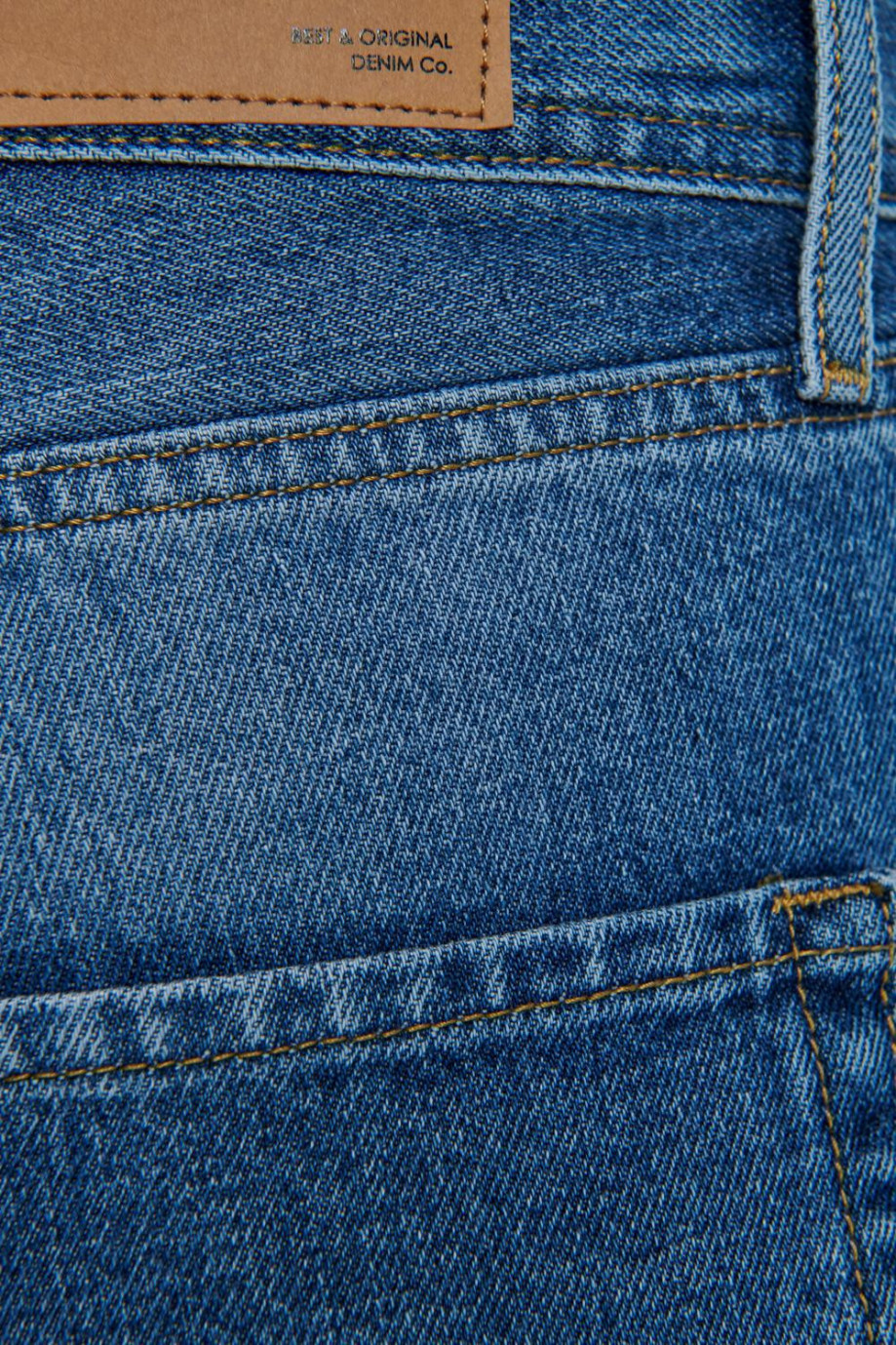 Jean para hombre, 5 bolsillos, tiro bajo ajuste semi recto con lavado azul medio.