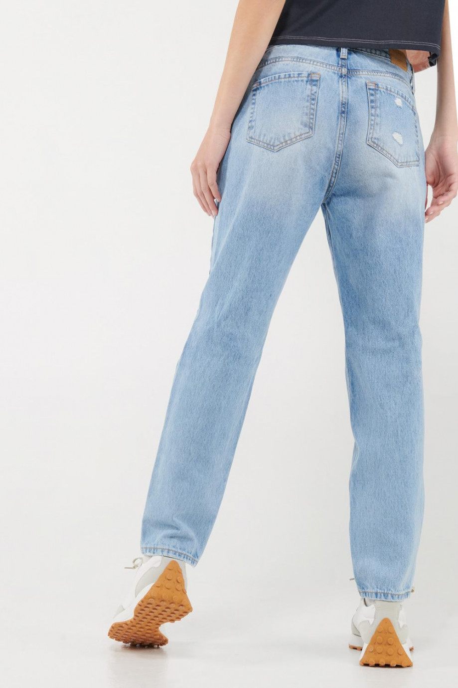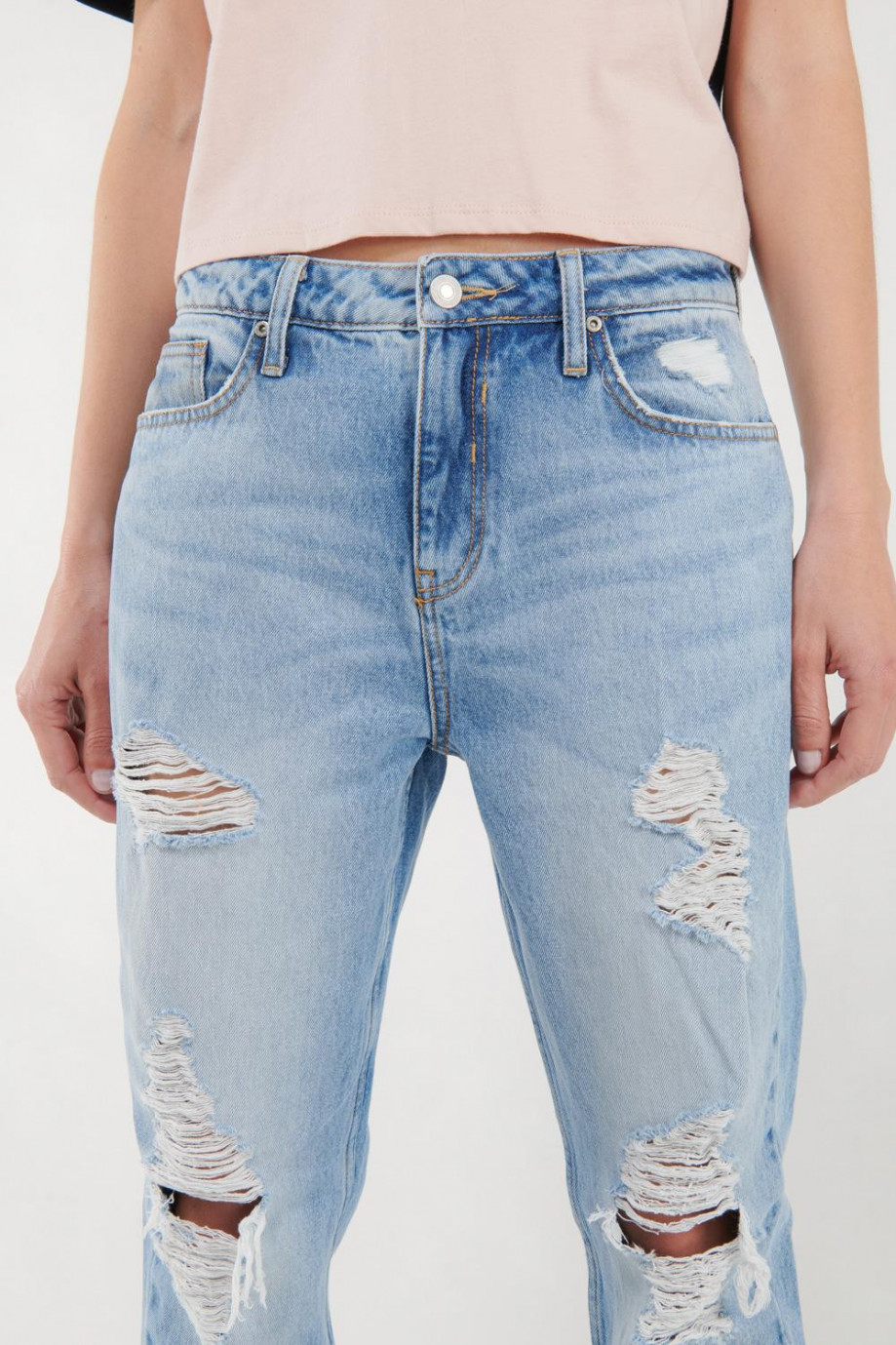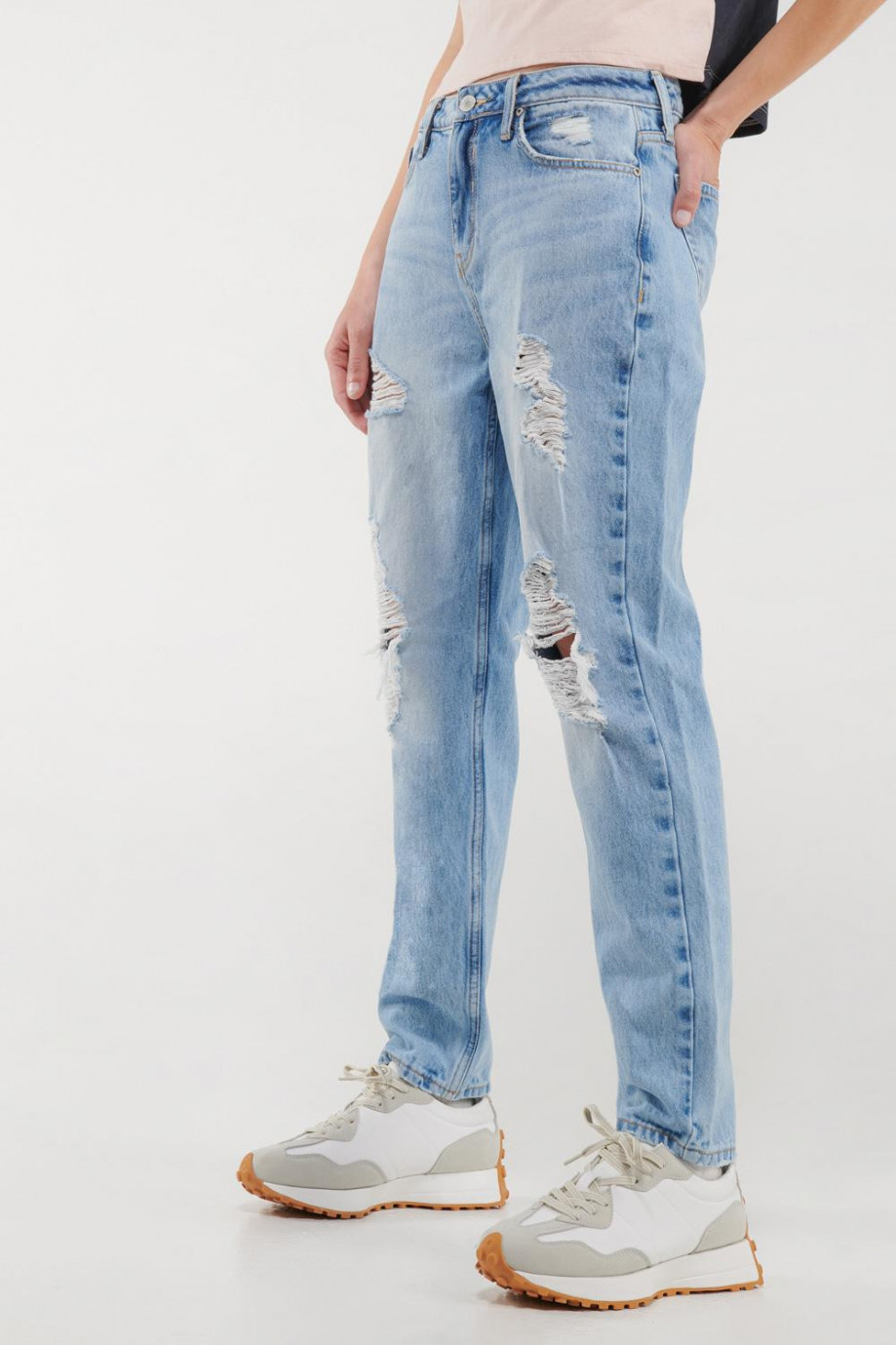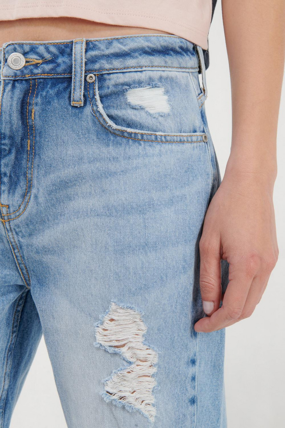 Jean para mujer, 5 bolsillos, tiro alto con lavado muy claro.