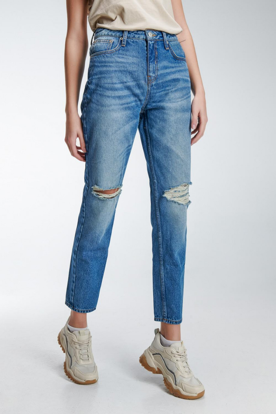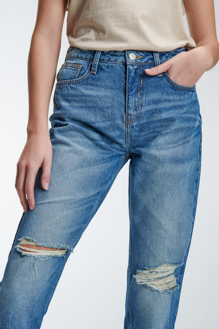 Jean para mujer, 5 bolsillos, tiro alto con lavado azul claro.