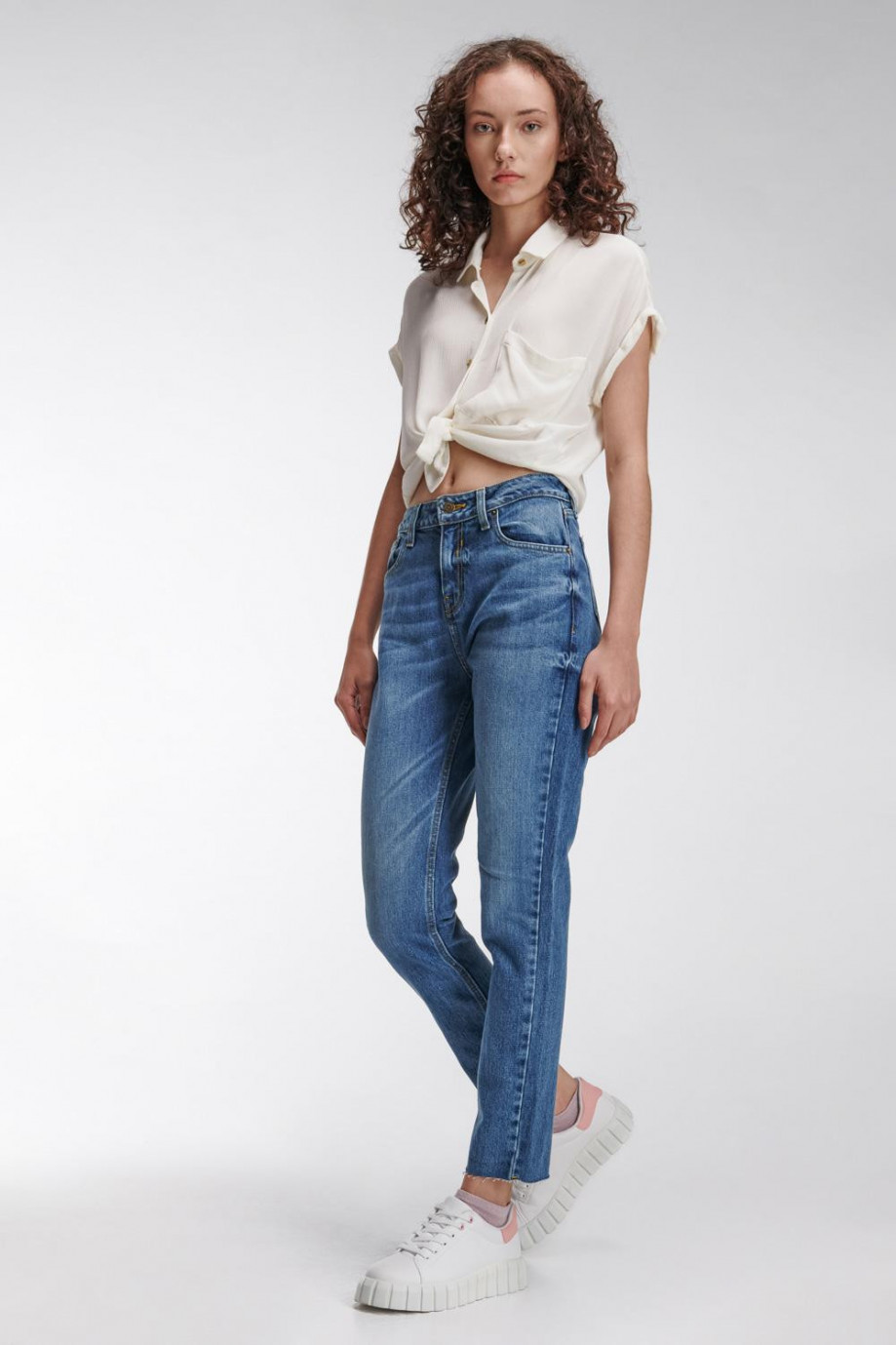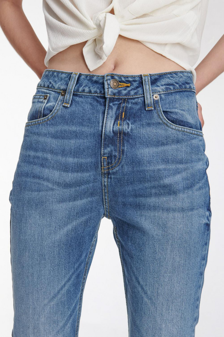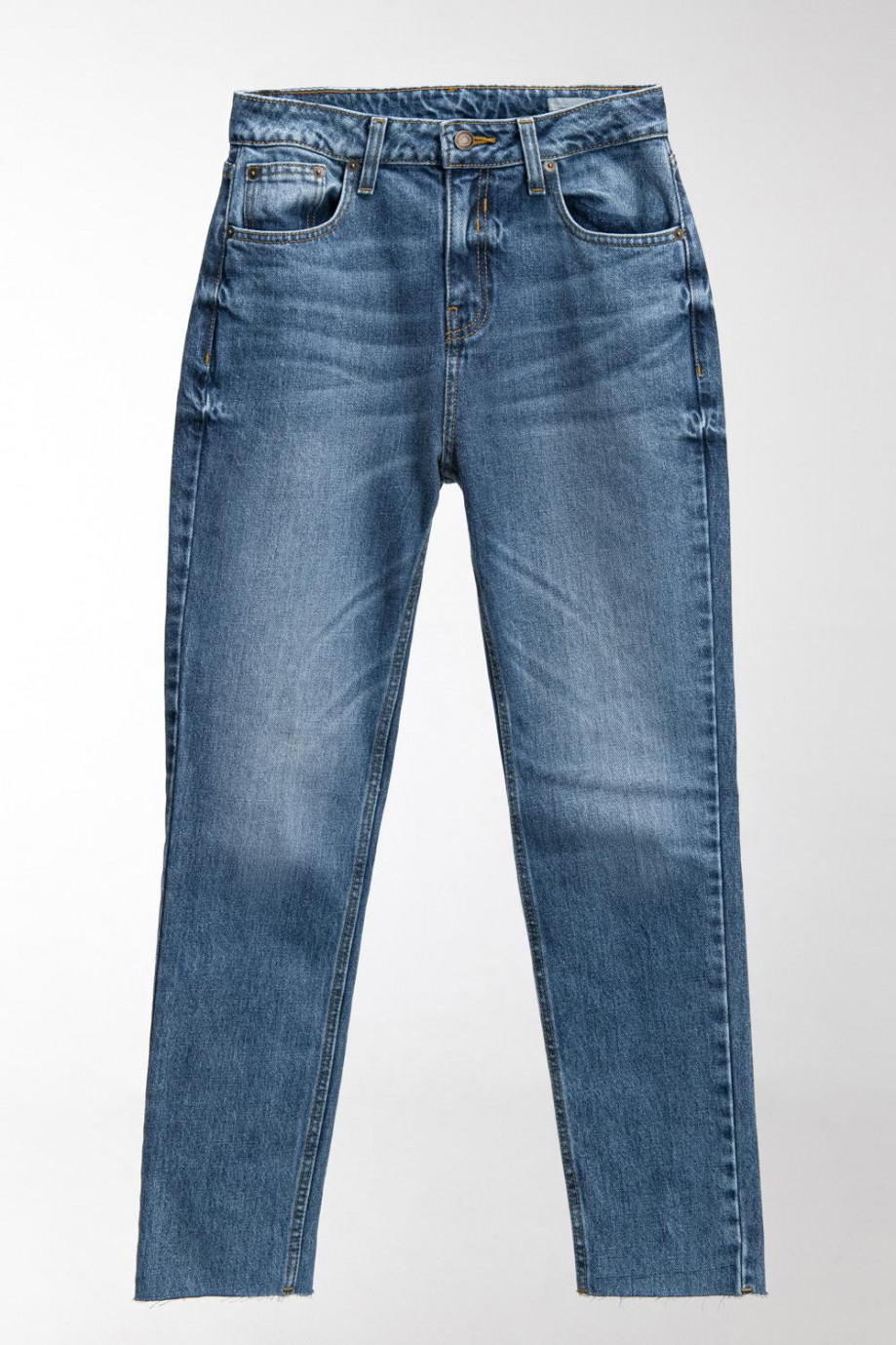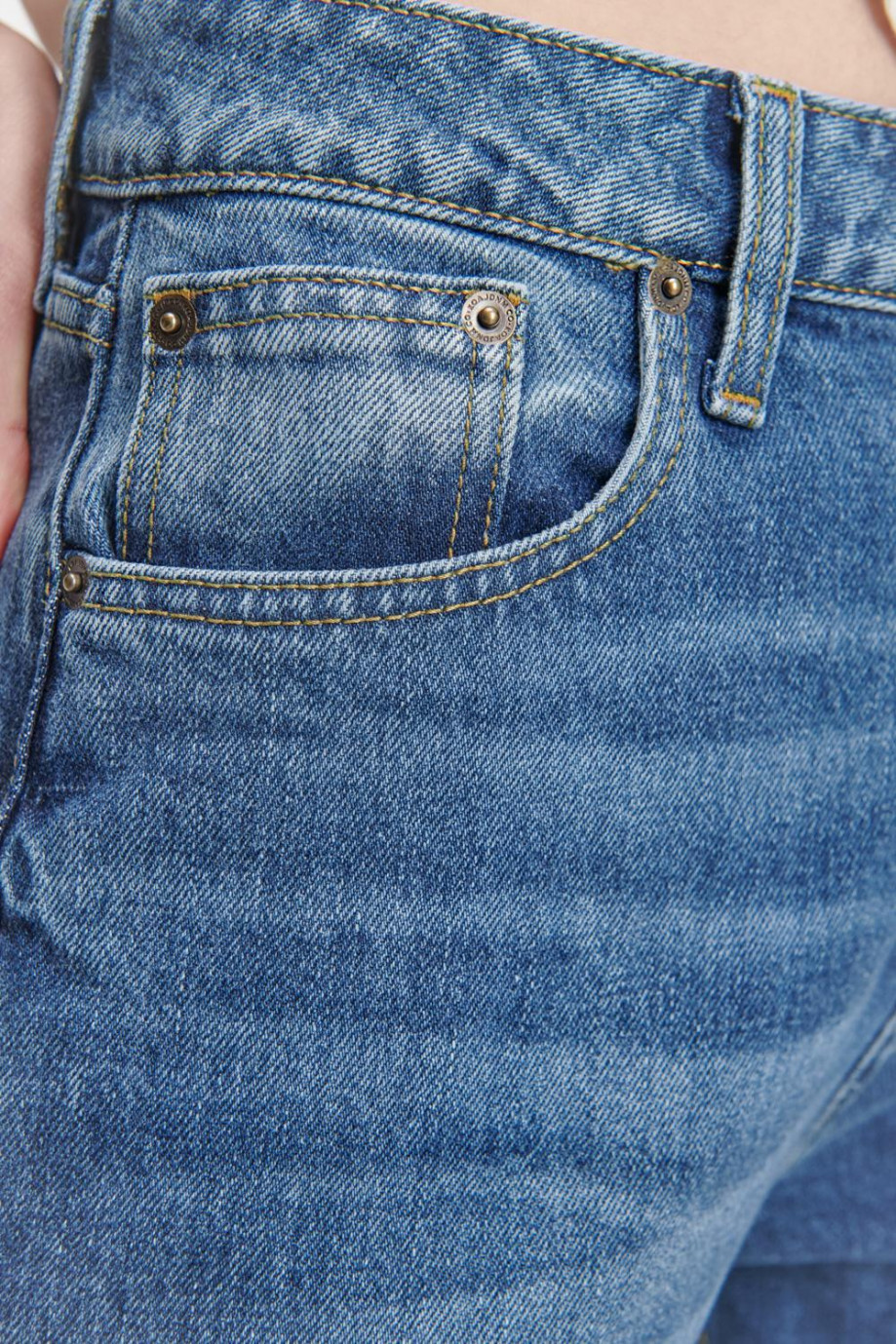 Jean para mujer, 5 bolsillos, tiro alto con lavado medio.