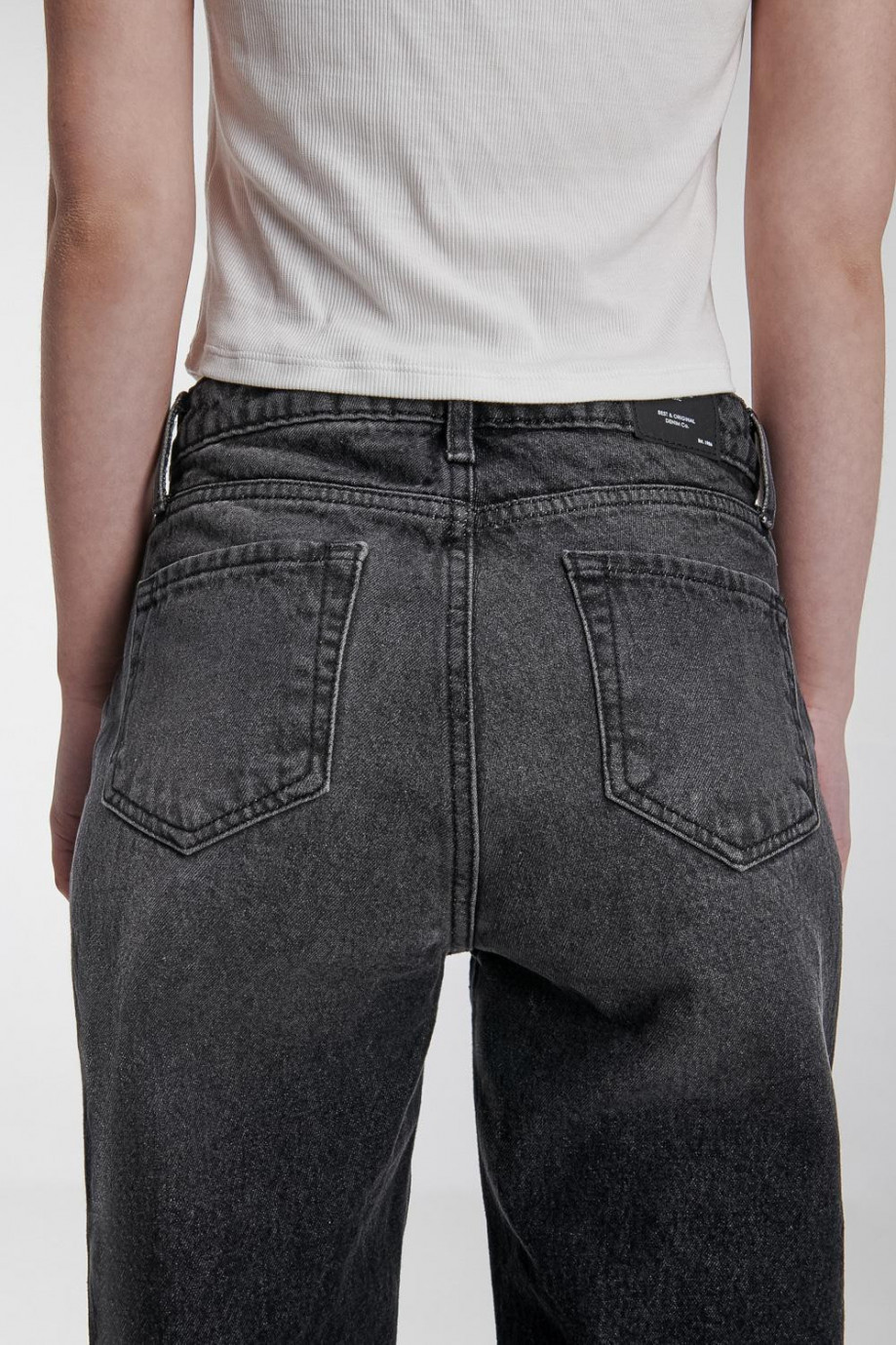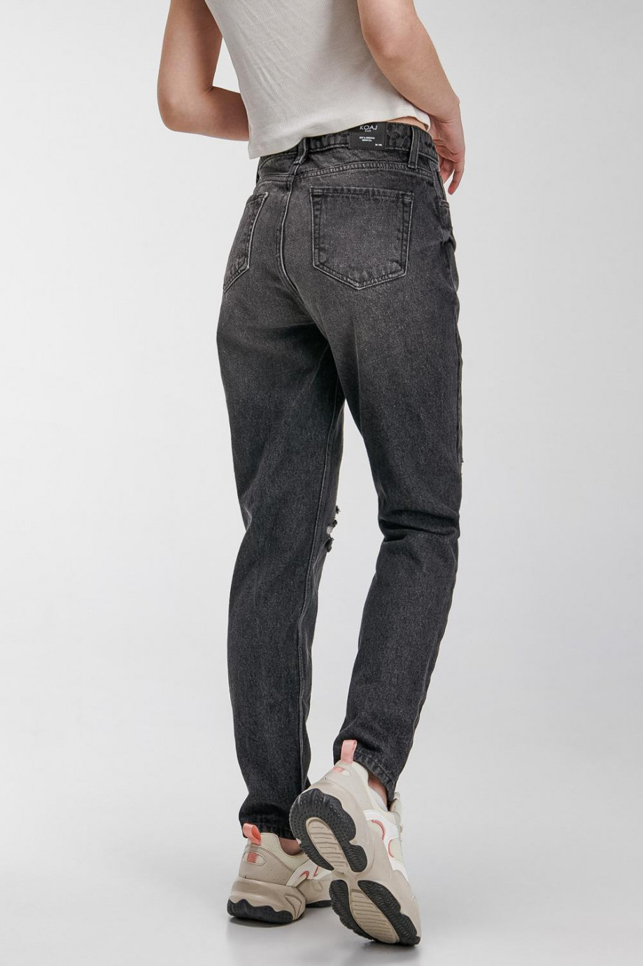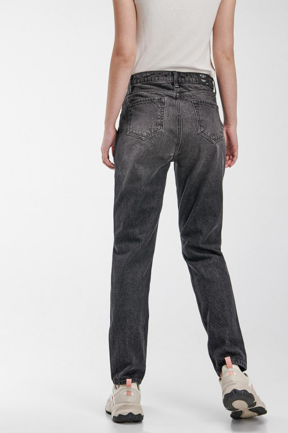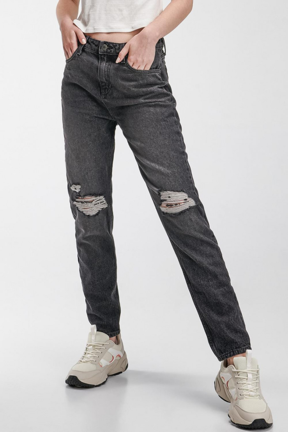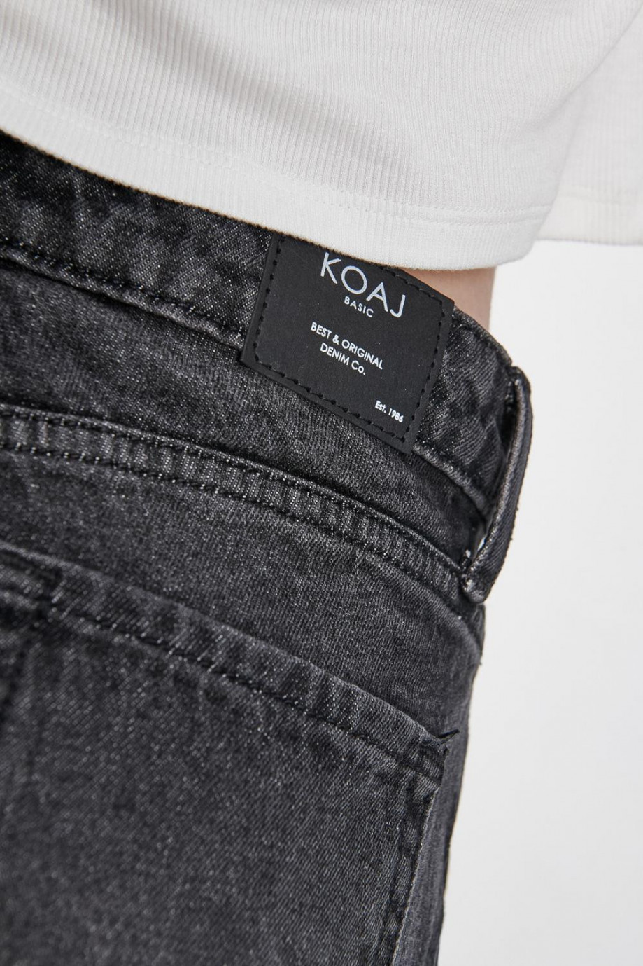 Jean para mujer, 5 bolsillos, tiro alto con lavado gris.