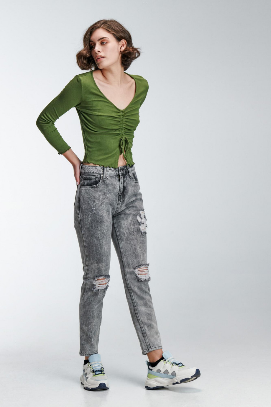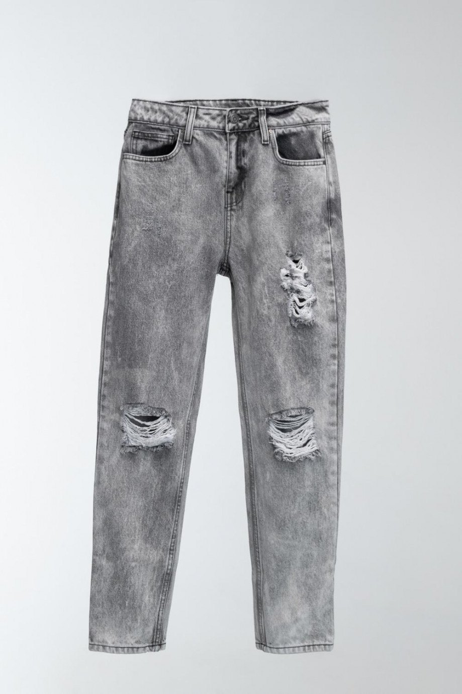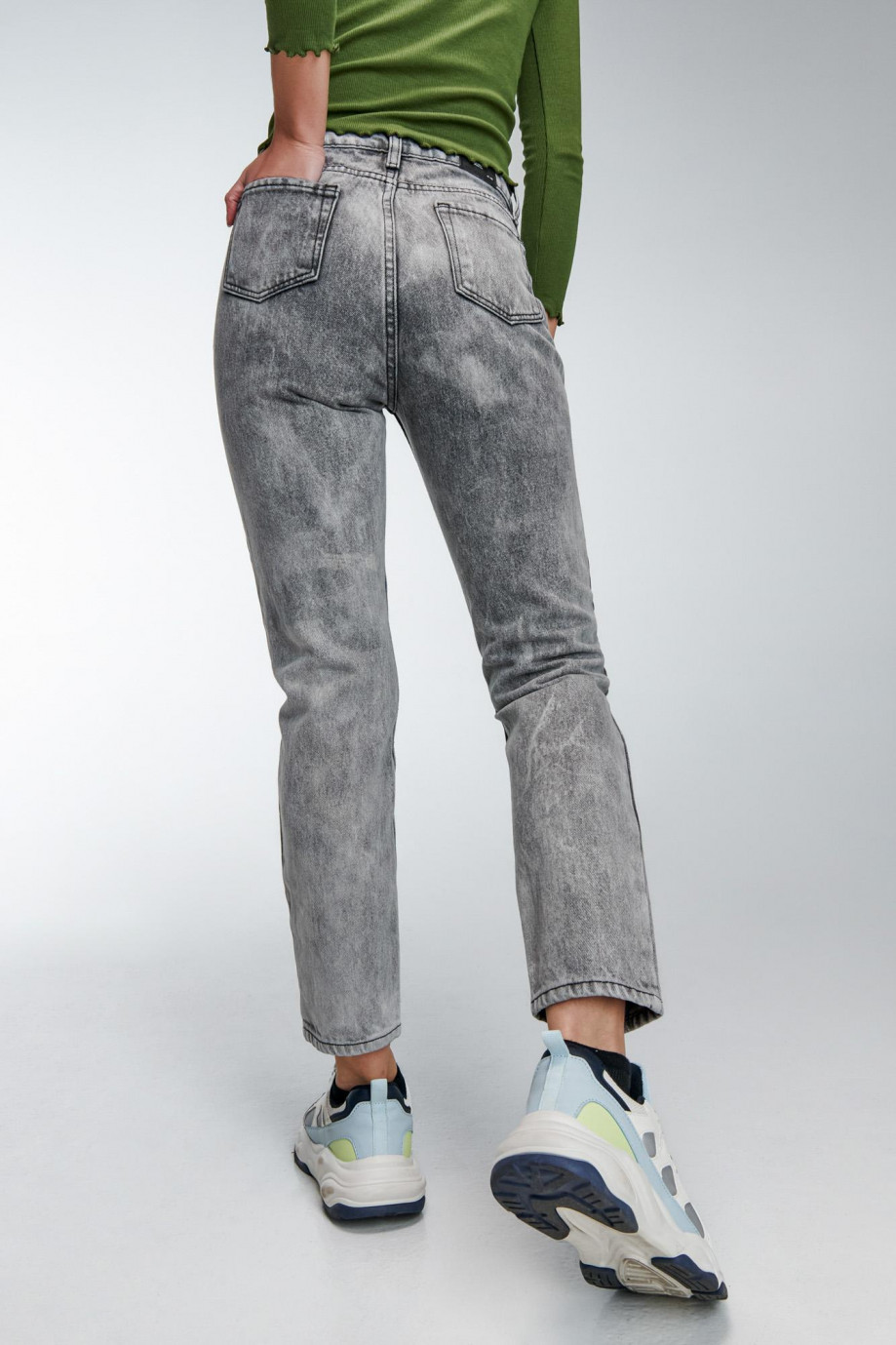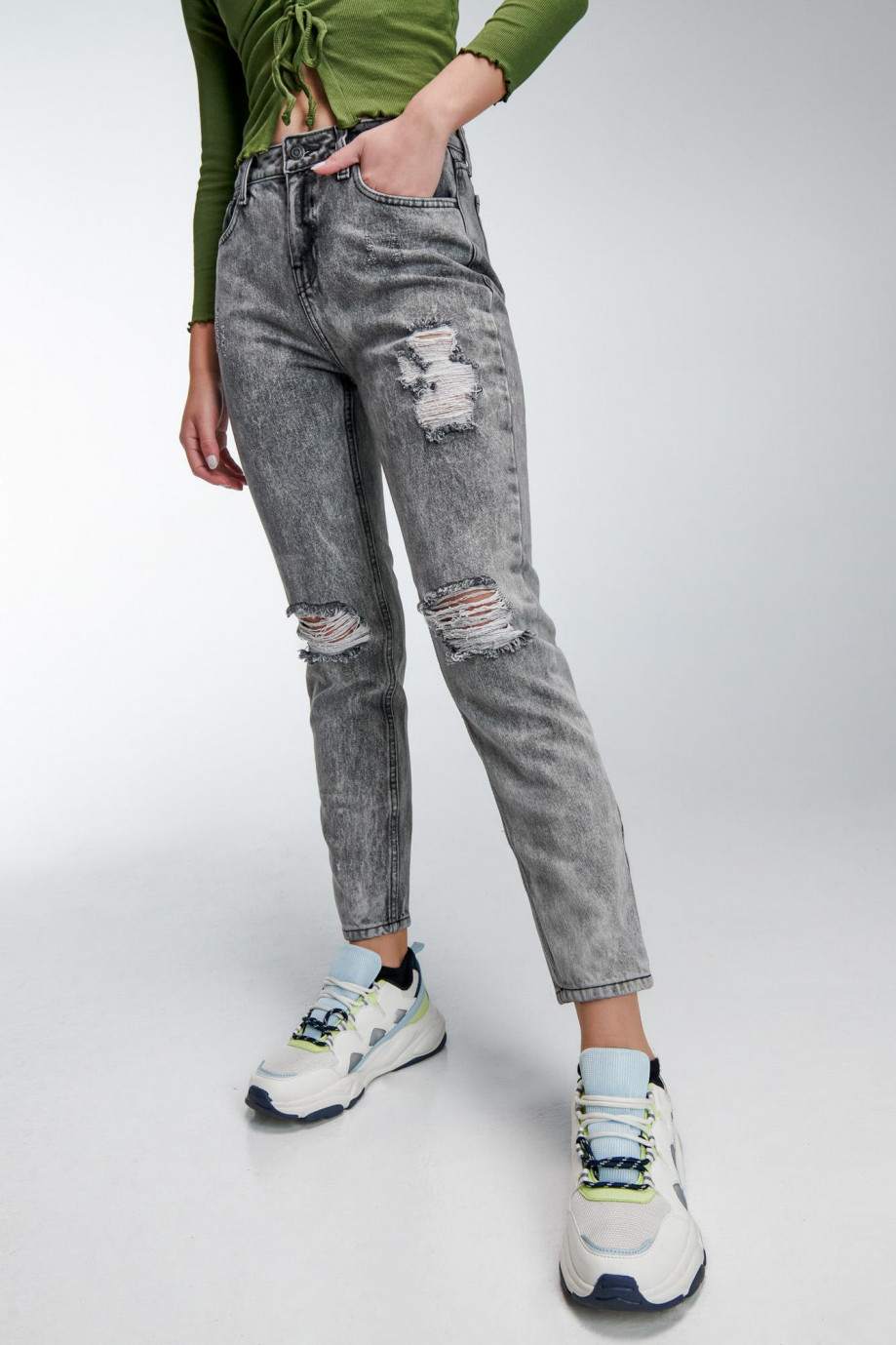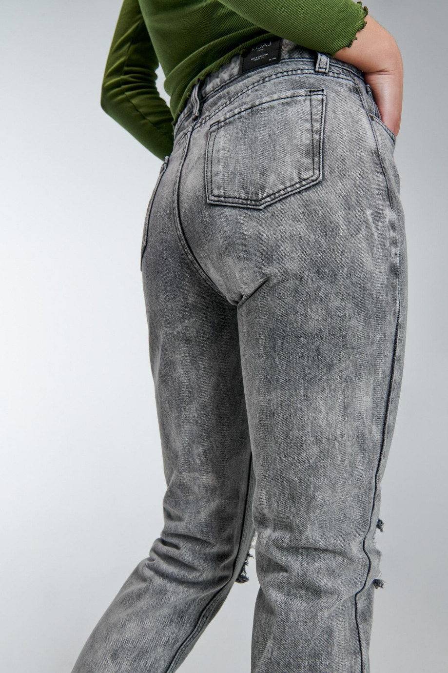 Jean para mujer, 5 bolsillos, tiro alto con lavado gris.