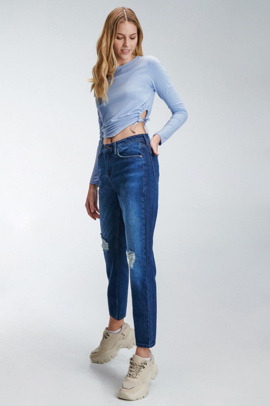 Jean para mujer, 5 bolsillos, tiro alto con lavado Oscuro.
