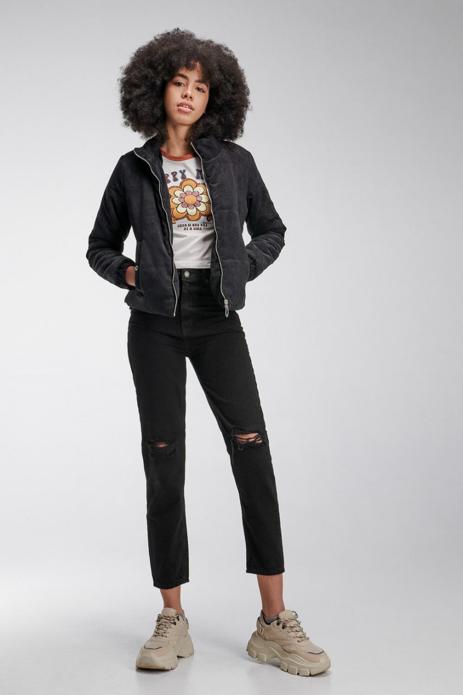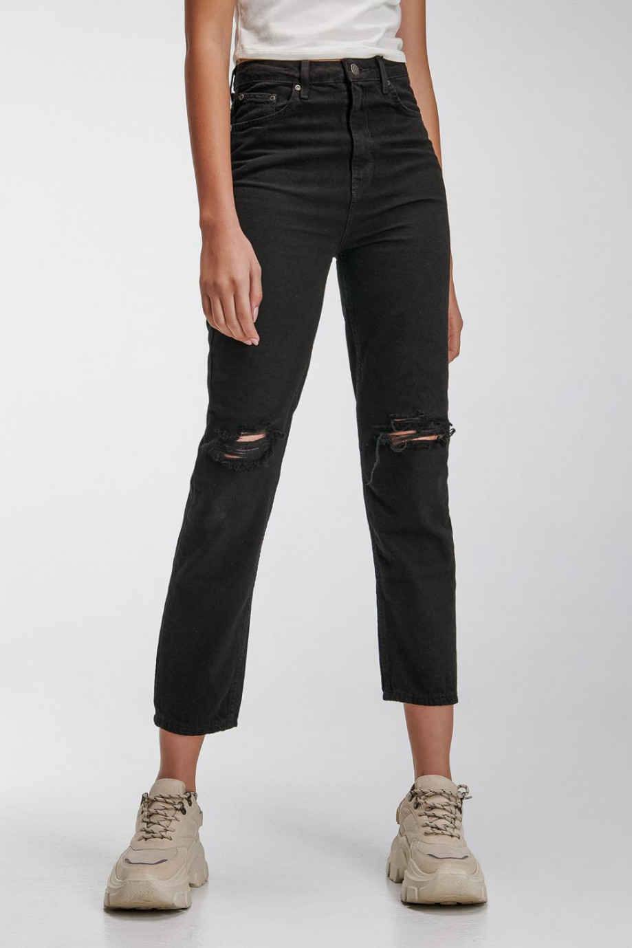 Jean mom fit para mujer, 5 bolsillos, super tiro alto, con proceso negro.