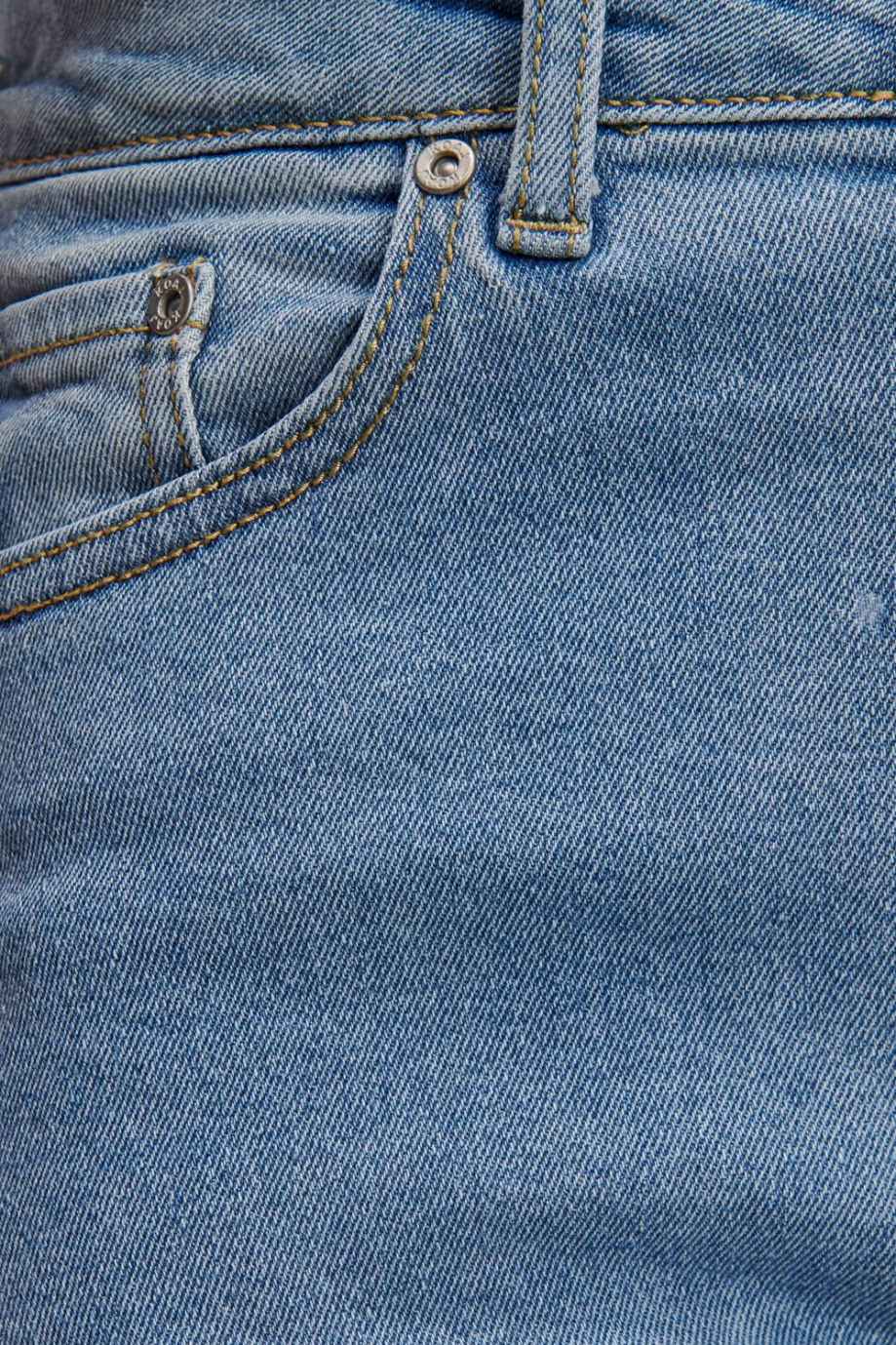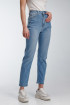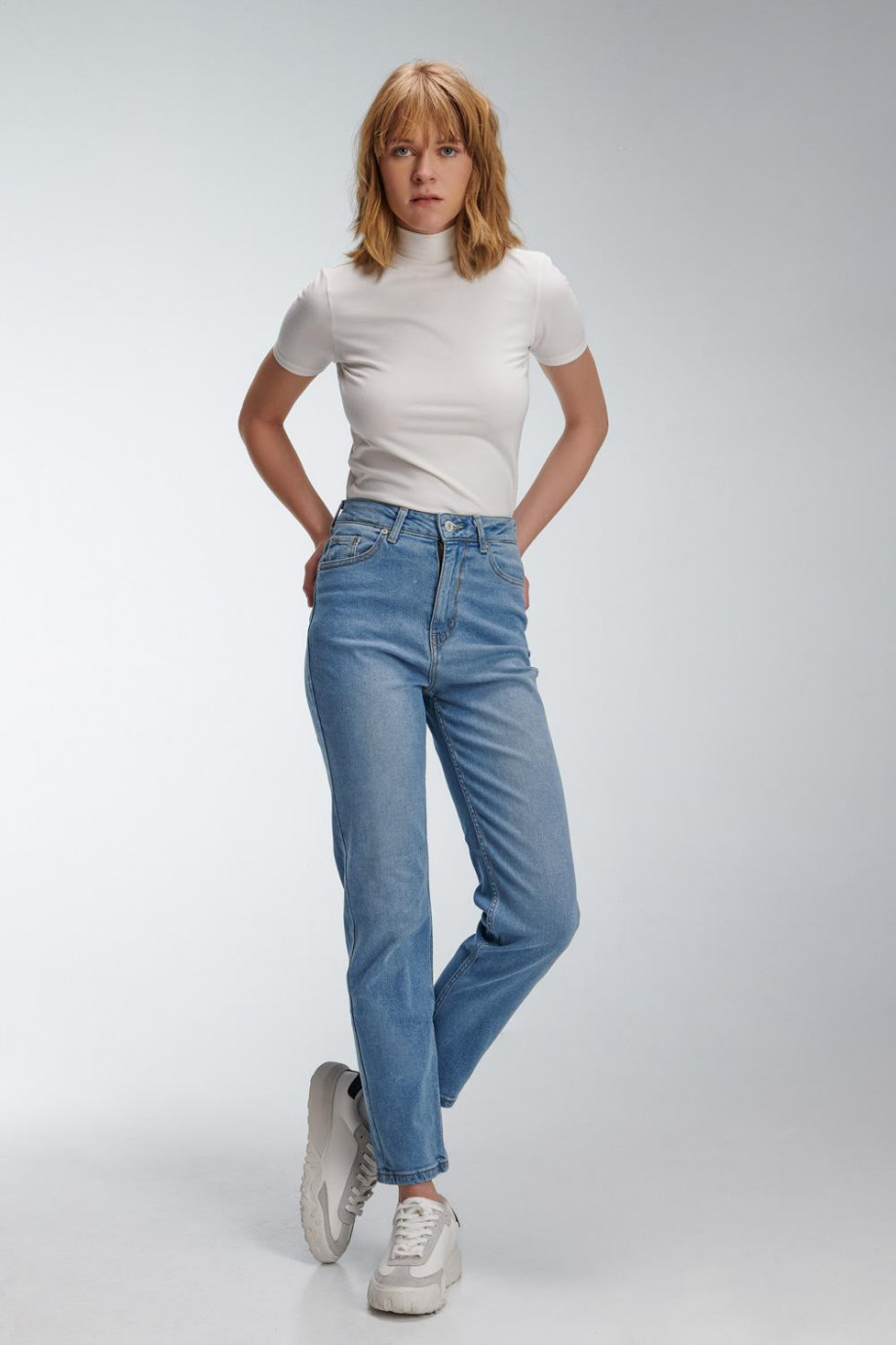 Jean mom fit para mujer, 5 bolsillos, super tiro alto, con proceso azul muy claro.