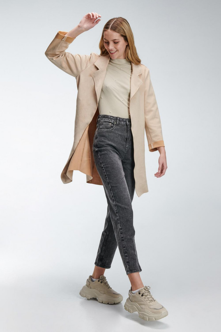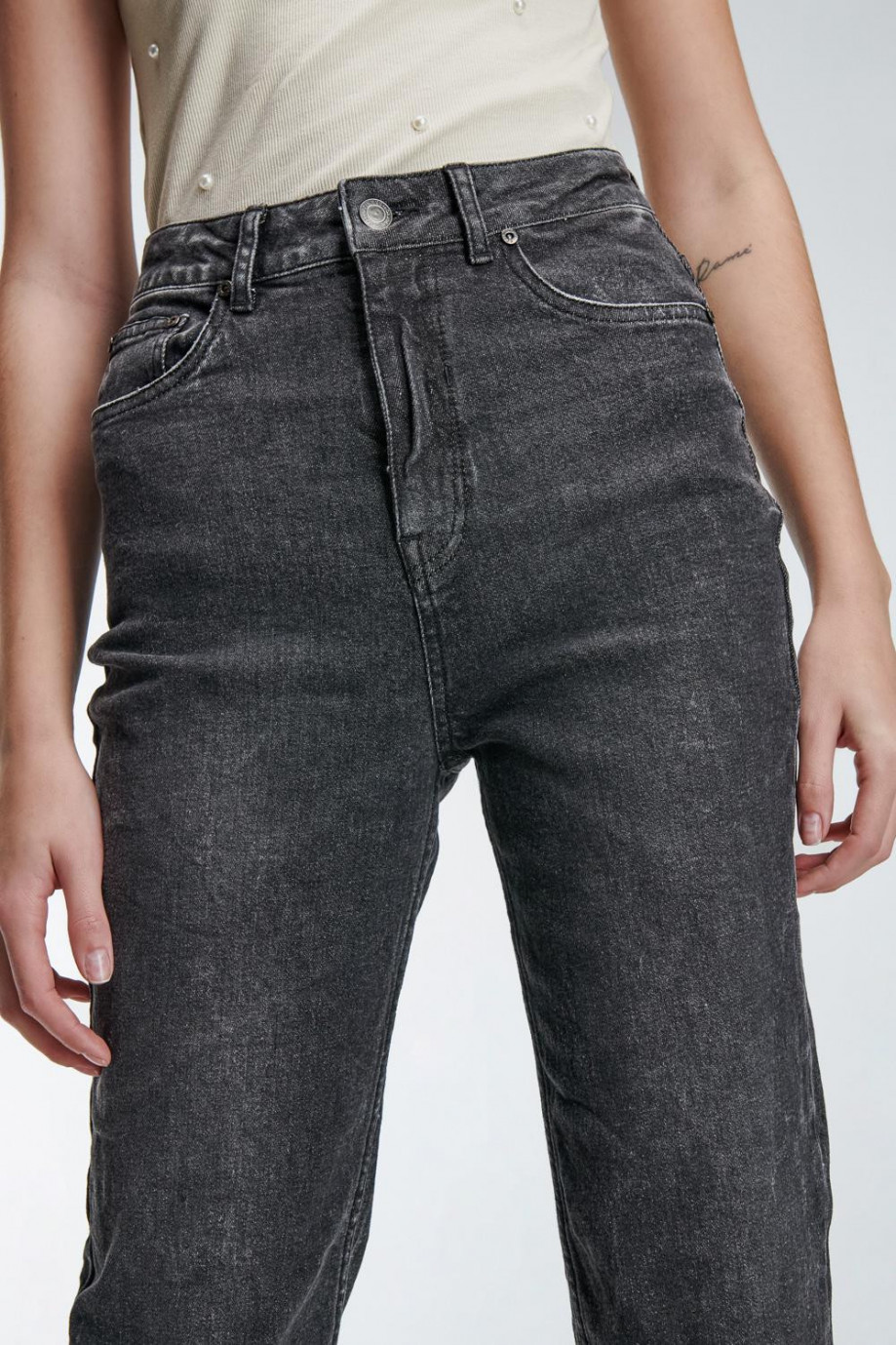 Jean mom fit para mujer, 5 bolsillos, super tiro alto, con proceso gris