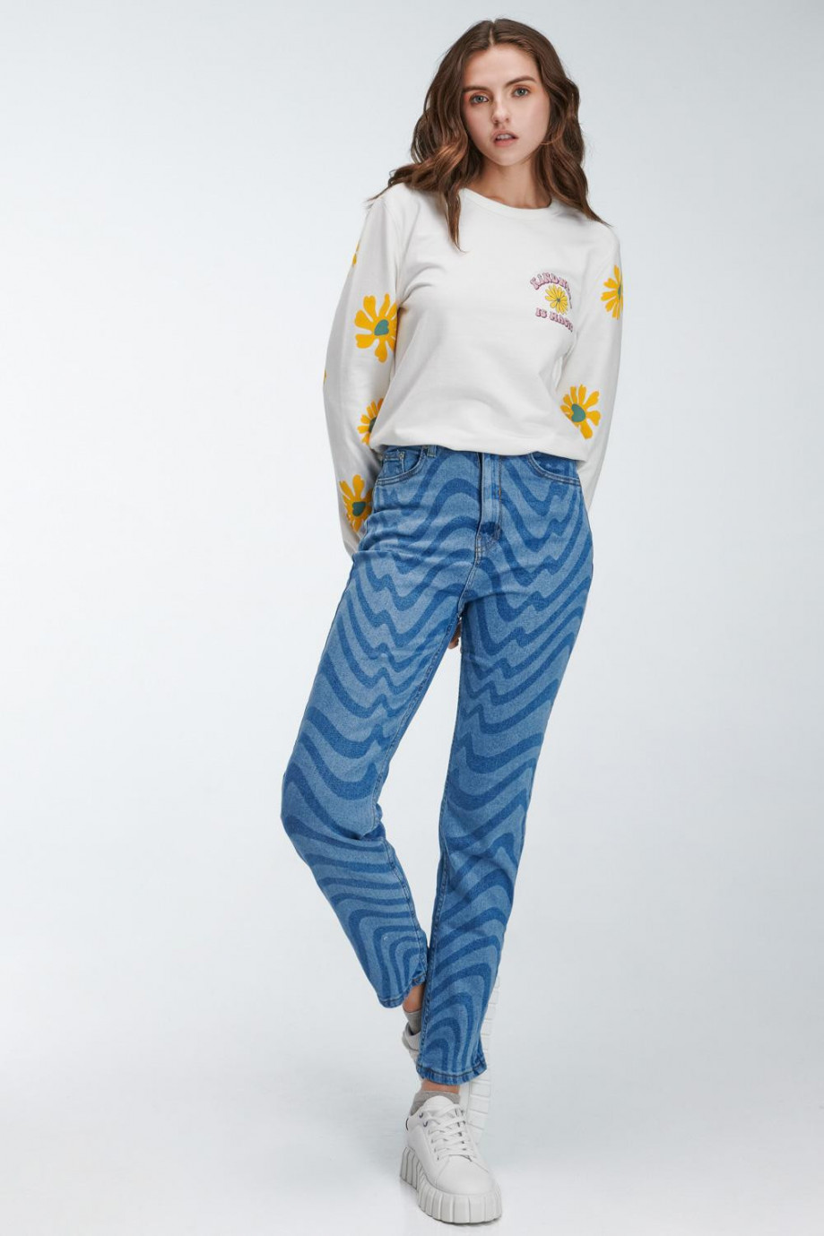 Jean mom fit para mujer, 5 bolsillos, super tiro alto, con proceso azul muy claro.