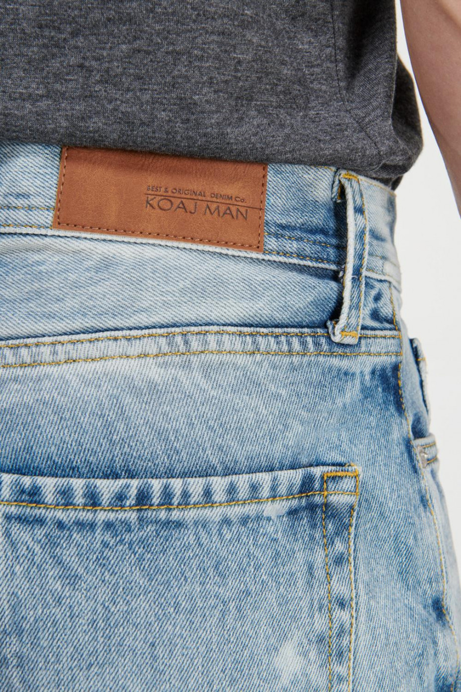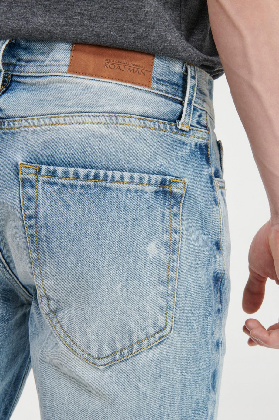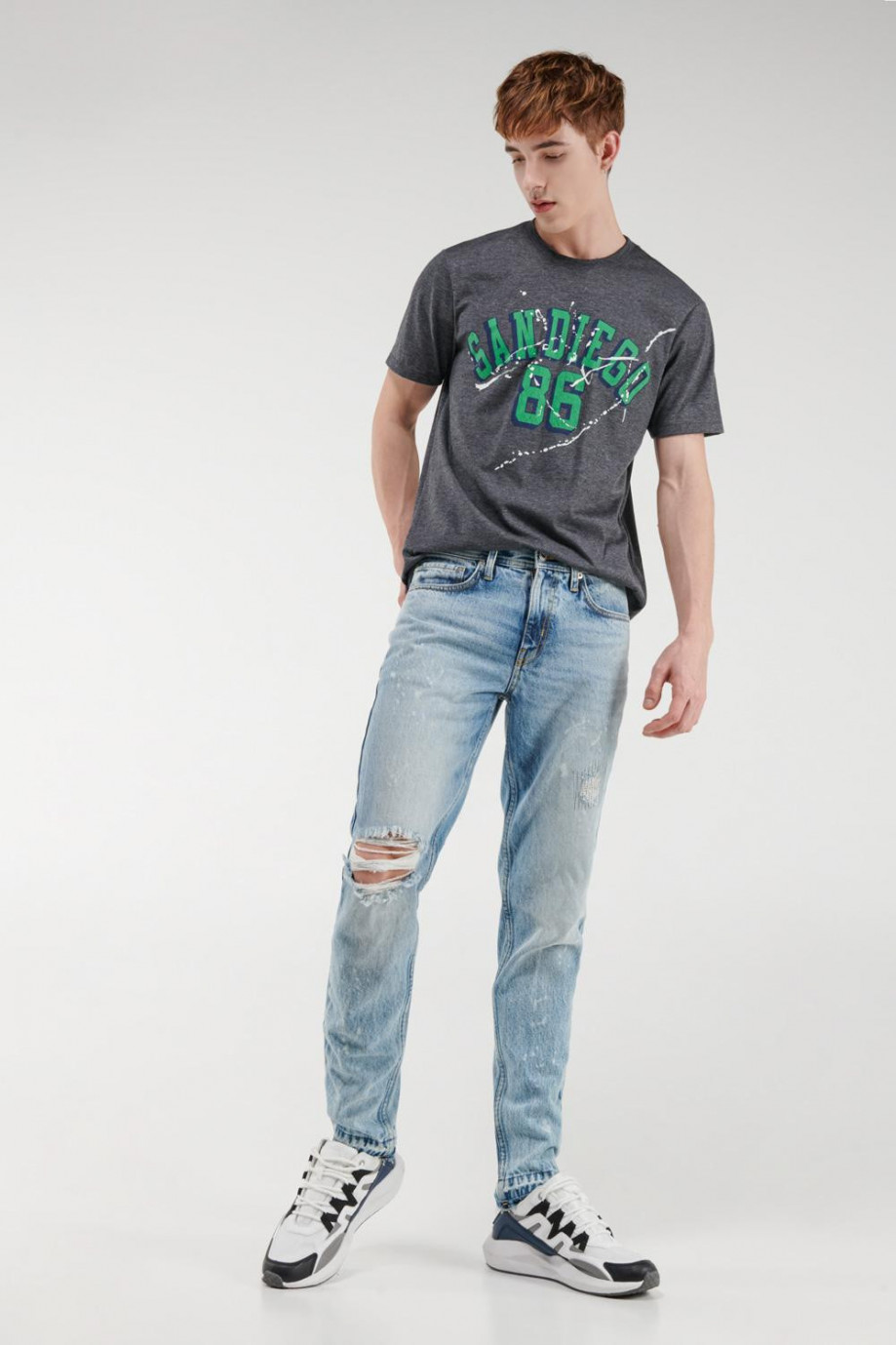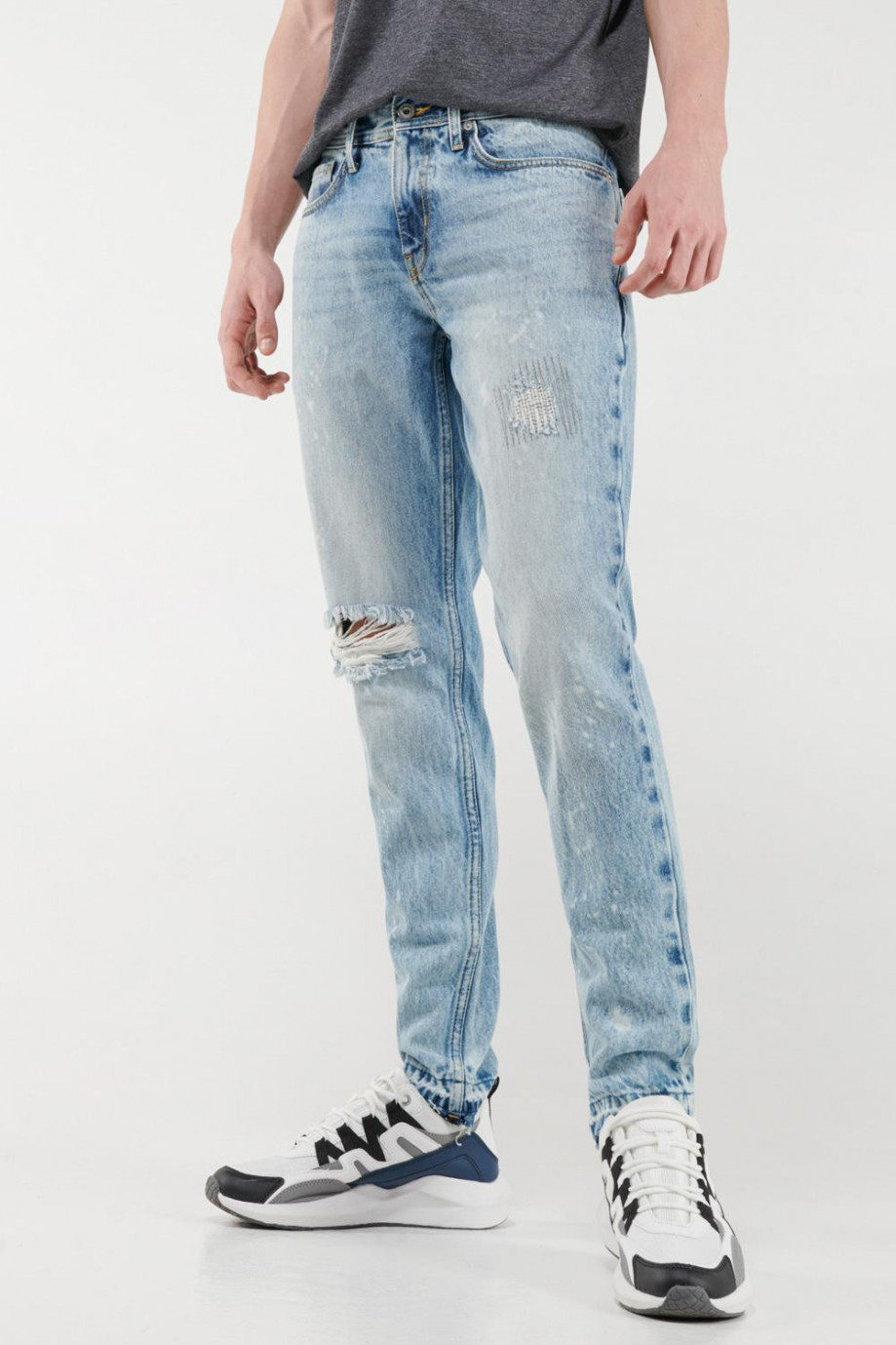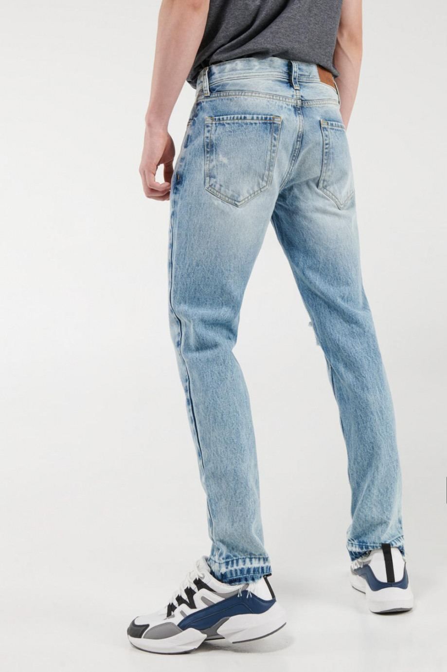 Jean para hombre, en denim, 5 bolsillos, tiro bajo, con proceso de lavado, costura effeci laser y rotos.